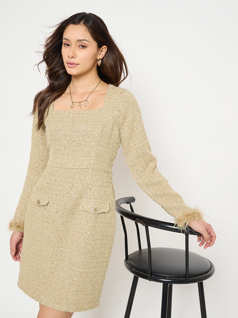 Madame Square Neck Beige Bodycon Dress with Feather Trim Sleeves