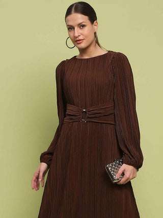 Madame Pleated Front Buckle Detailed Solid Chocolate Maxi Dress