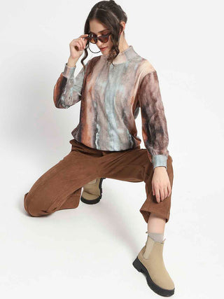 Madame Marble Print Full Sleeve Mock Neck Brown Top
