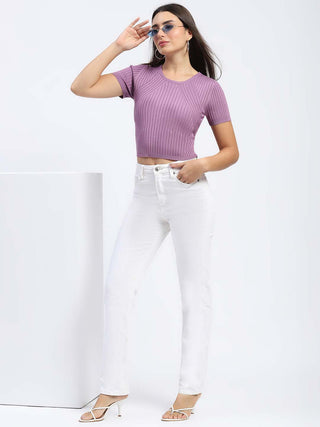 Madame Ribbed Round Neck Bodycon Solid Lilac Top