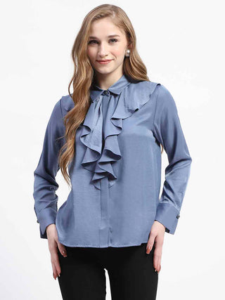 Madame Ruched Waist Wing Necked Solid Beige Cotton Shirt