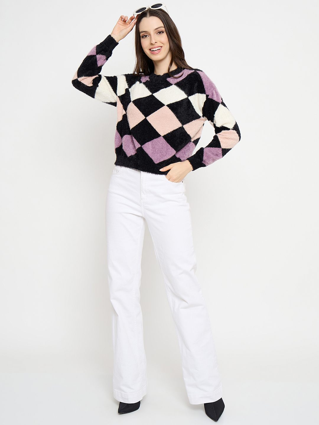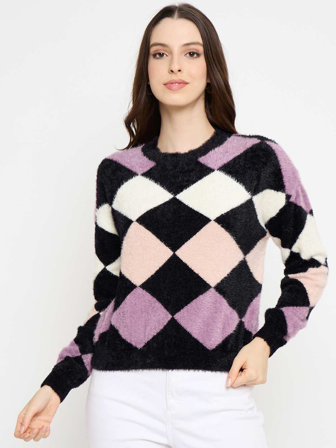 Add a graphic edge to your winter lineup with this bold and contemporary black sweater. It features striking geometric prints that make everyday layering more exciting, perfect for pairing with jeans or skirts.