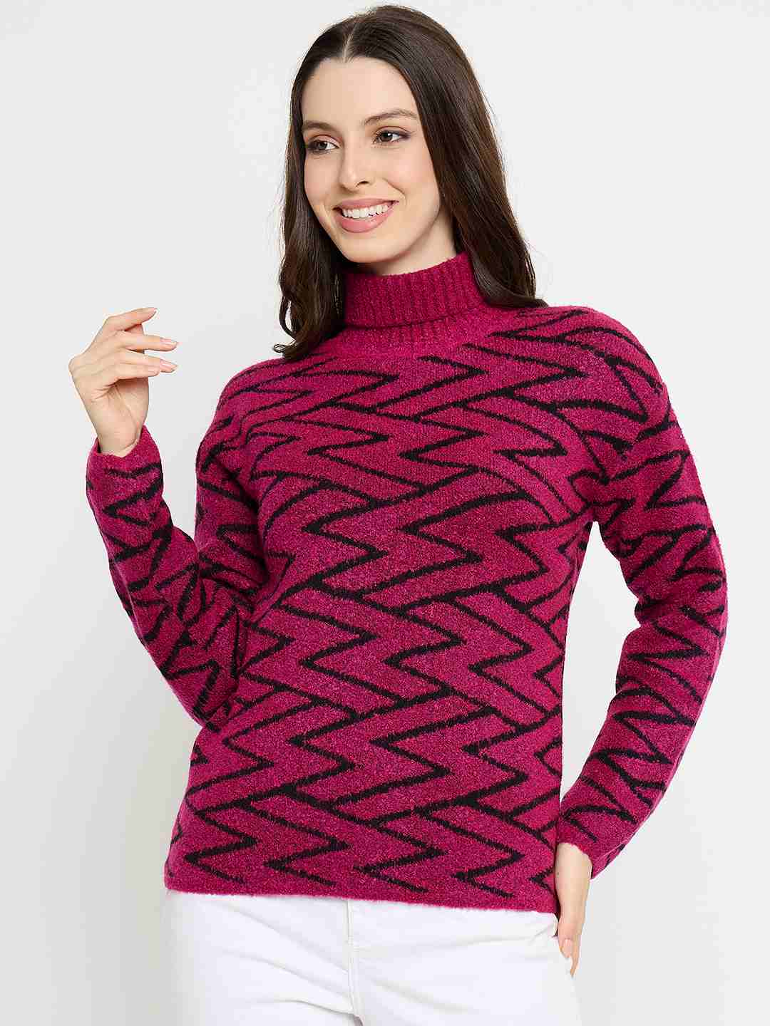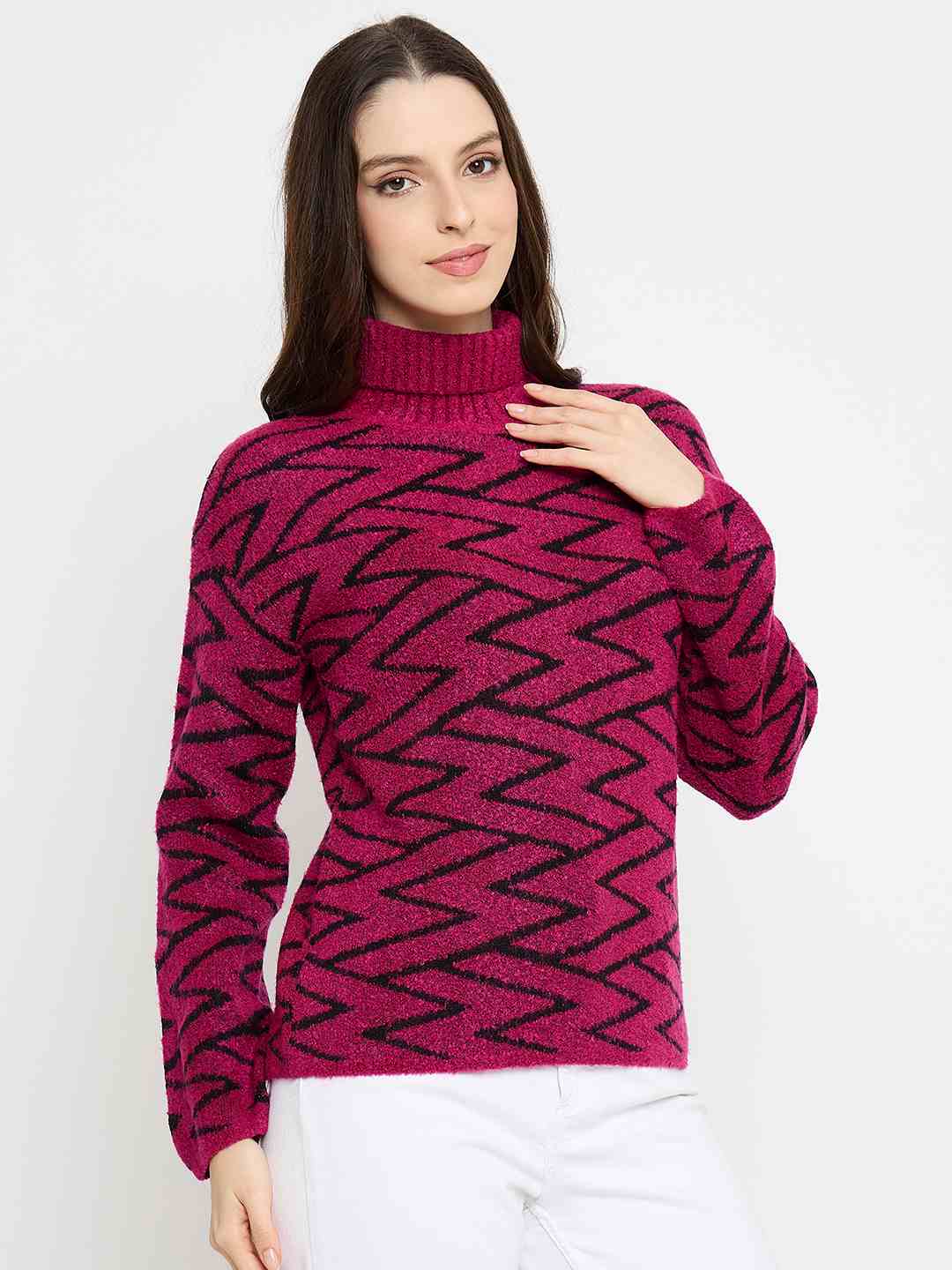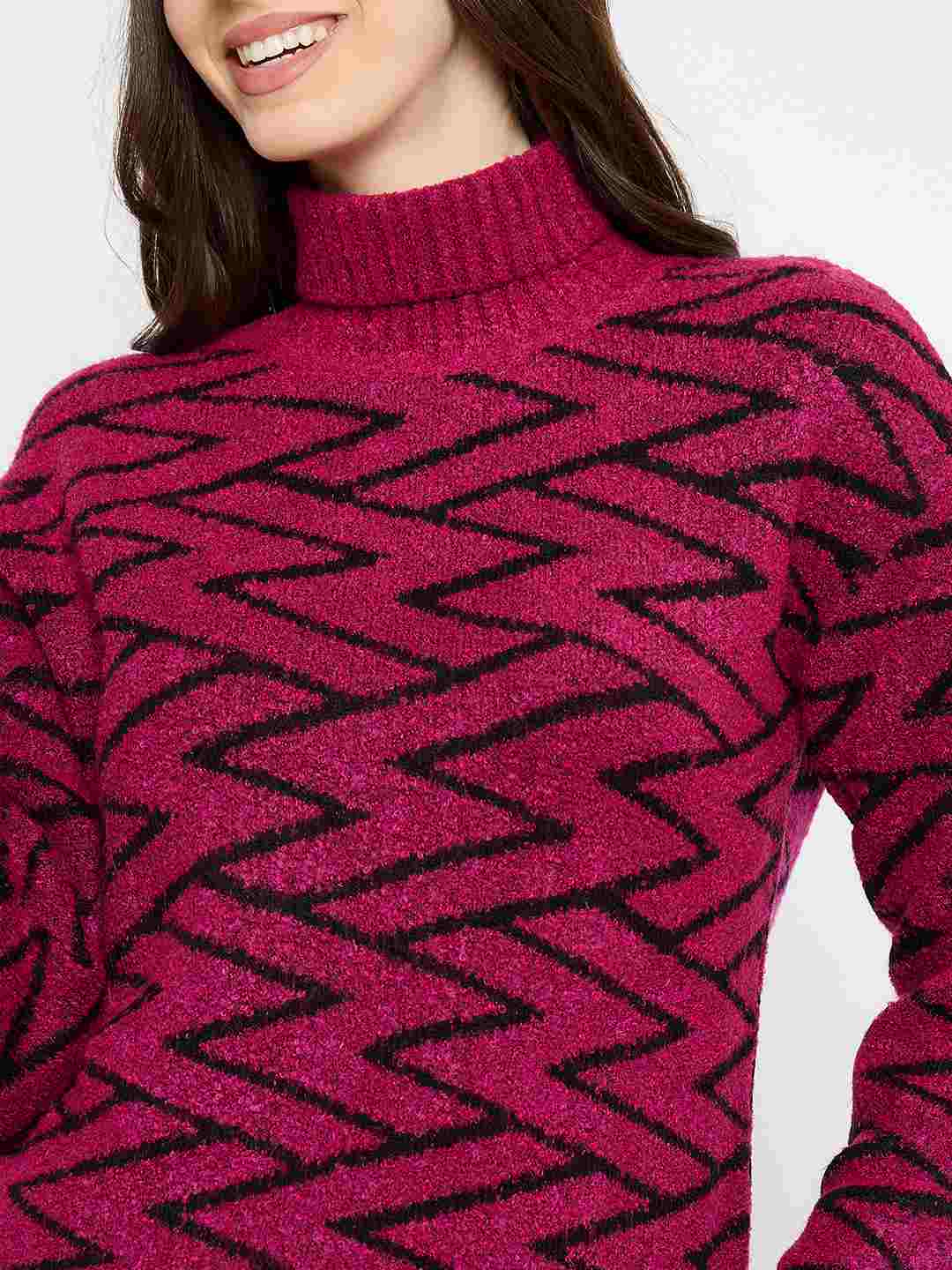Make a fashion-forward statement in this high-neck sweater, which features an eye-catching geometric design. It also pops against a vibrant fuchsia base, perfect for layering or wearing solo to brighten up any outfit.