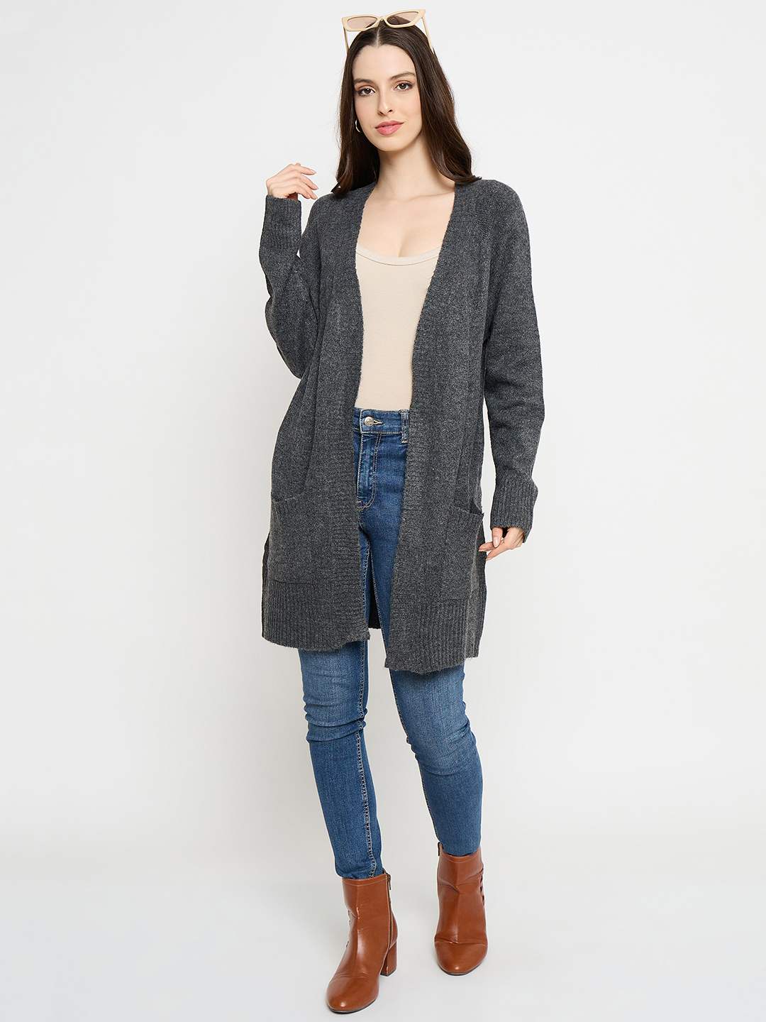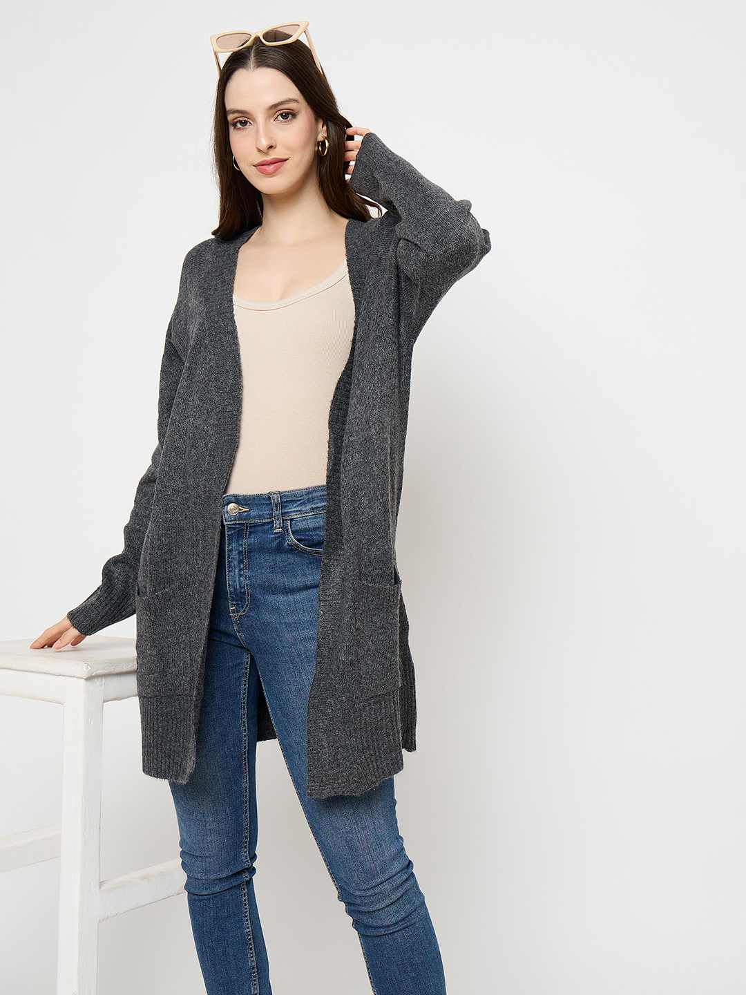 Wrap yourself in this long, open shrug in a rich grey hue that blends warmth with versatility. It is crafted from soft acrylic for a cozy layering effect. Lightweight yet stylish, it elevates any outfit while keeping comfort at the forefront.