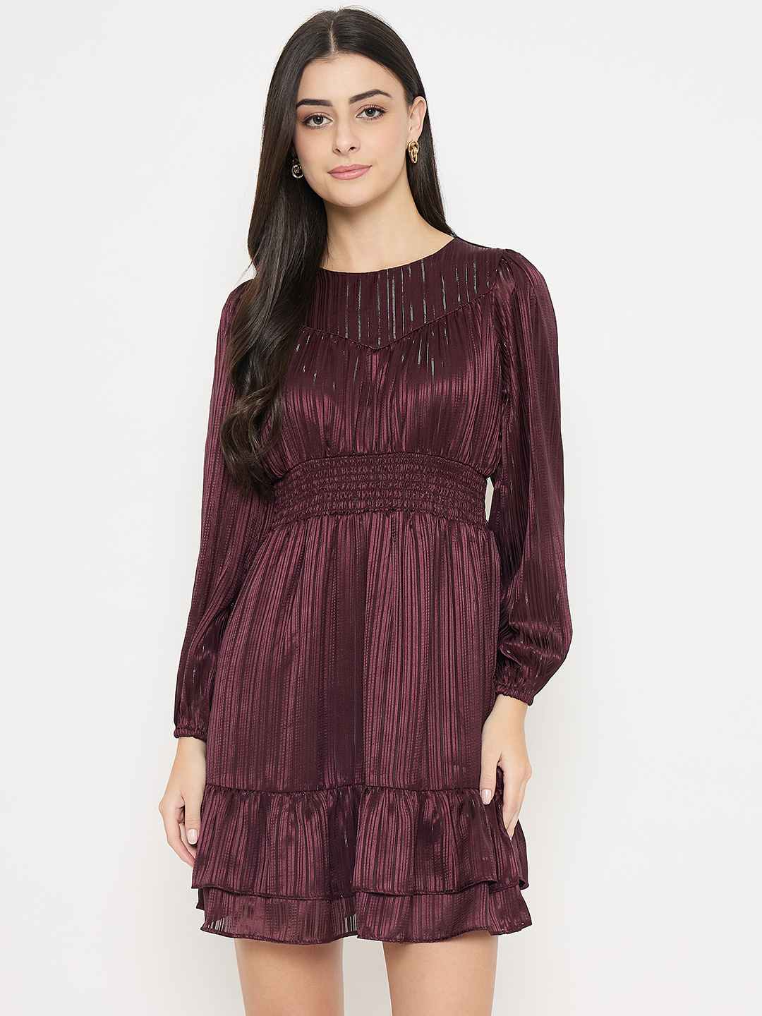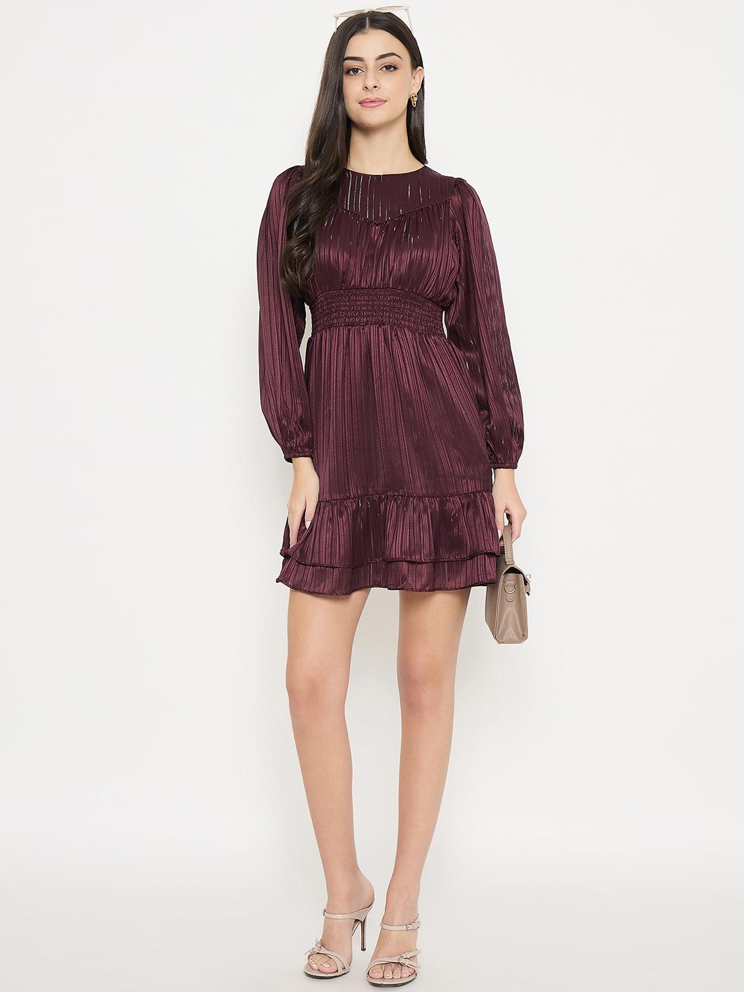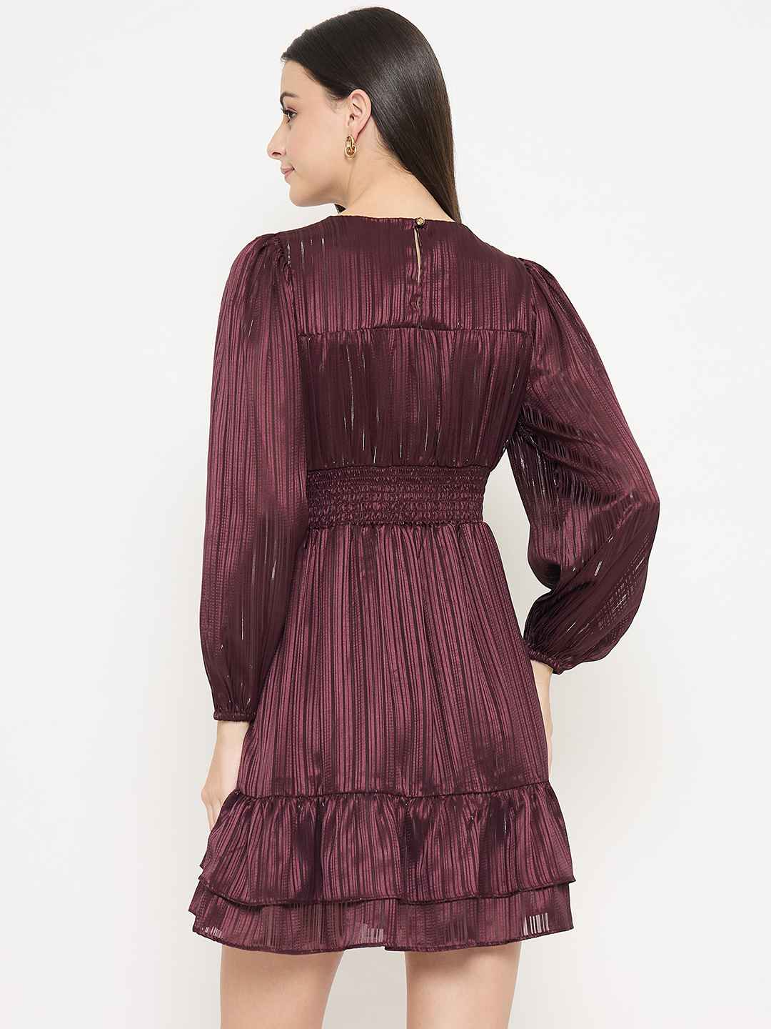 Make a statement with this A Line dress that features a pretty mini length. It gives a hint of sparkle with contrast stripes in a beautiful wine red hue, perfect for evening occasional and parties.
