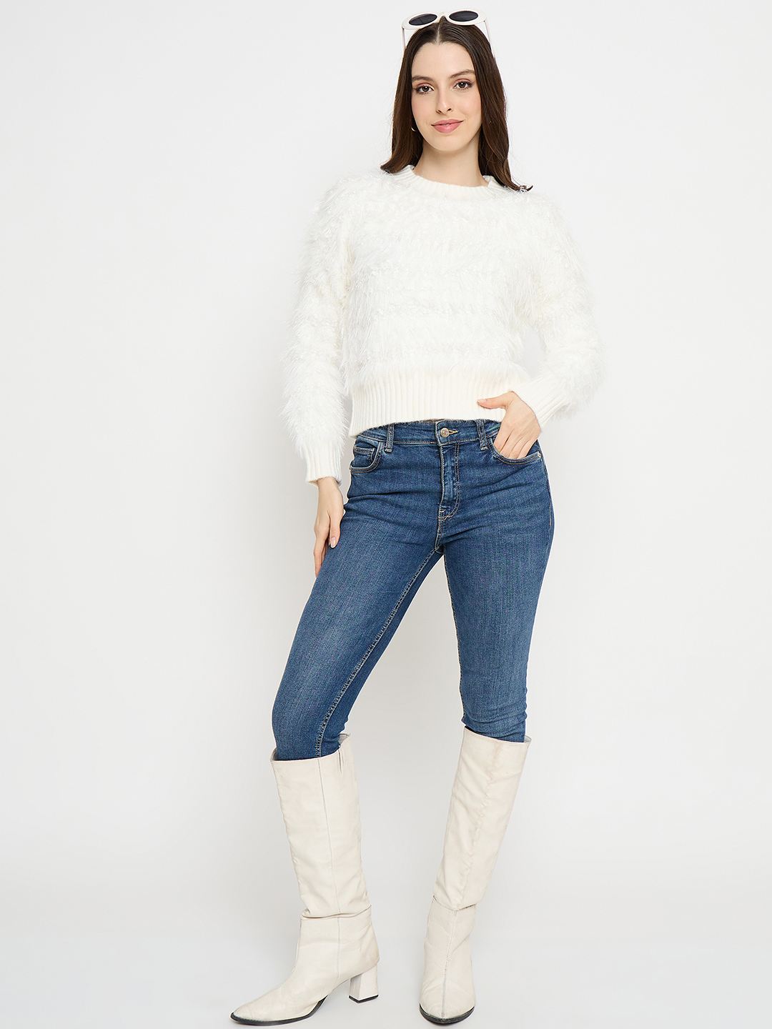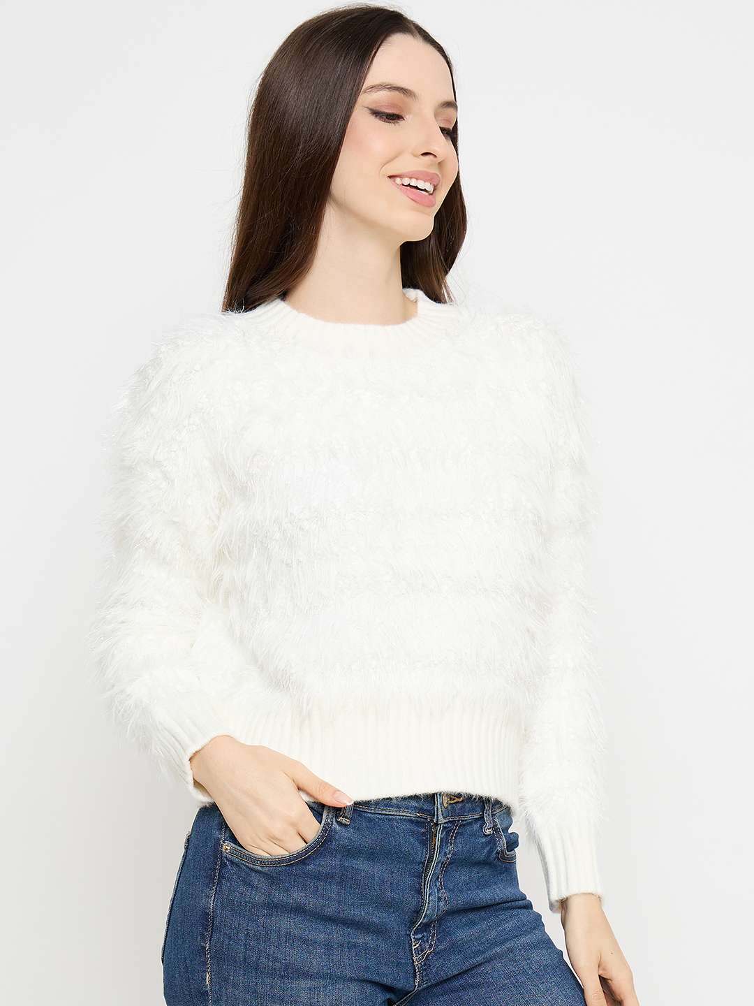 A dreamy blend of warmth and texture, this sweater is wrapped in plush faux fur. In a pretty off-white hue, this sweater turns your winter look into a soft style statement. With a cloud-like feel, it is perfect for layering or solo wear that makes even a coffee run feel like a runway walk.