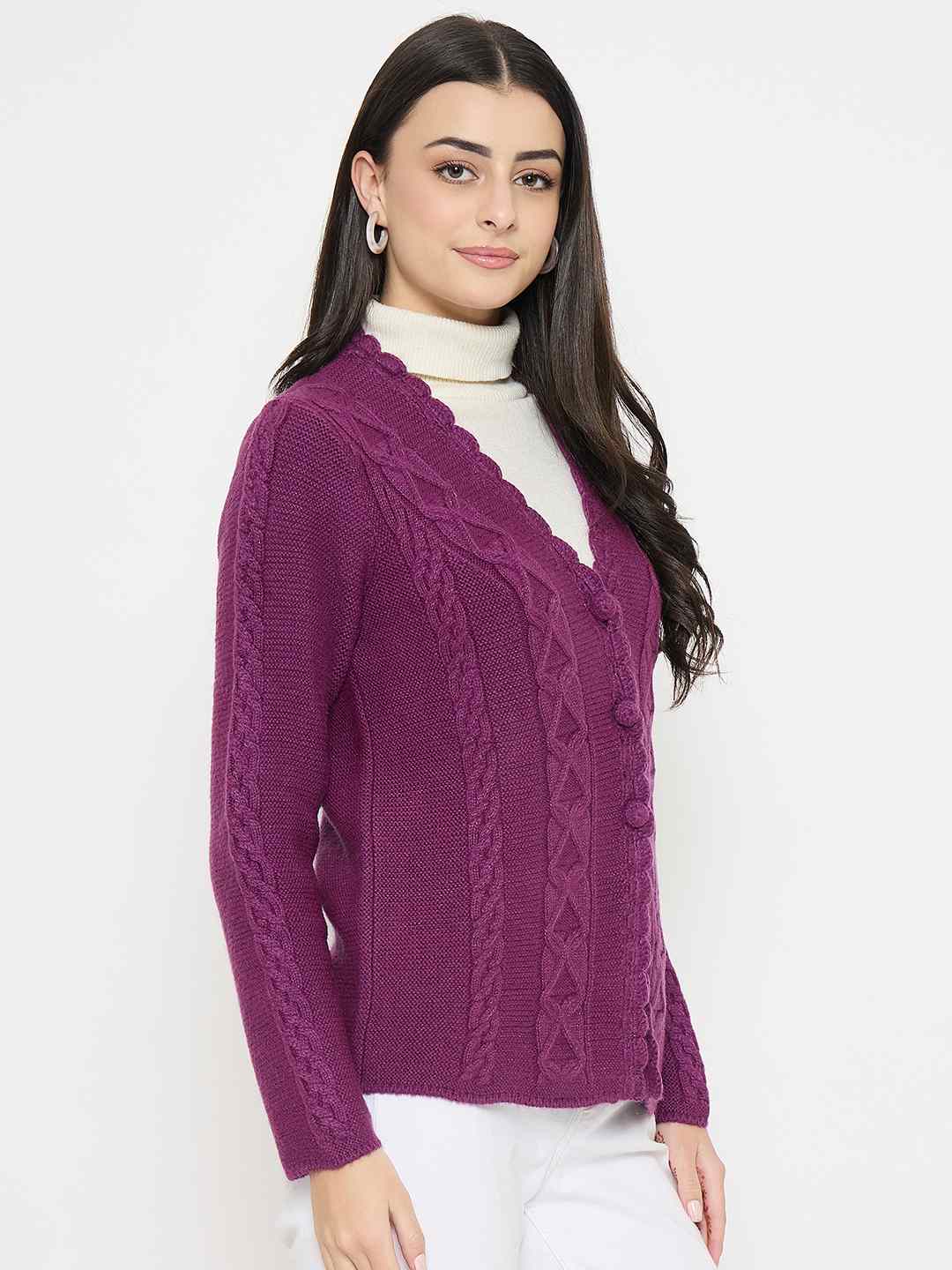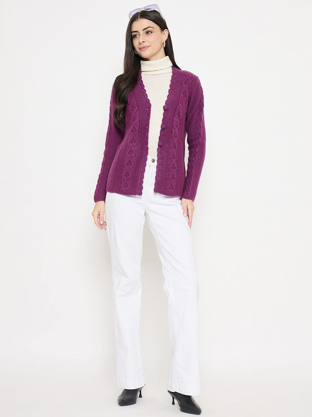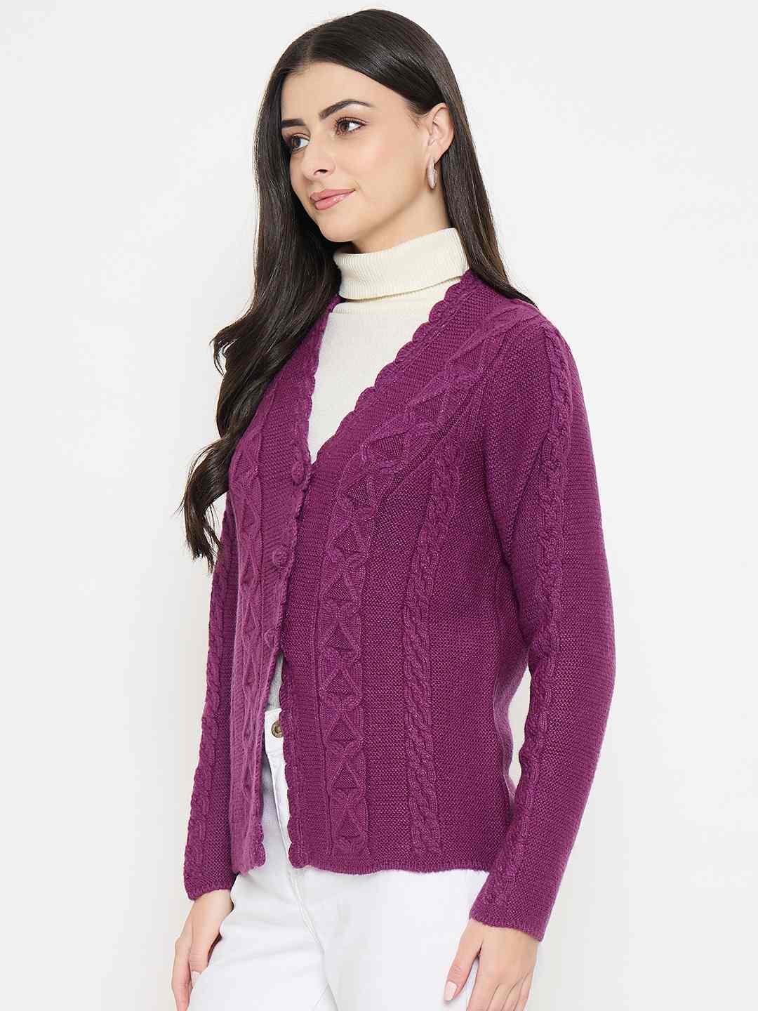 This rich plum cardigan blends cable-knit design with a soft acrylic blend that keeps you warm while adding texture and charm to any outfit. Whether layered over work wear or weekend outfits, it adds style to every wear.
