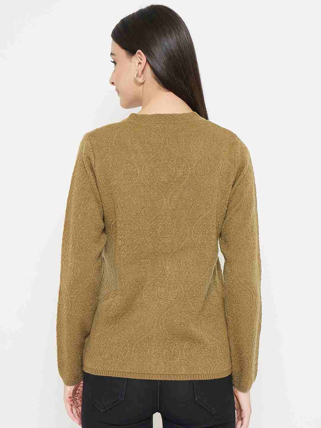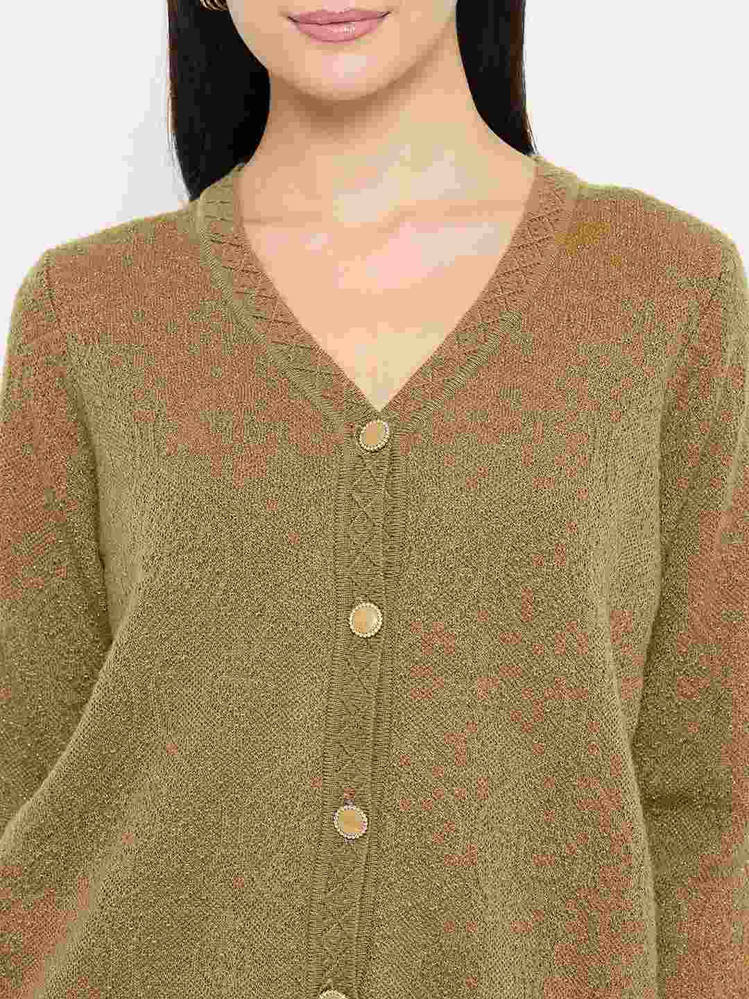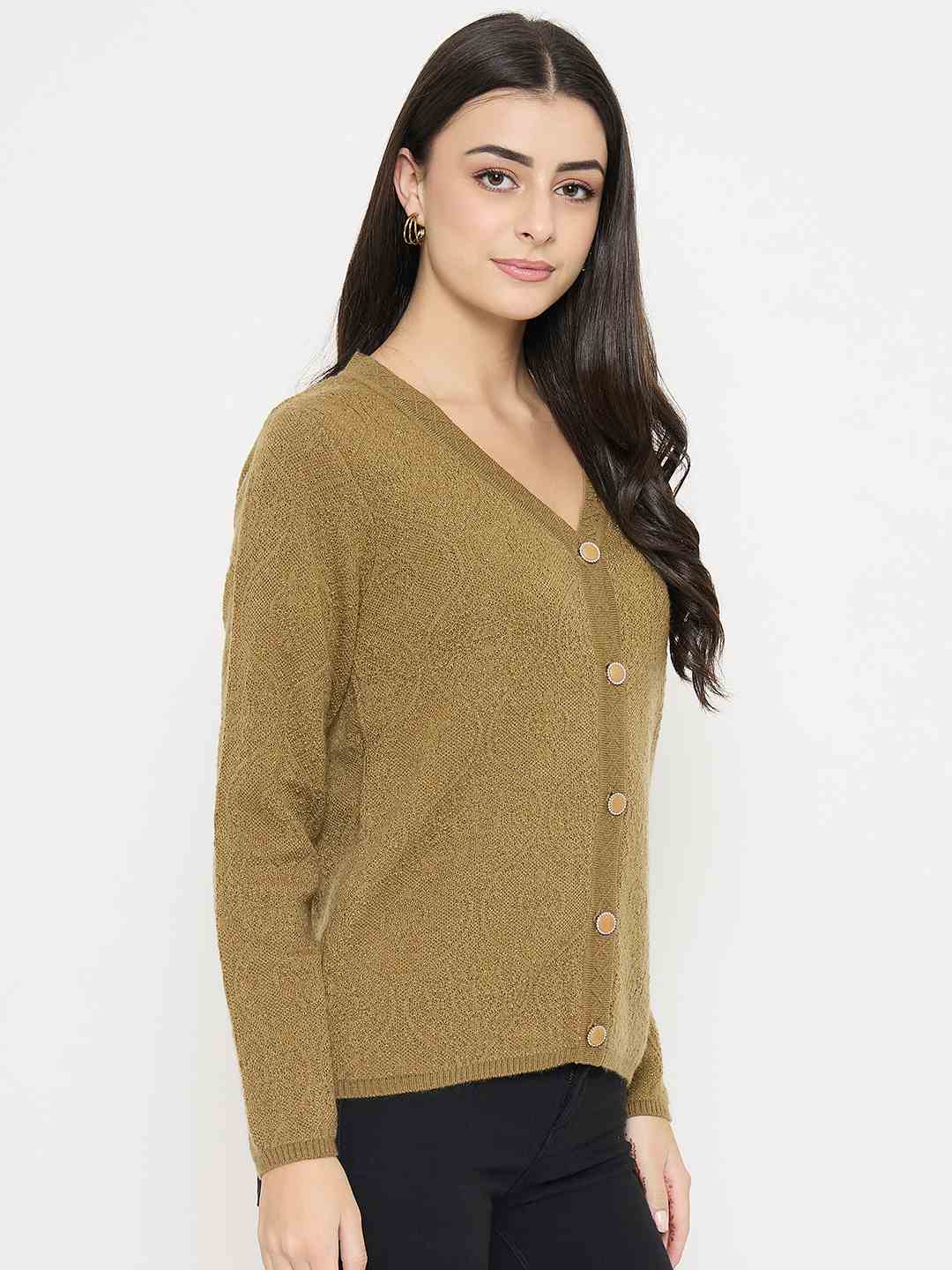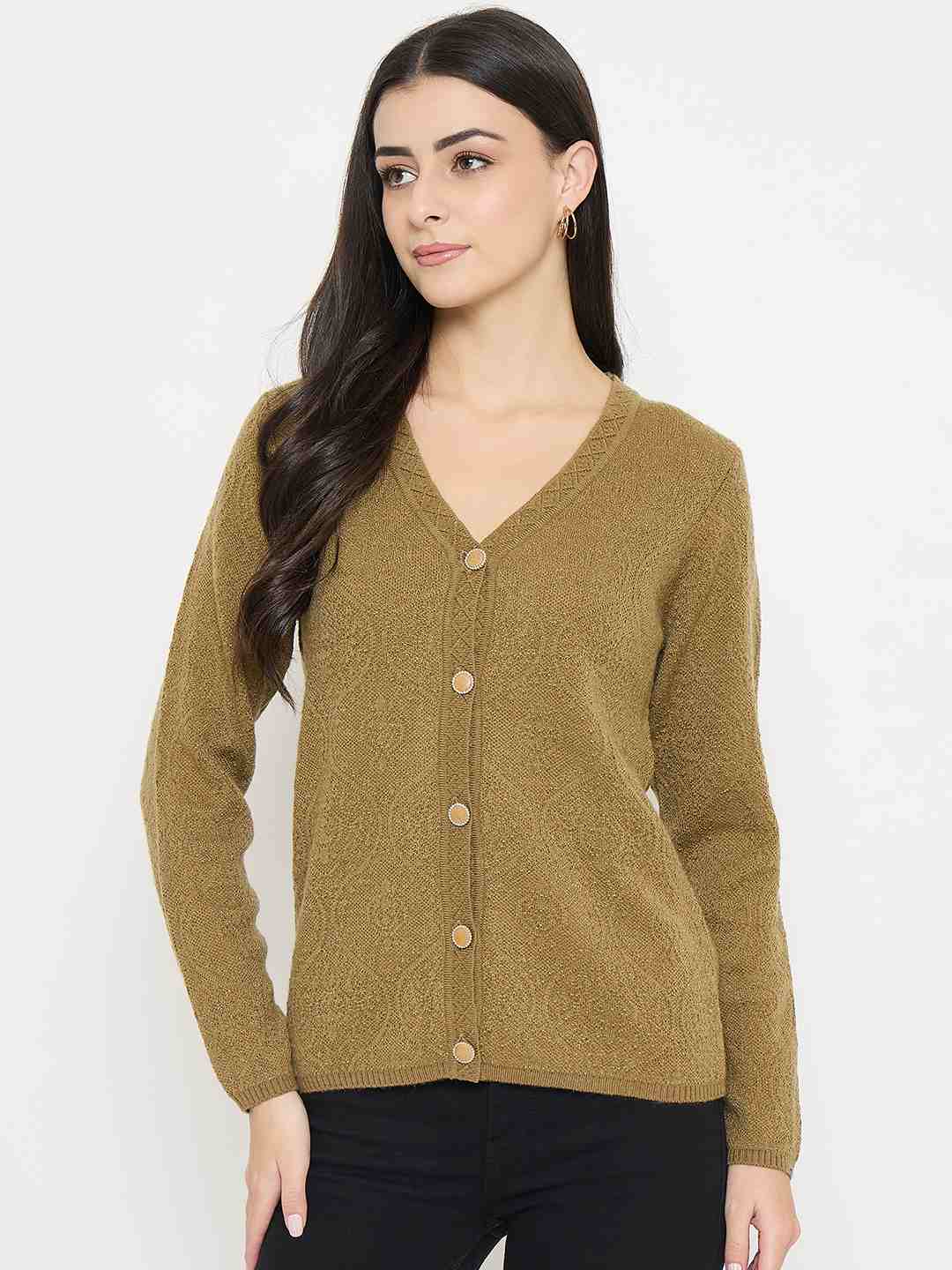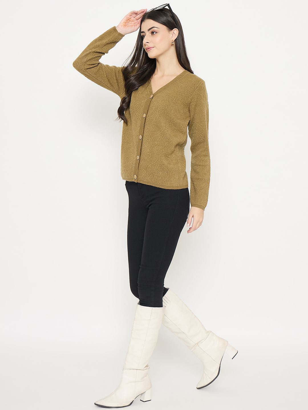 This khaki cardigan brings a subtle and chic vibe to your fits. It combines classic cable-knit detailing with soft acrylic comfort. Its earthy tone and cozy texture elevate everyday outfits.