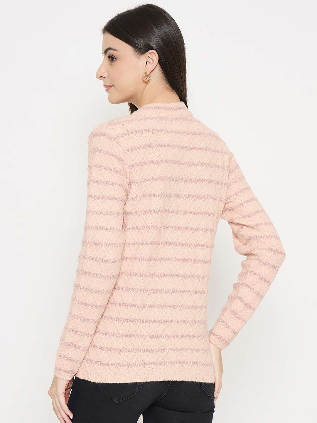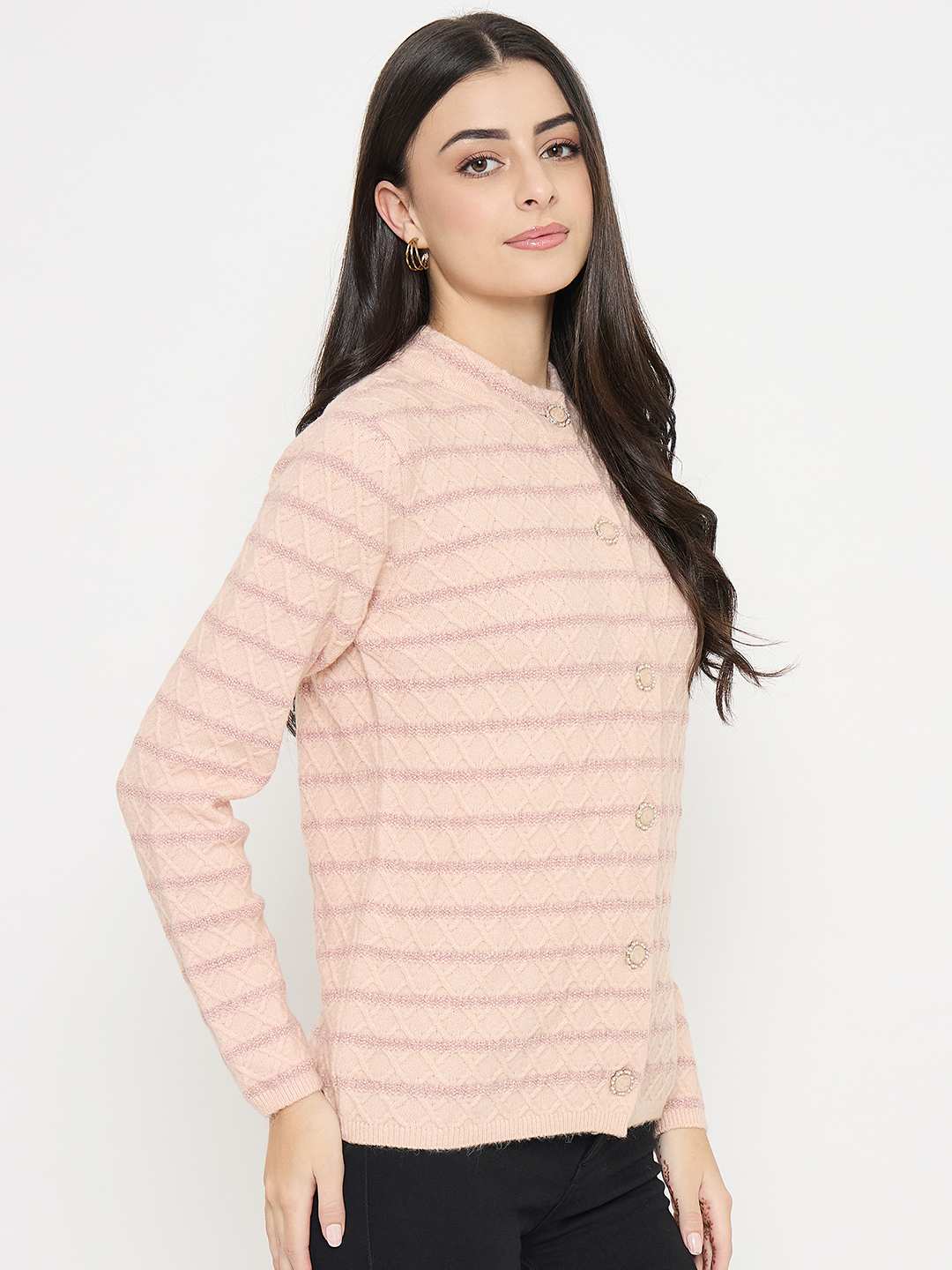 This soft peach cardigan blends acrylic warmth with bold stripes. This is a fun, eye-catching layering piece that is purely effortless to style over dresses, tops, or casual ensembles.
