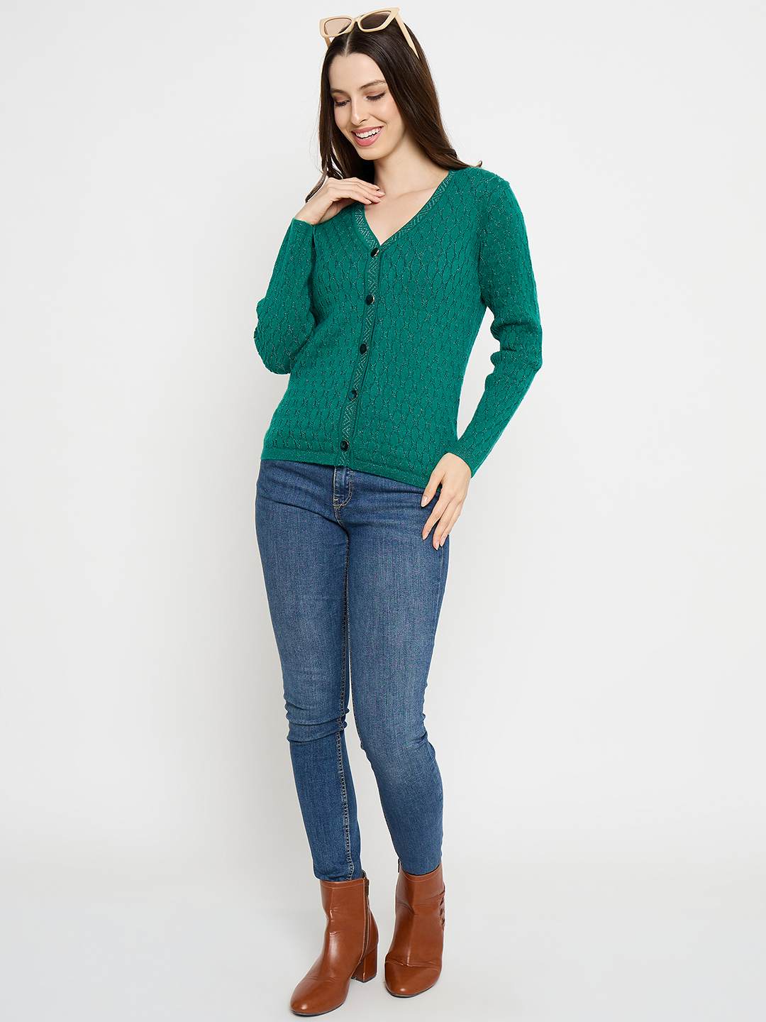 This emerald green cardigan combines cozy acrylic fabric with classic cable-knit detailing, creating a versatile wardrobe staple. Its rich hue and textured design effortlessly elevate everyday outfits with a touch of bold elegance.