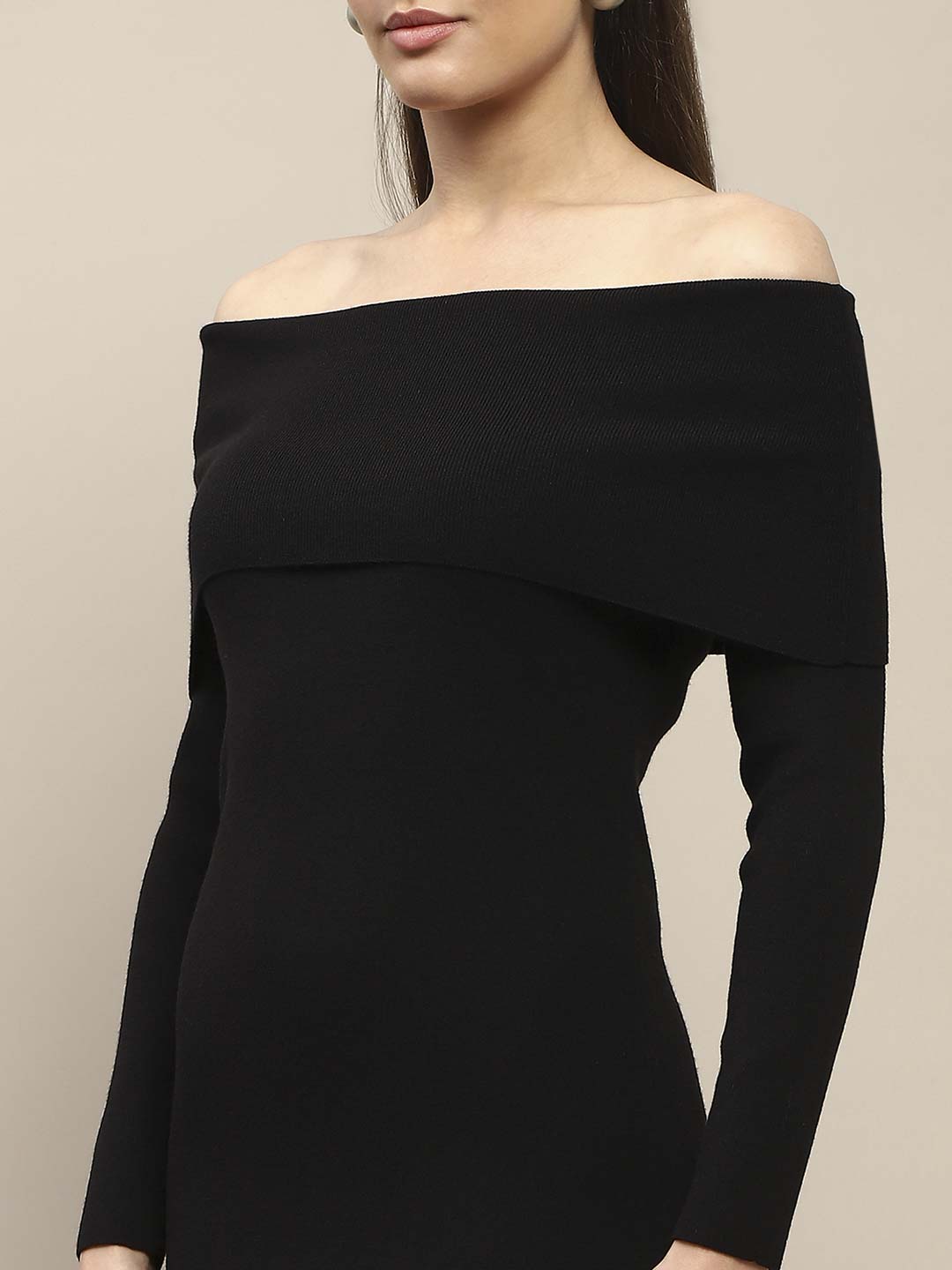Madame Off Shoulder Side Slit Black Bodycon Midi Dress