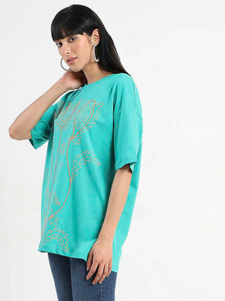 Madame Graphic Print Half Sleeve Peacock Green Cotton T-Shirt
