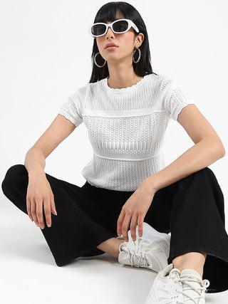 Madame Semi Sheer Knitted Cotton Blend White Top