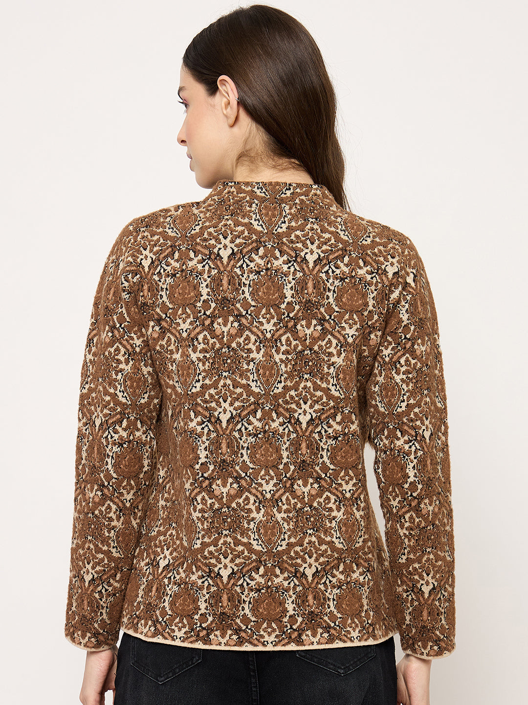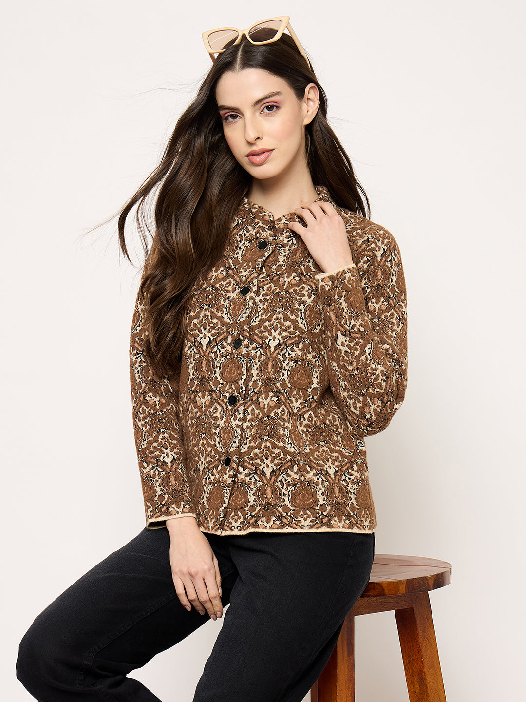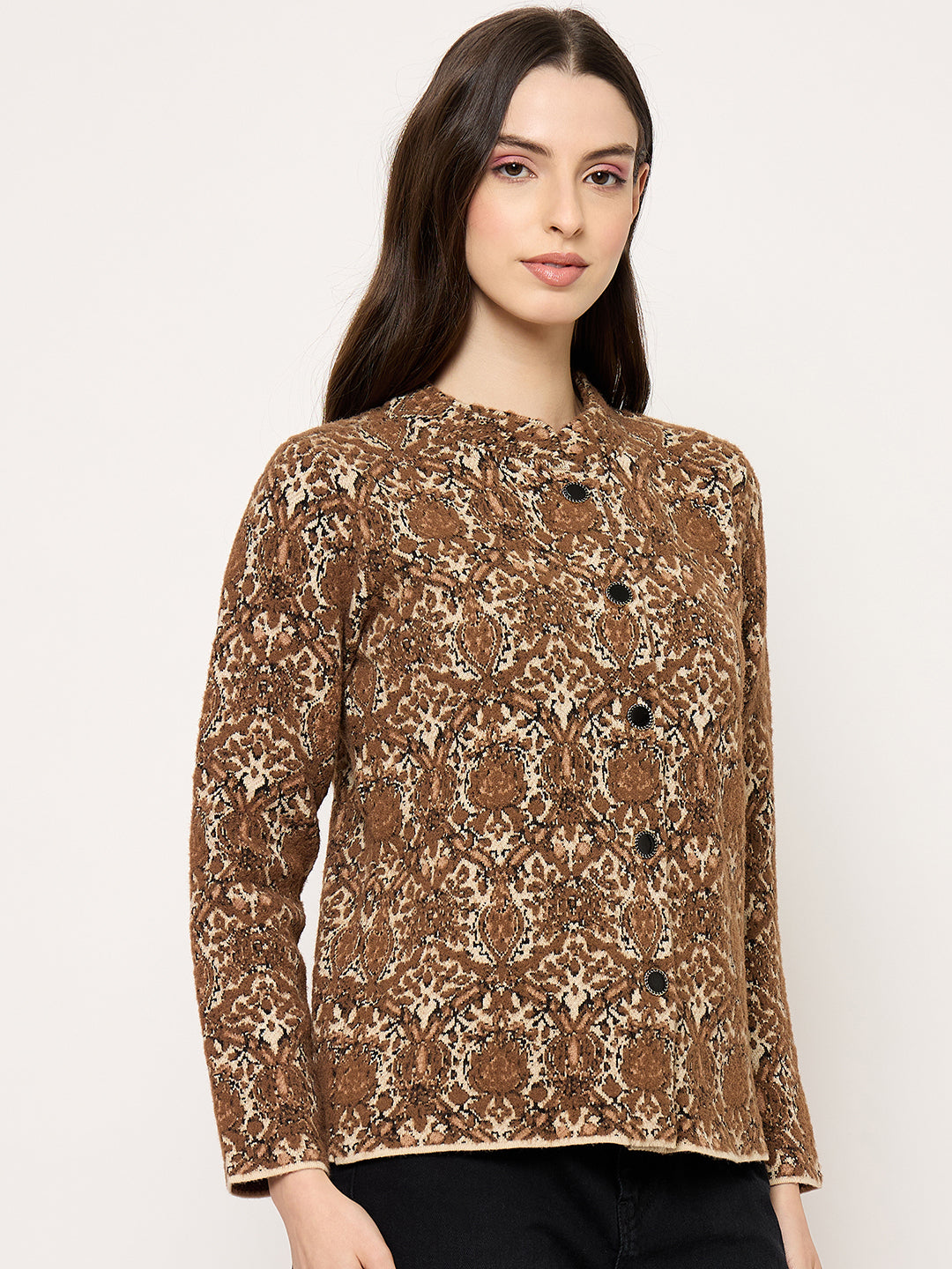 Bold, comfortable, and fashion-forward this printed brown cardigan with buttons adds instant style to your wardrobe. Pair it with jeans, skirts, or trousers for a modern, layered look.