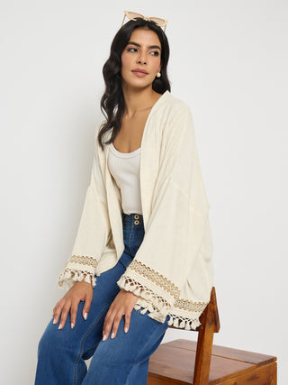 Madame Crochet Lace Trim and Tassel Detail Beige Shrug