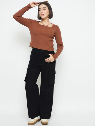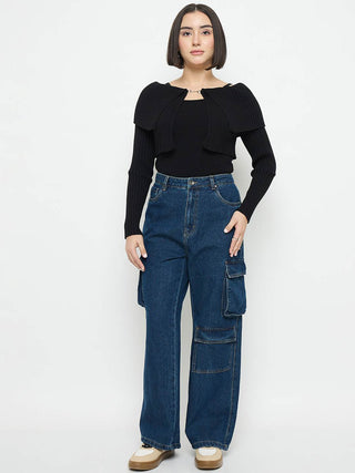 Madame Multi Pocketed Black Straight Cotton Denim Cargo