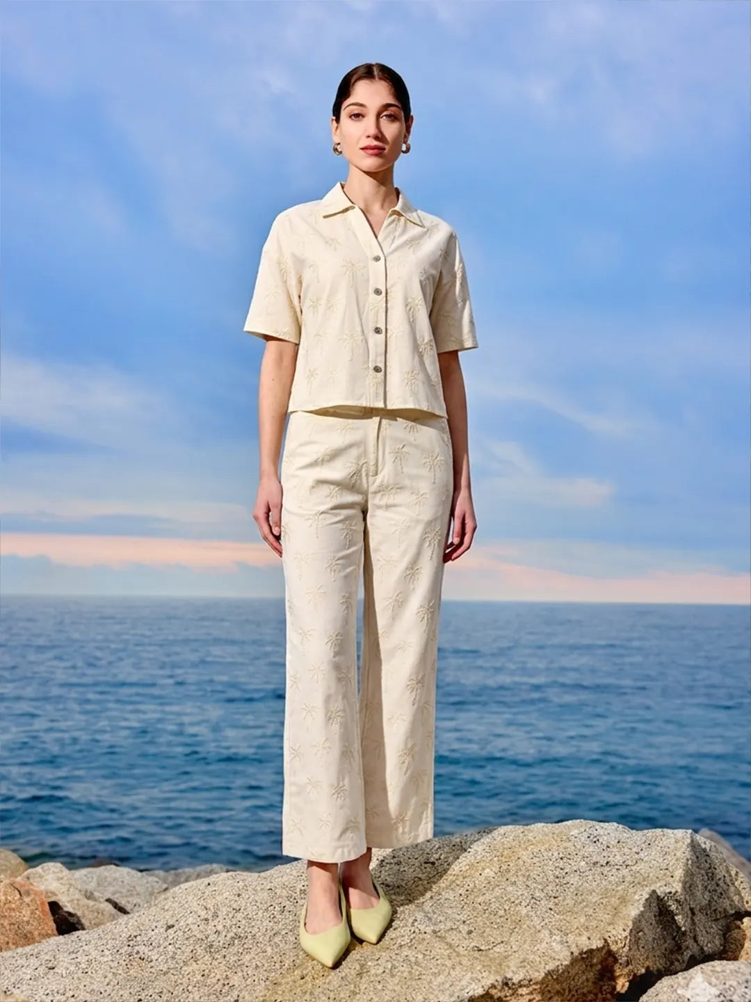 Embrace coordinated fashion with this Ivory Cotton Printed Co-ord Set by Madame. The breathable cotton fabric ensures comfort. Features include a shirt collar, short sleeves on the printed top, and straight-fit trousers, perfect for a relaxed yet chic look.