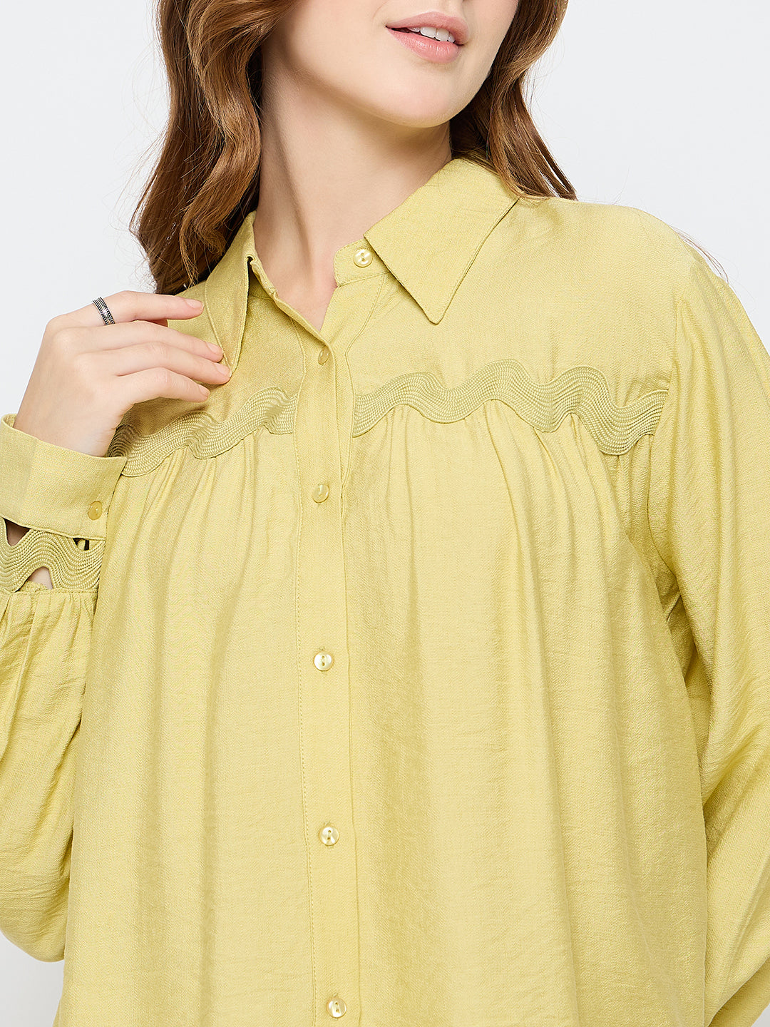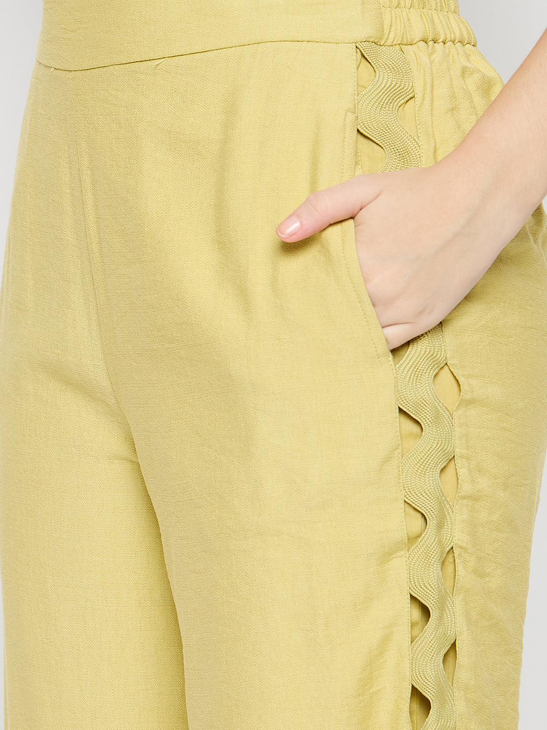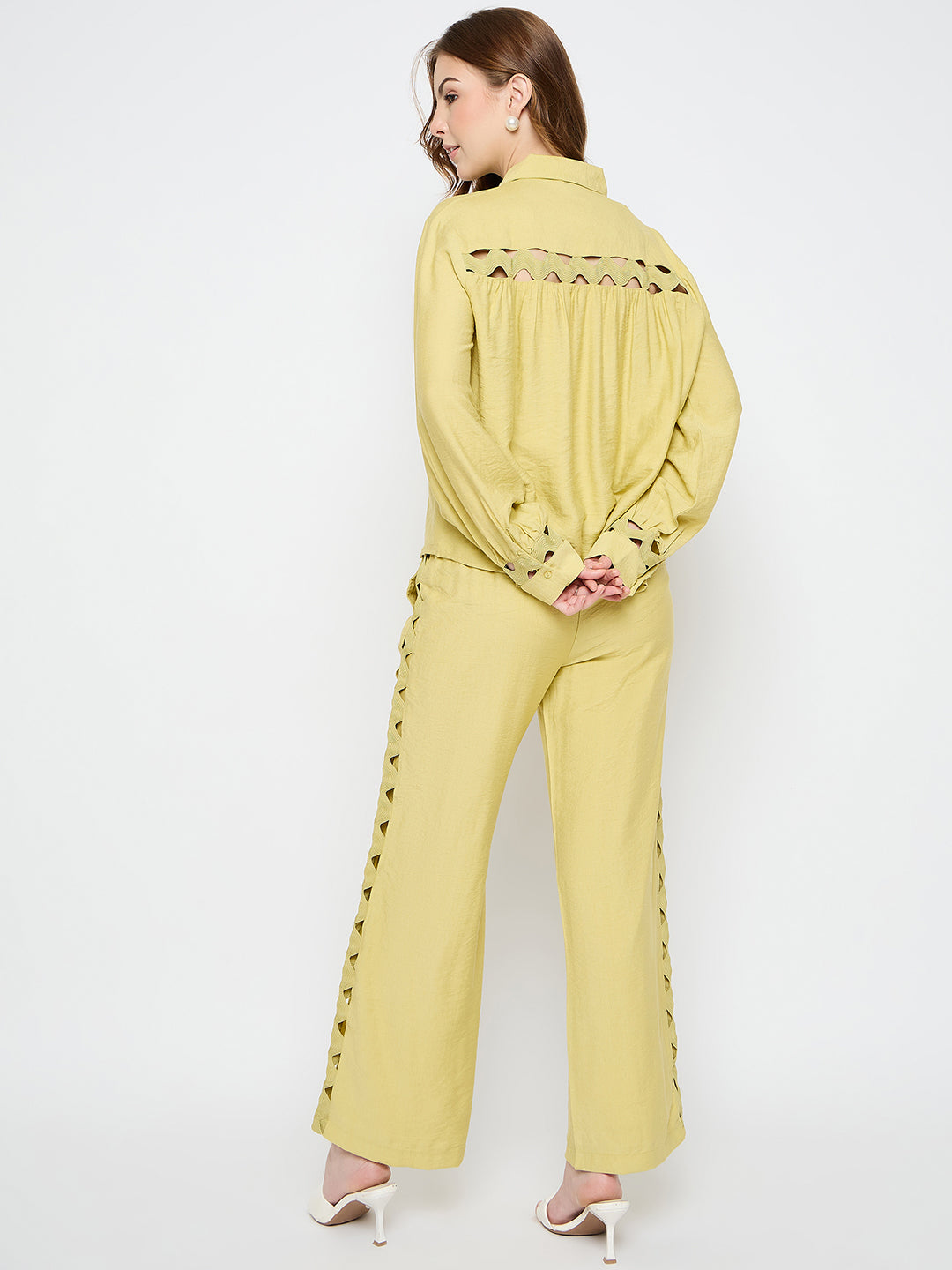 Fresh apple green with lace accents and sleek bottoms. It is a coordinated blend of crisp tailoring and delicate lace for everyday wear.