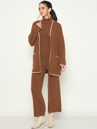 Madame Three Piece Solid Brown Knit Co-ord Set