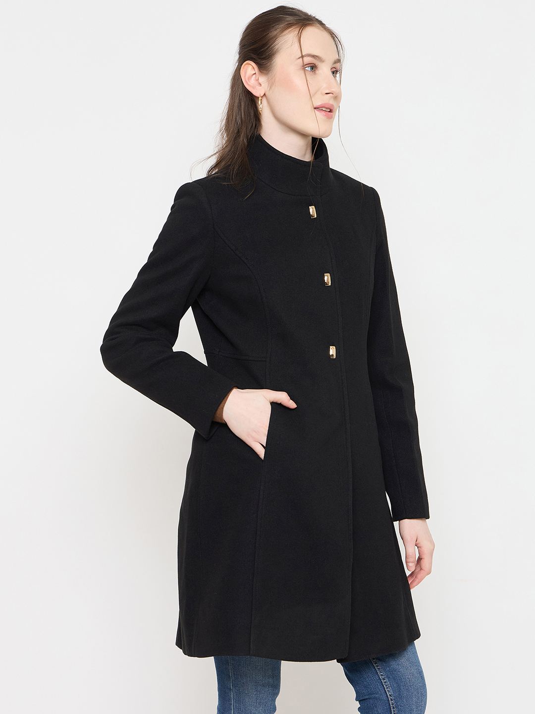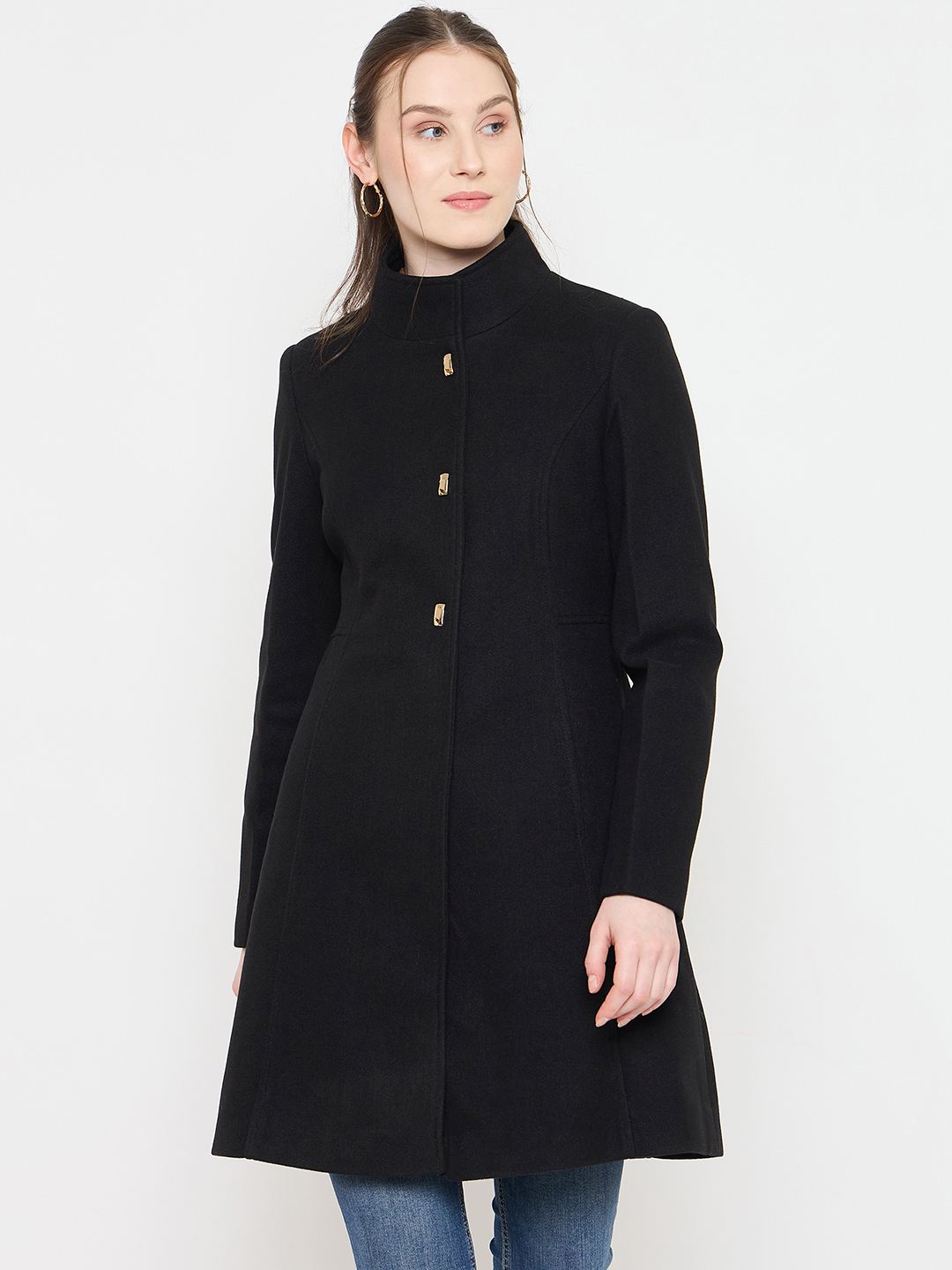 Madame Black Long Coat with Stand Collar and Buttons