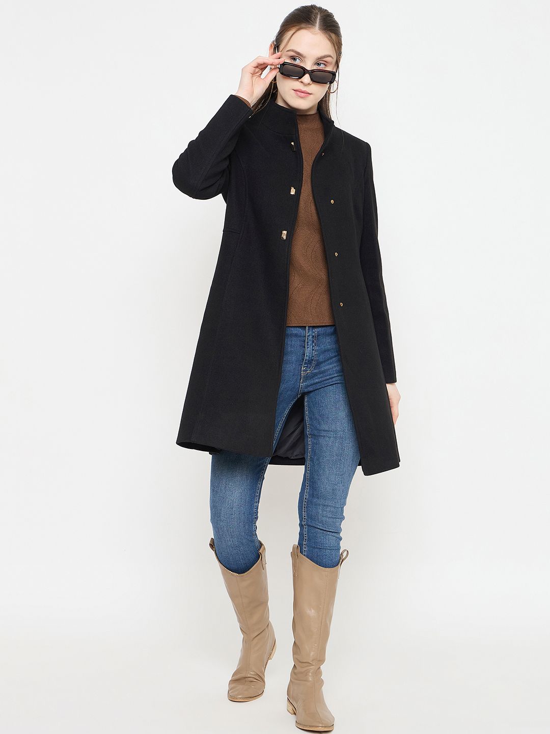 Madame Stand Collar Beige Long Coat with Buttons for women longline silhouette, buttoned front closure, stand collar neckline, perfect for winter layering, office wear, and casual-chic outfits.
