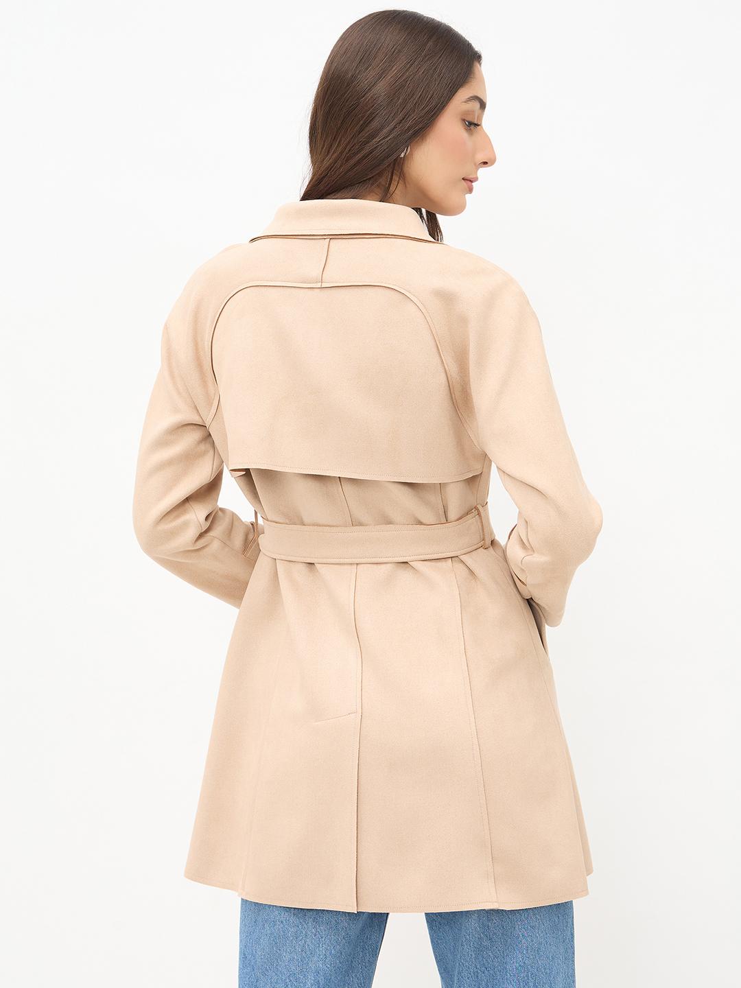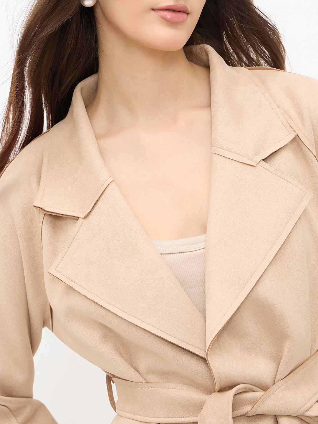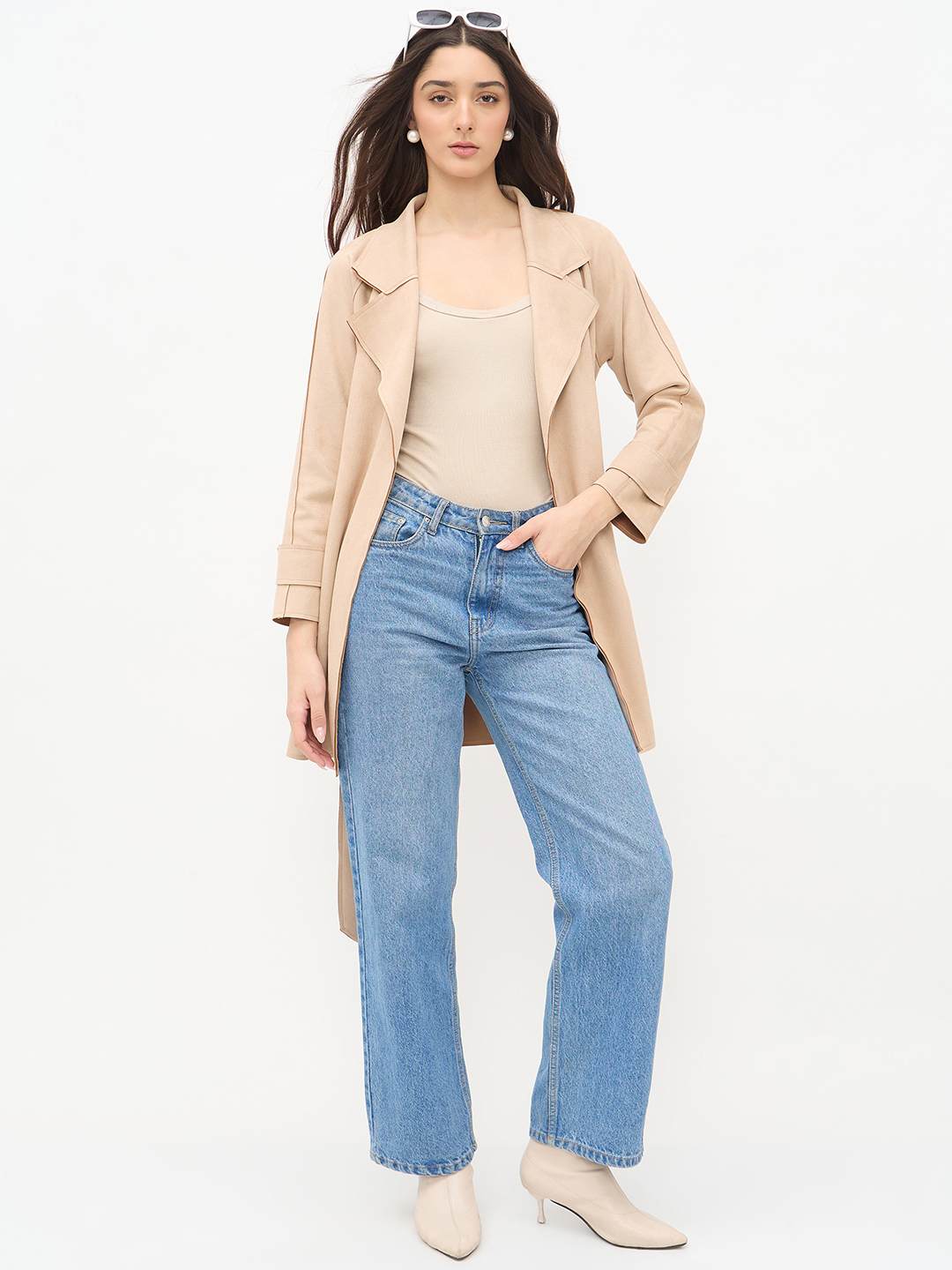 Madame Beige Trench Coat with Lapel Notch Neckline and Belt for women tailored trench design, belted waist, notch lapel, perfect for office wear, casual layering, and stylish winter outfits.