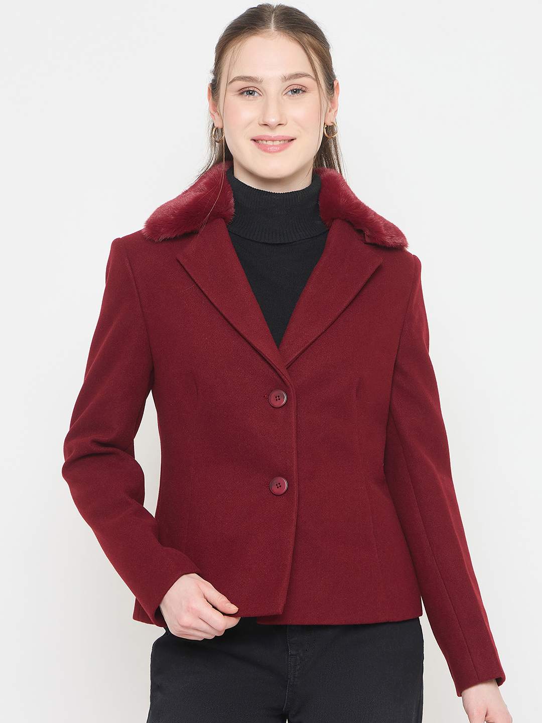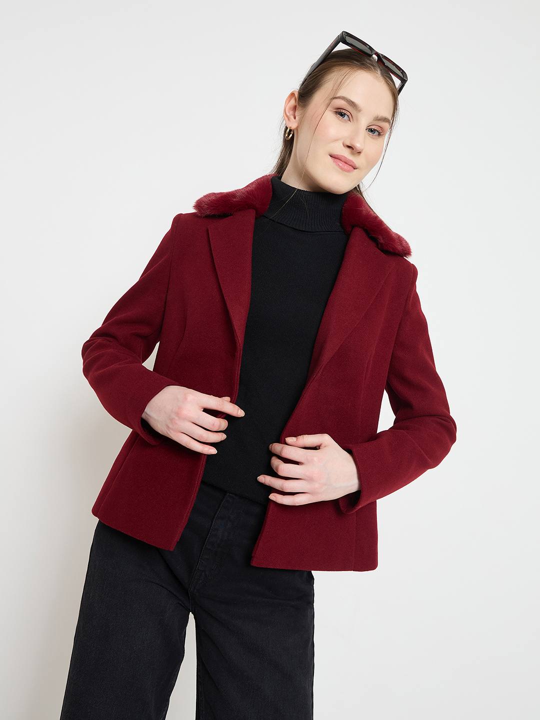 Madame Maroon Short Coat with Faux Fur Notched Lapel Neckline