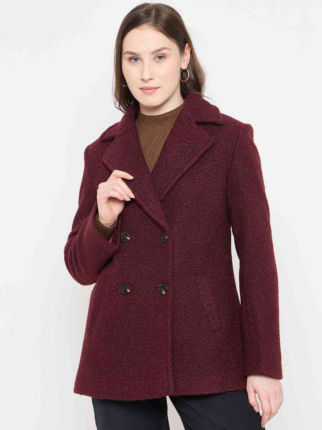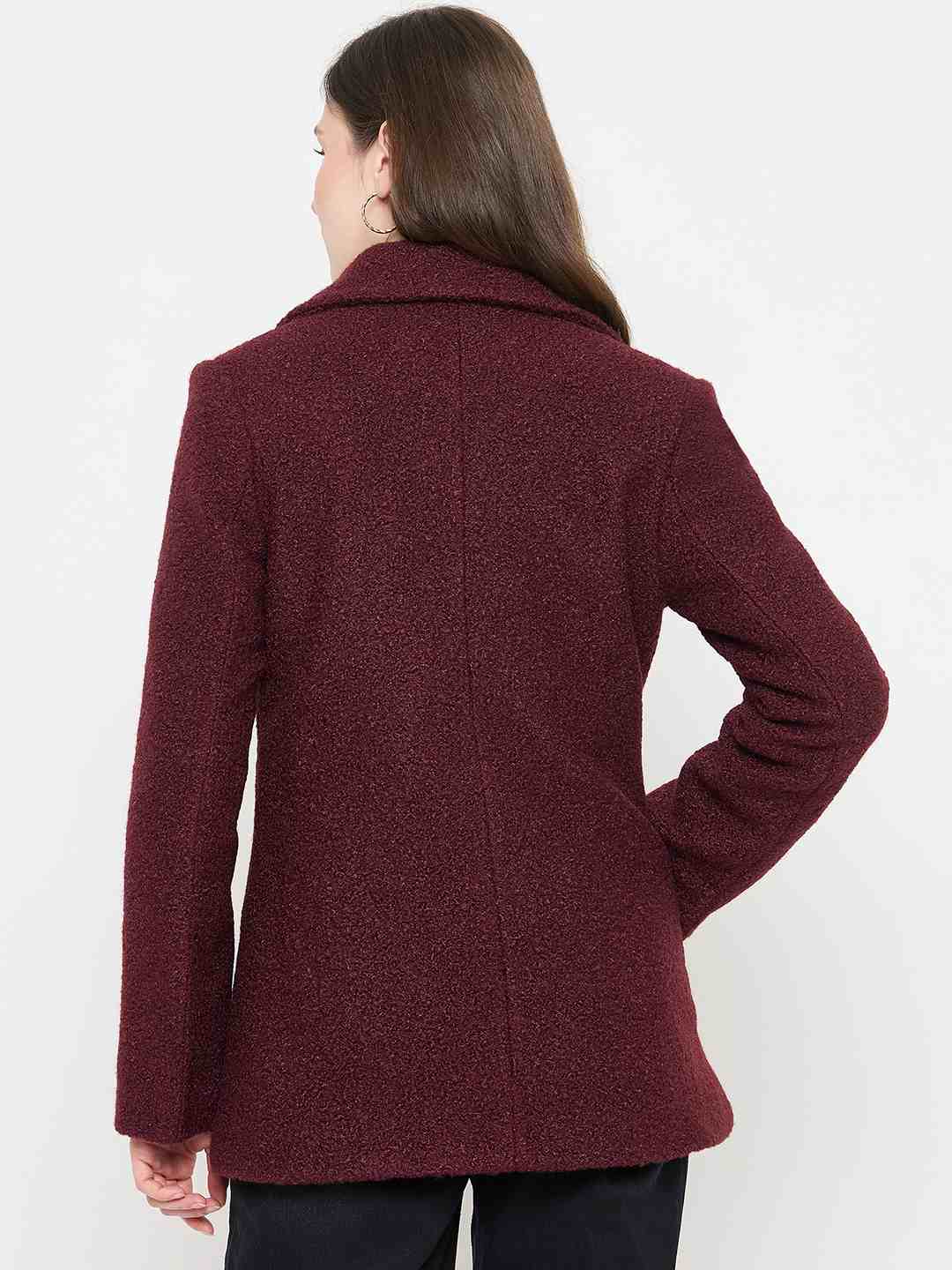 Madame Maroon Coat with Double Breasted Buttons and Notched Collar for women longline silhouette, double-breasted closure, notched collar, ideal for winter layering, office wear, and chic casual outfits.
