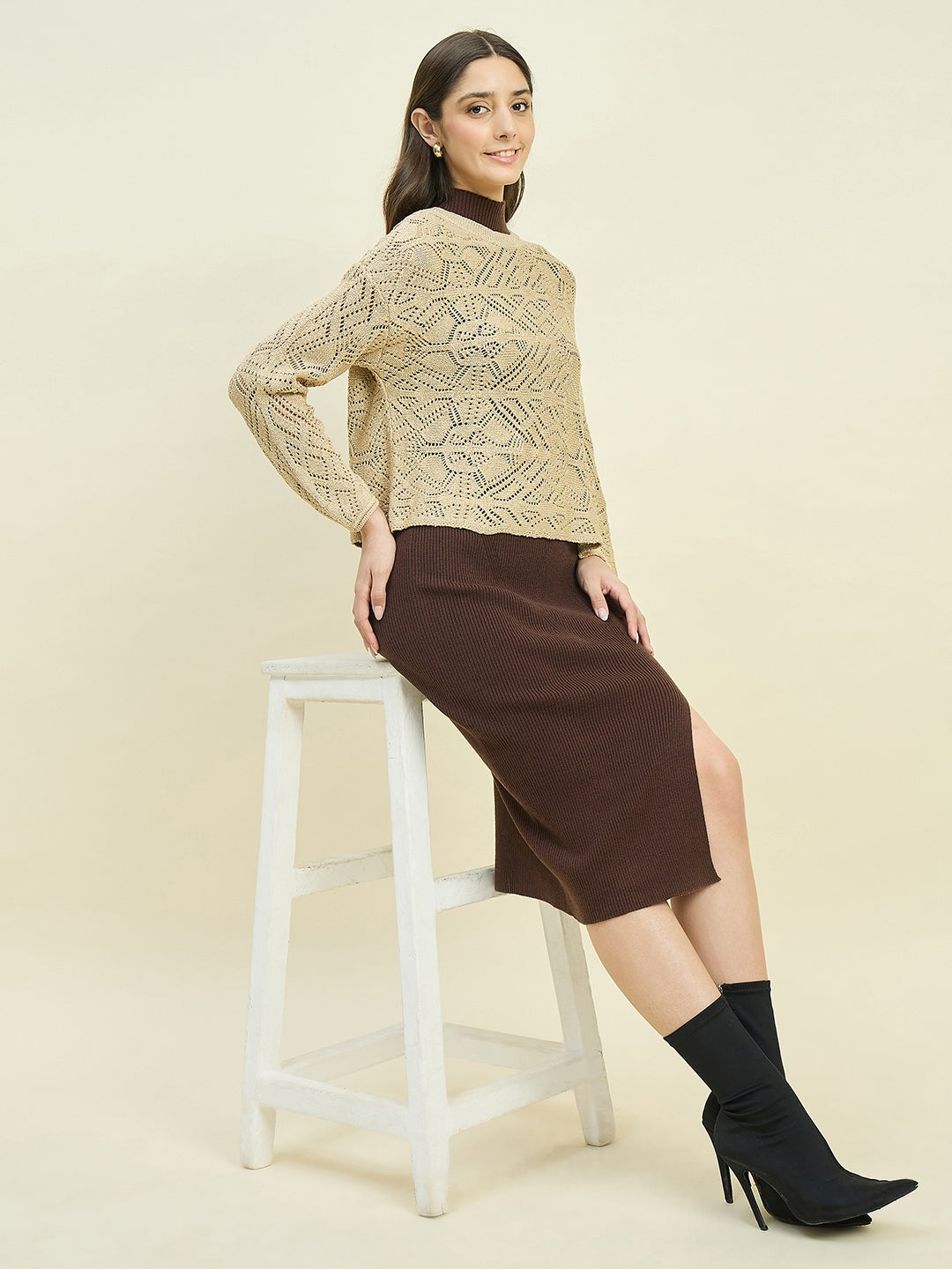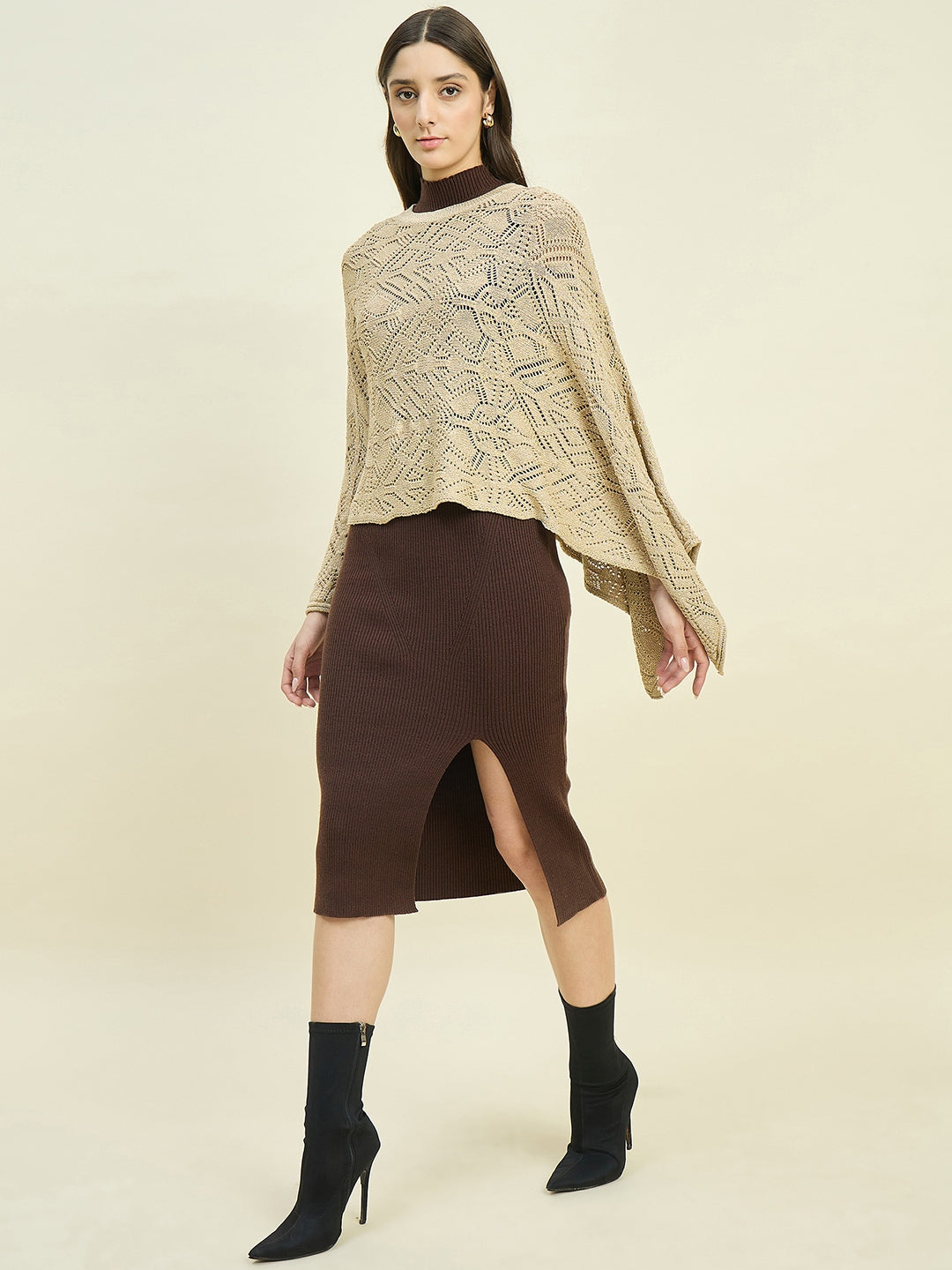 Madame brown dress and cape knit co-ord set is the perfect blend of elegance and comfort. The cozy knit fabric and stylish cape detail make it ideal for casual outings or chic layered looks, offering effortless sophistication.