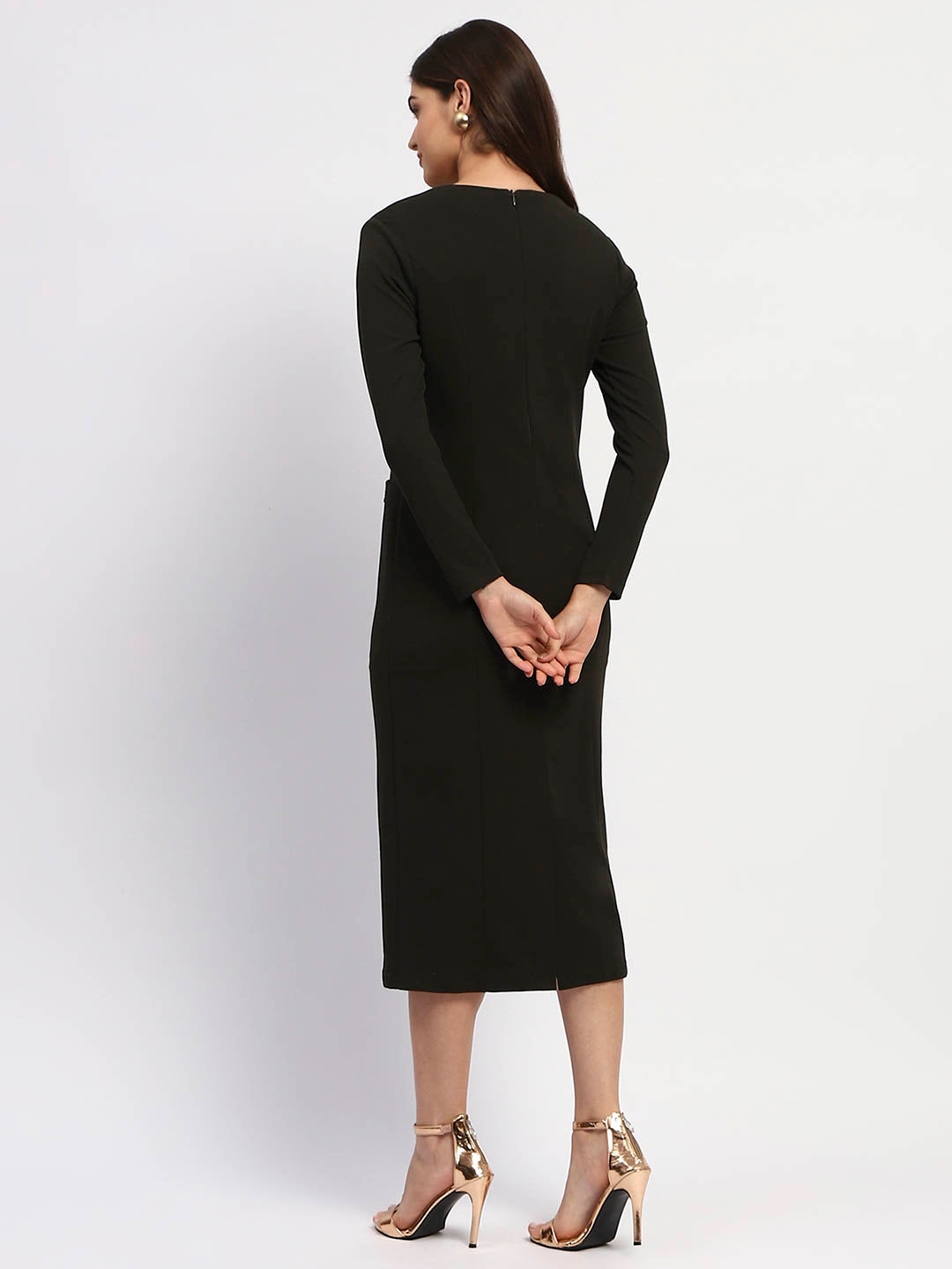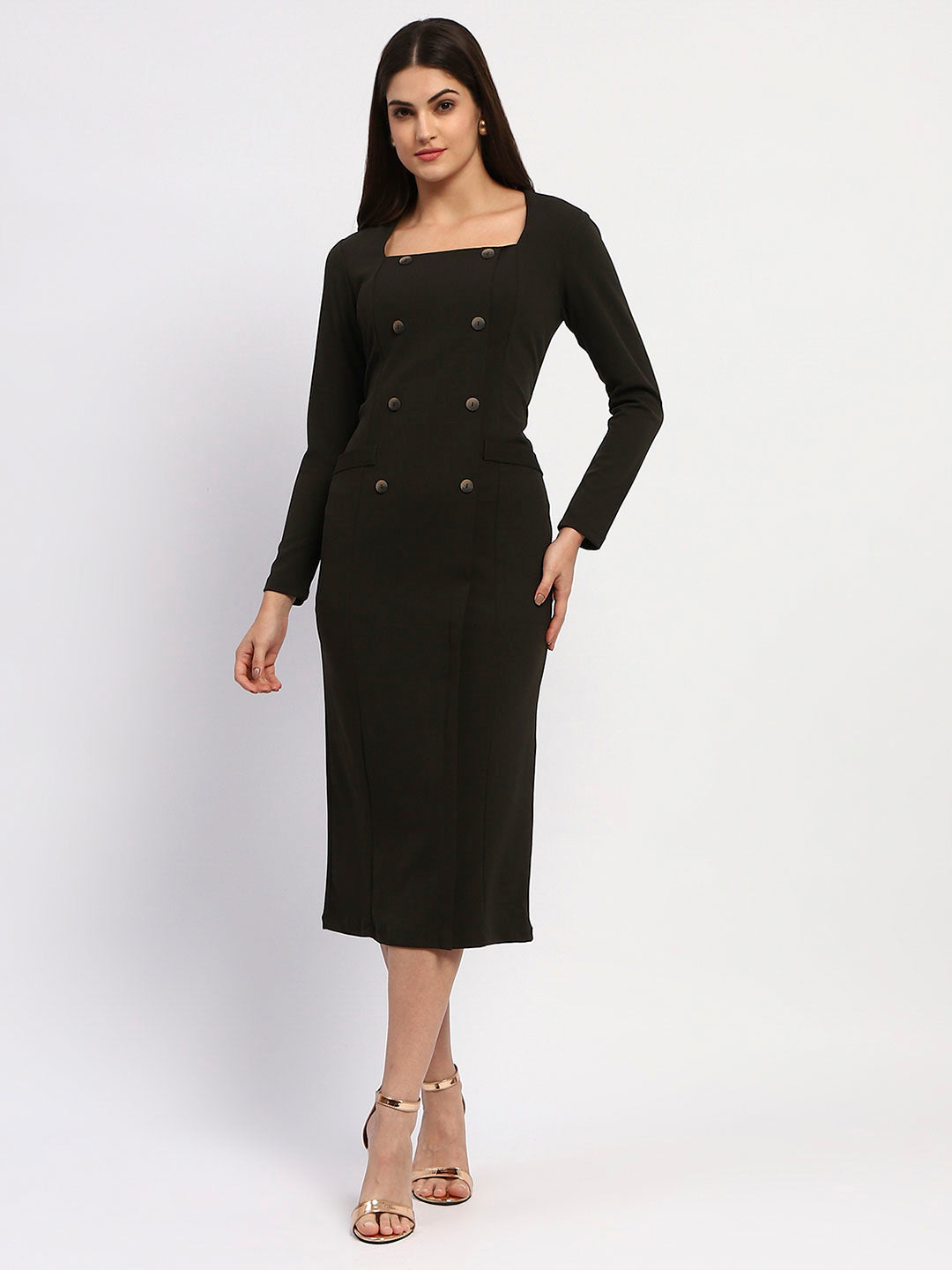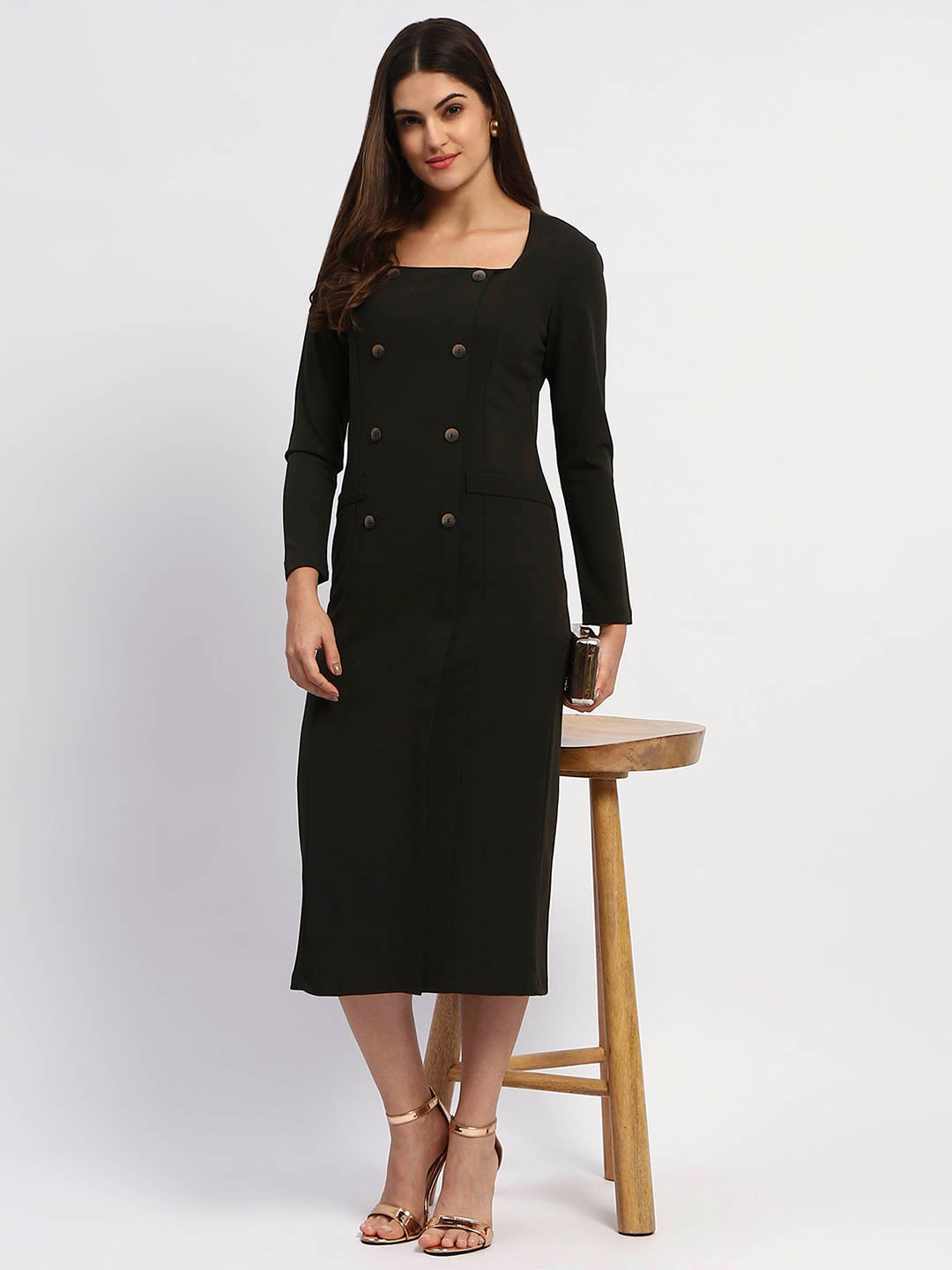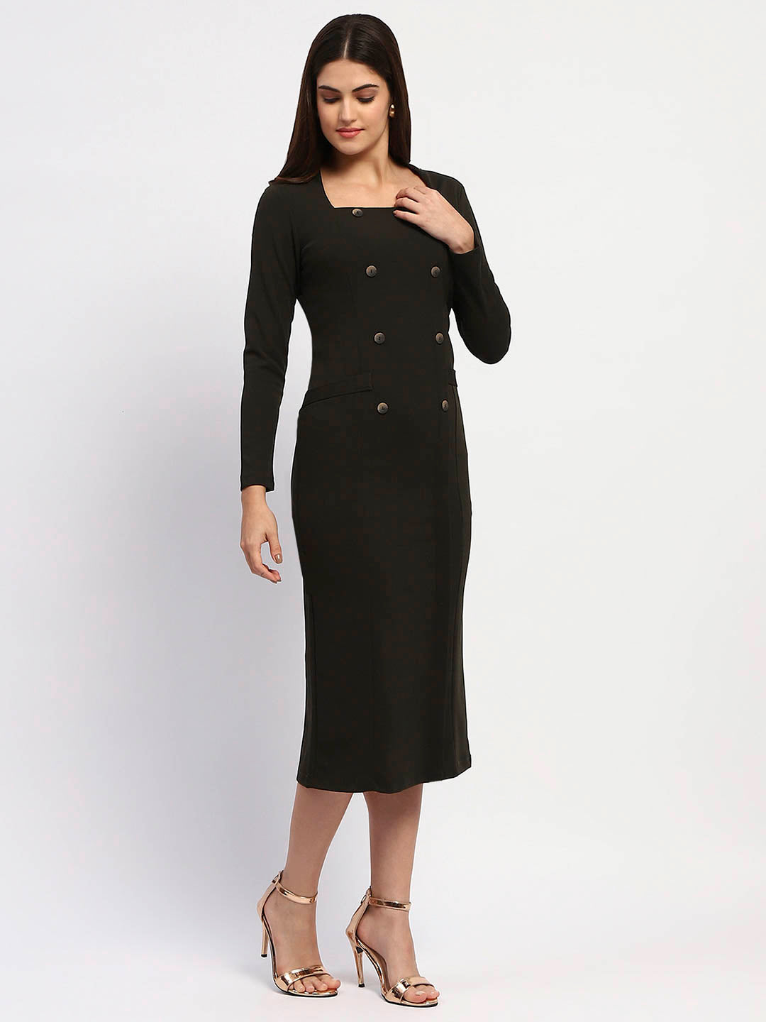 Madame Olive Green Double-Breasted Detailing Long Dress