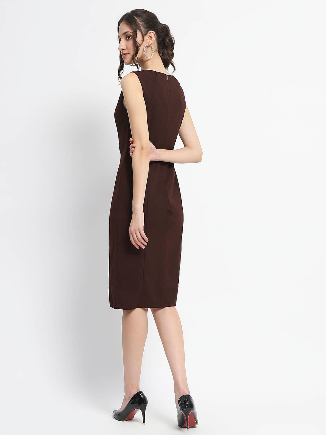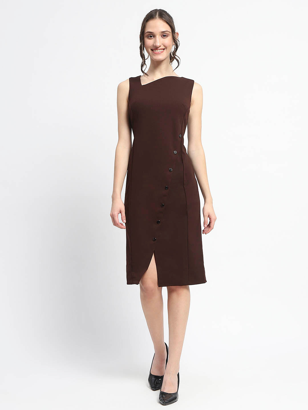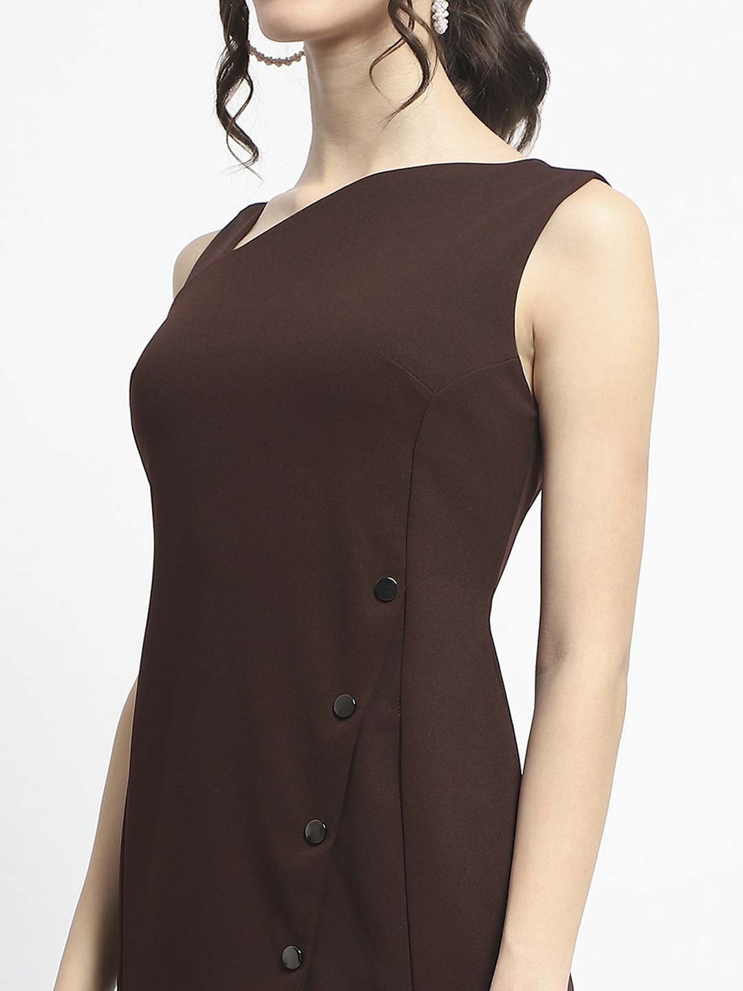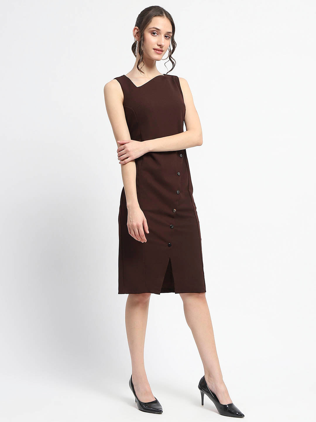 This dress hugs your curves in all the right places while providing a flattering silhouette. The rich chocolate brown hue adds a touch of warmth and sophistication, making it an ideal choice for both casual outings and more formal occasions. The unique button detailing along the front adds a playful yet elegant touch, allowing you to adjust the neckline to your preference. Whether you're heading to brunch with friends or a cozy dinner date, this midi dress is versatile enough to be dressed up with heels or kept casual with your favorite sneakers. With its combination of style, comfort, and versatility, the chocolate brown midi dress is sure to become your go-to outfit for any occasion.
