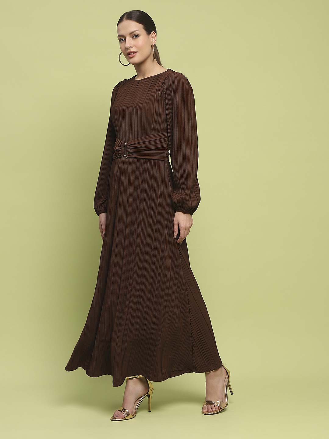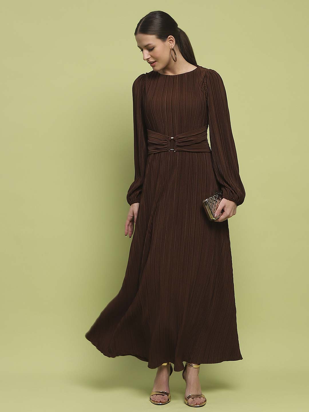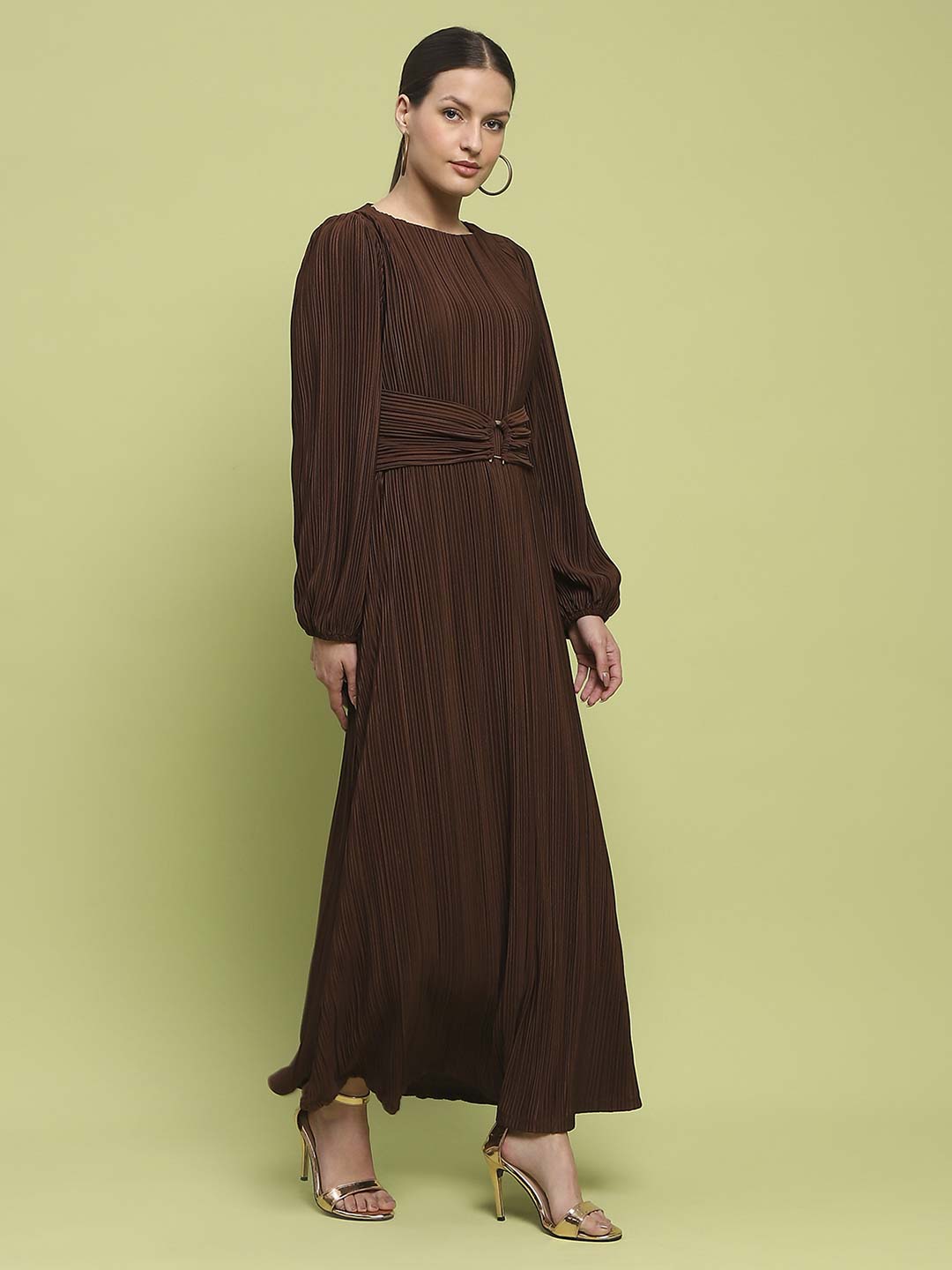 Madame Pleated Front Buckle Detailed Solid Chocolate Maxi Dress