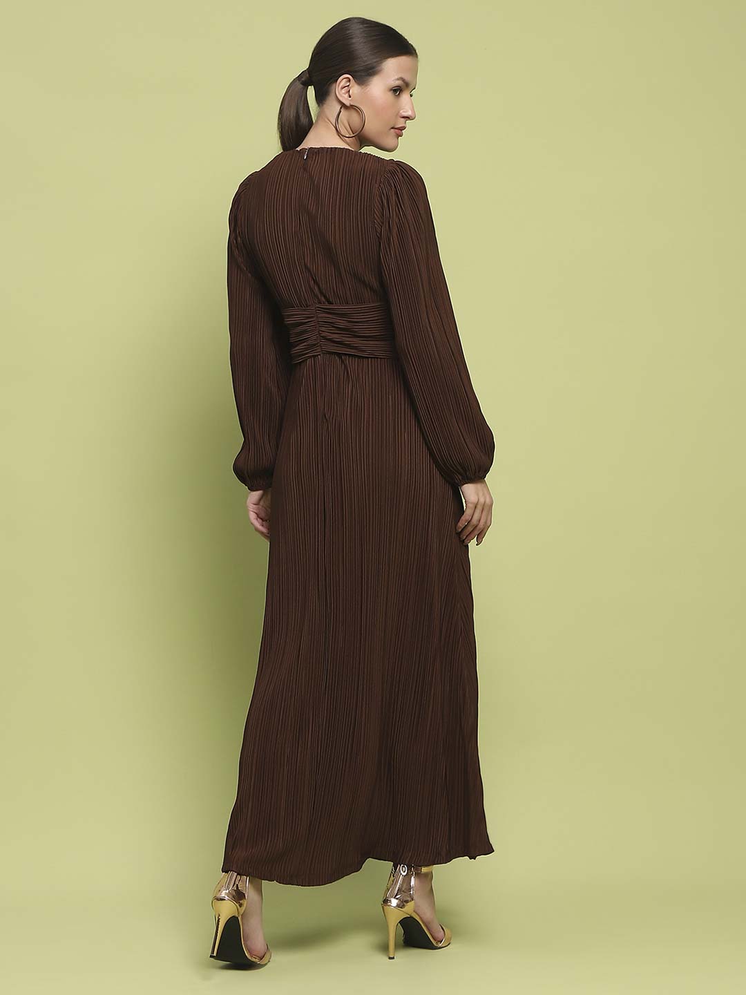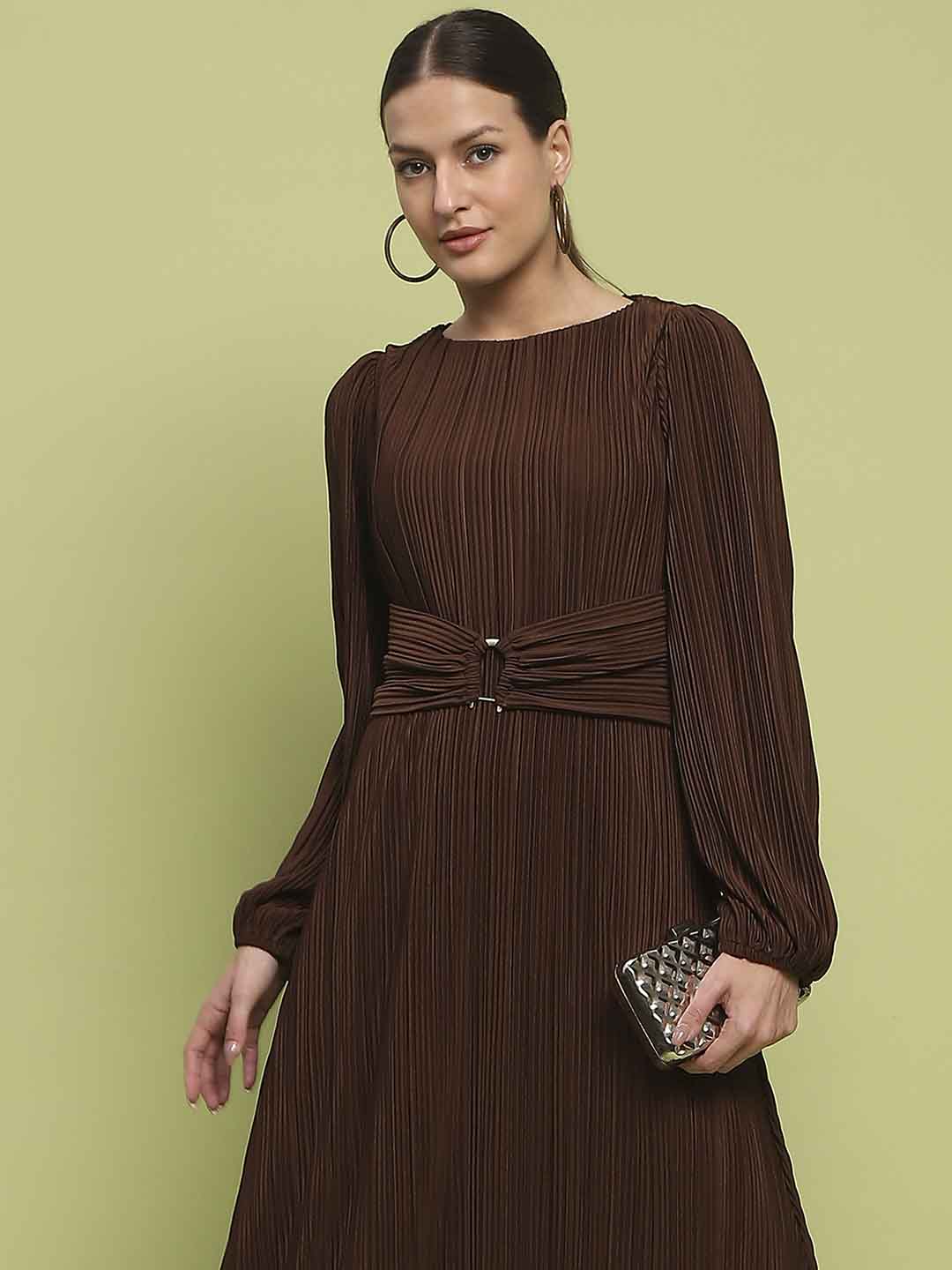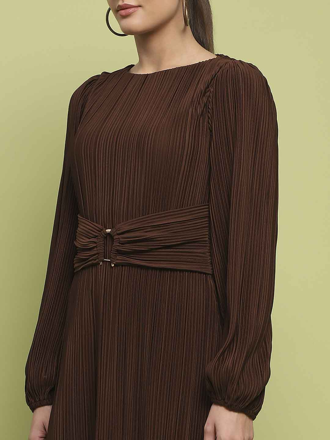 Madame Pleated Front Buckle Detailed Solid Chocolate Maxi Dress