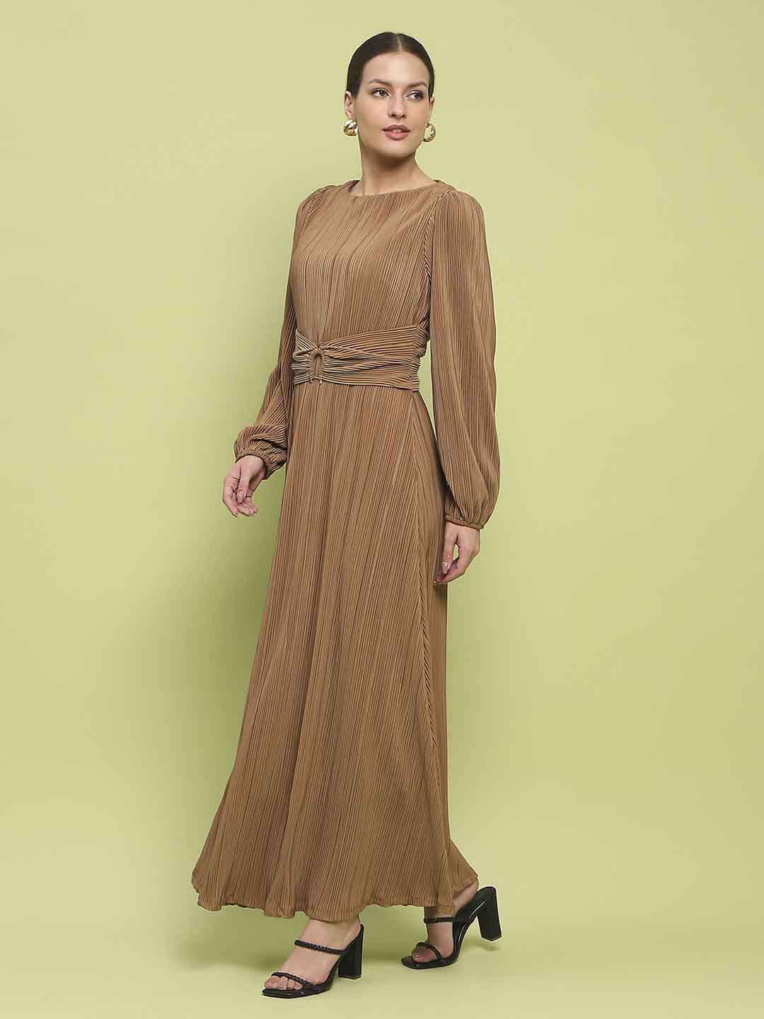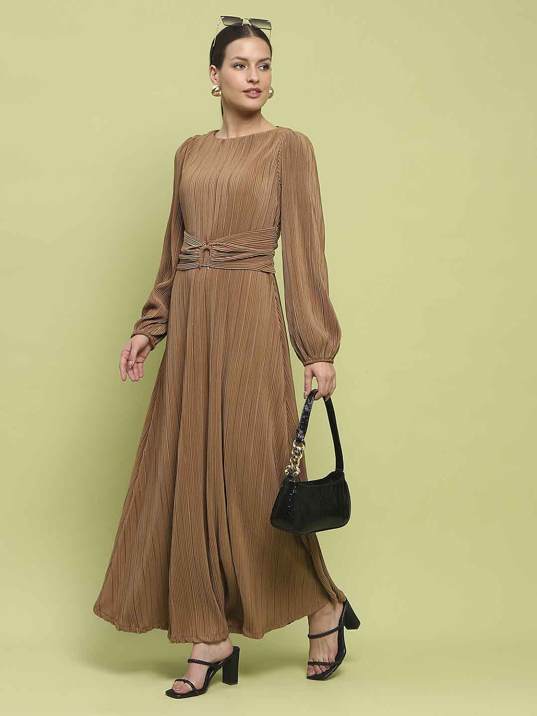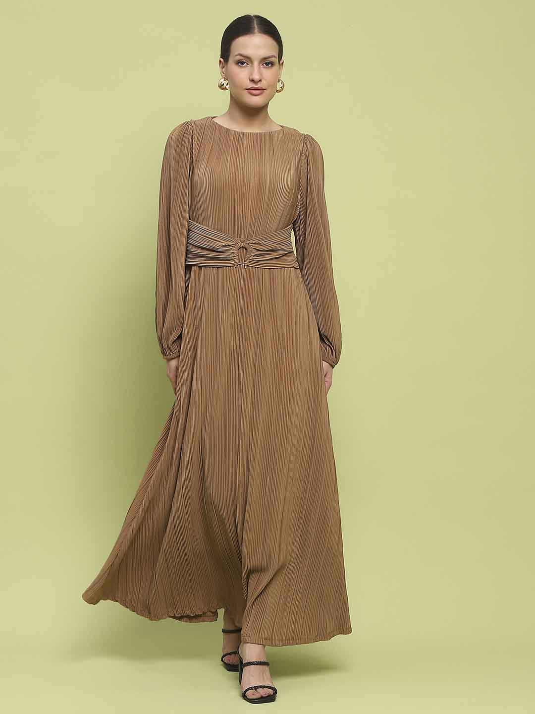 Madame Pleated Front Buckle Detailed Solid Golden Maxi Dress