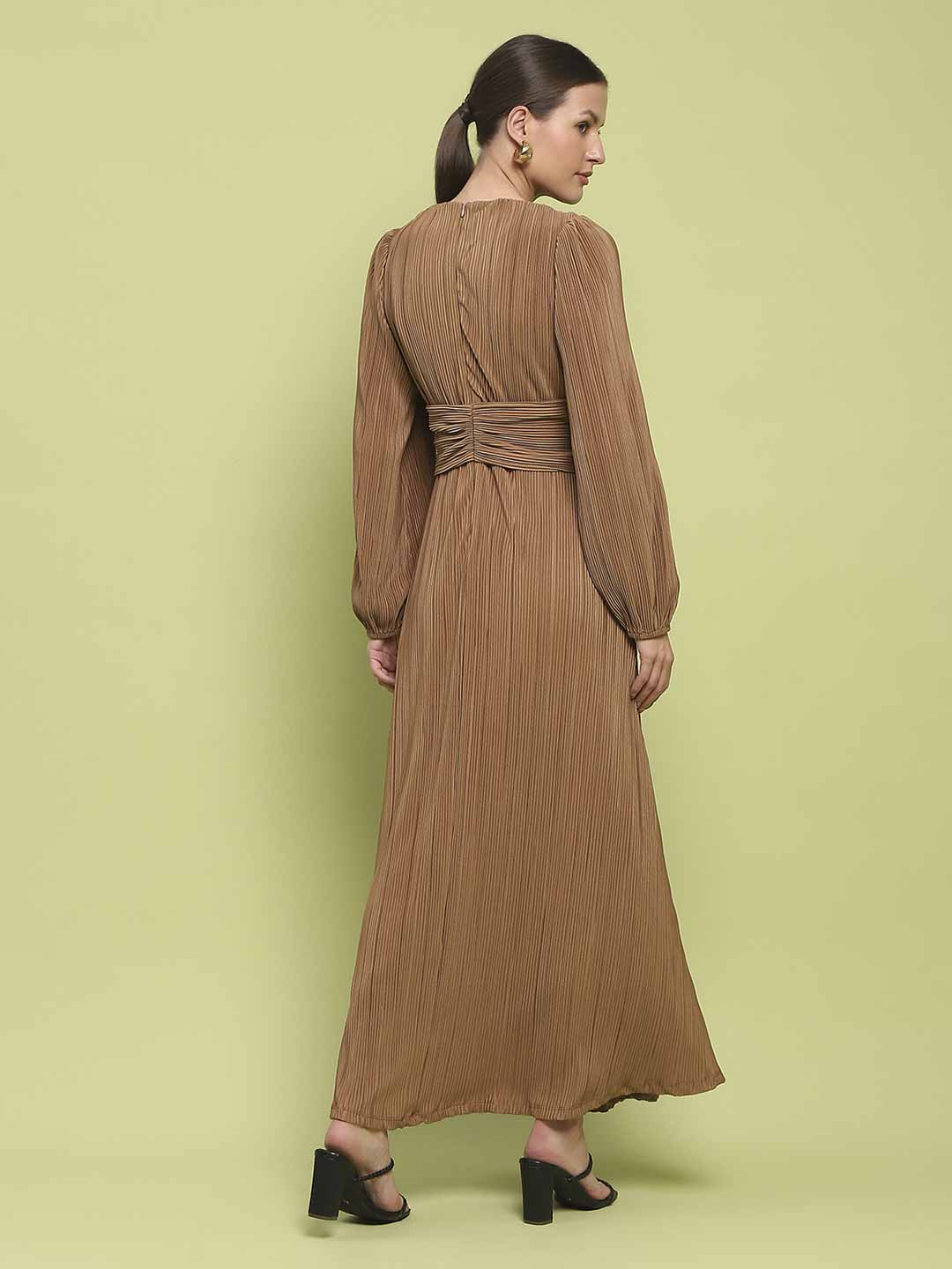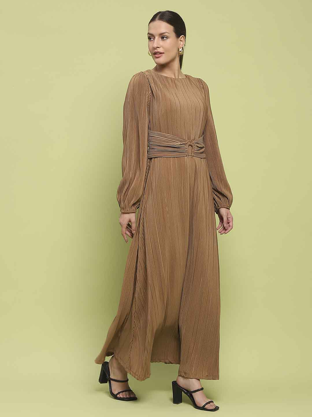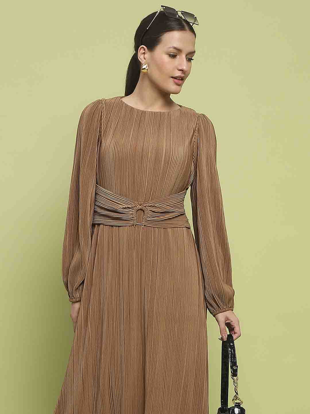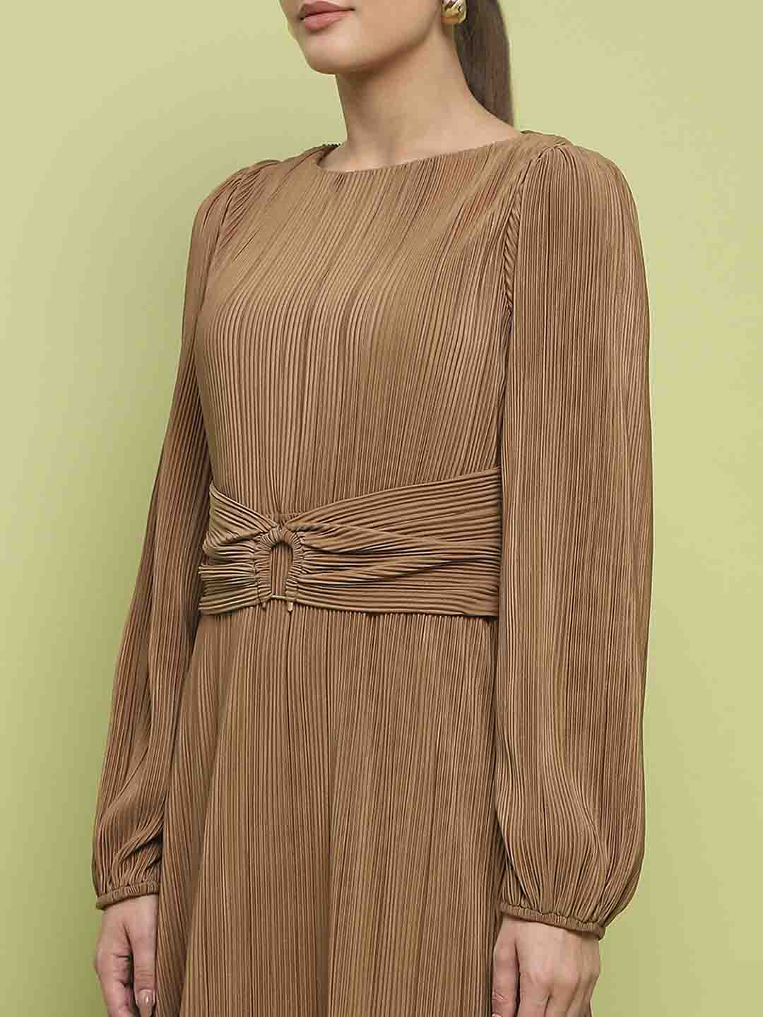 Madame Pleated Front Buckle Detailed Solid Golden Maxi Dress