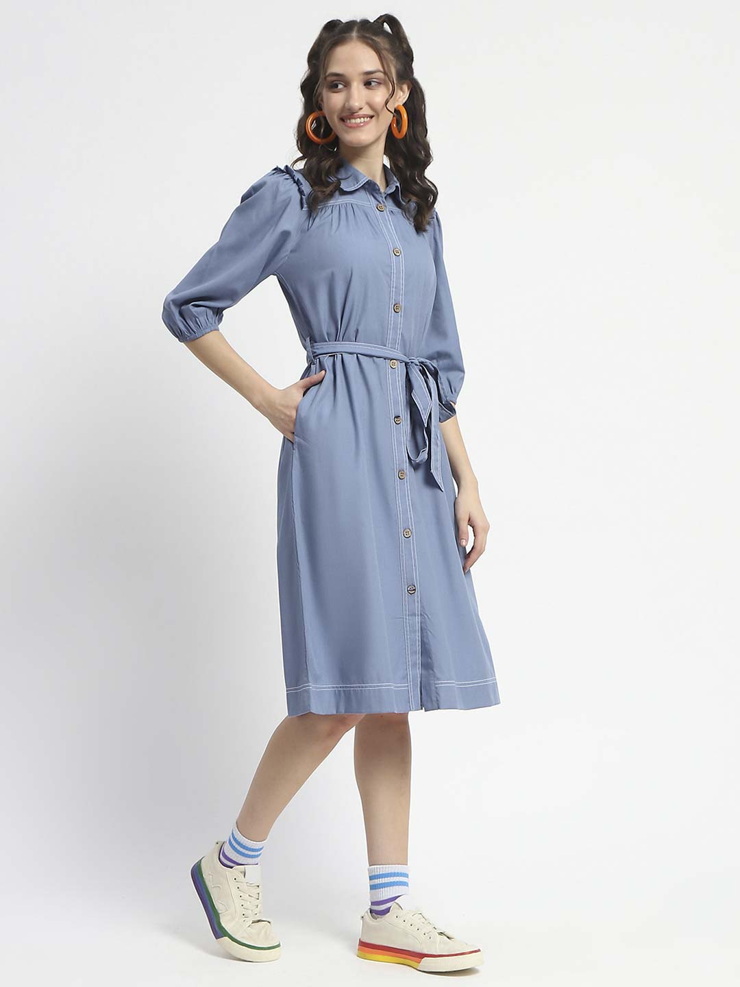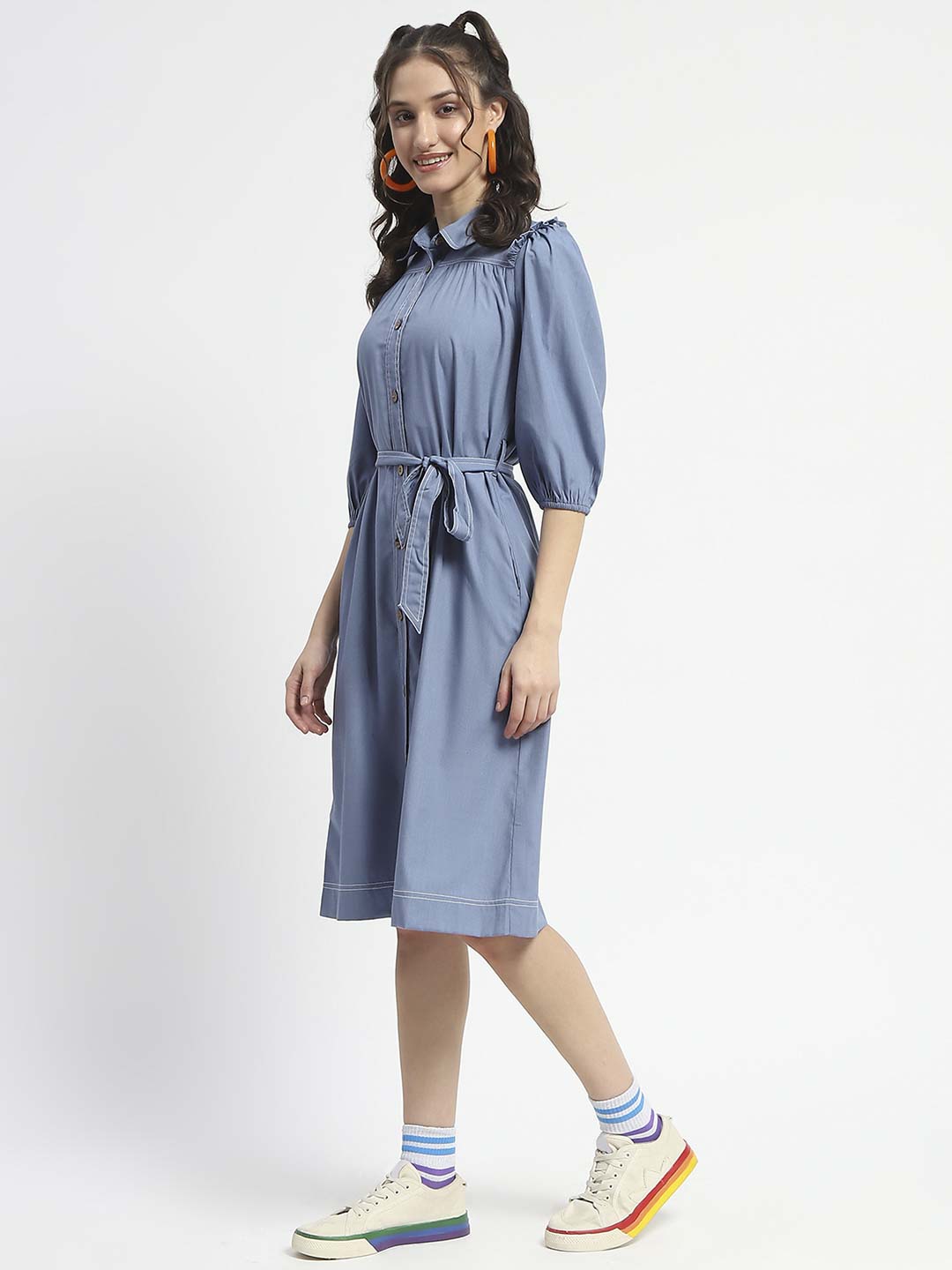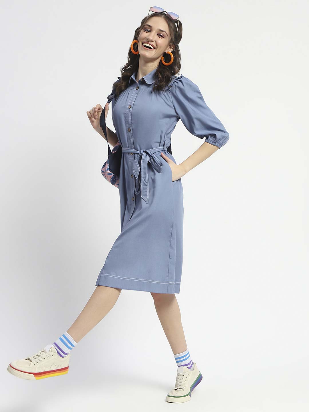 Madame Cotton Blend Belted Waist Blue Midi Shirt Dress