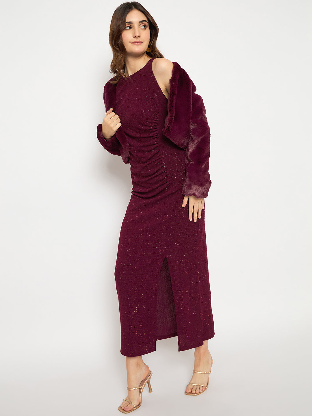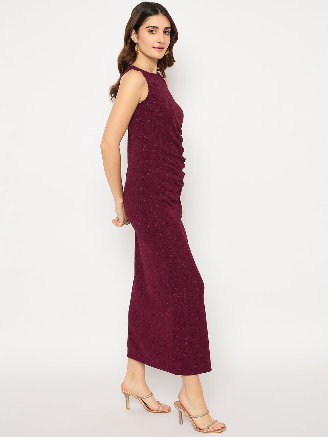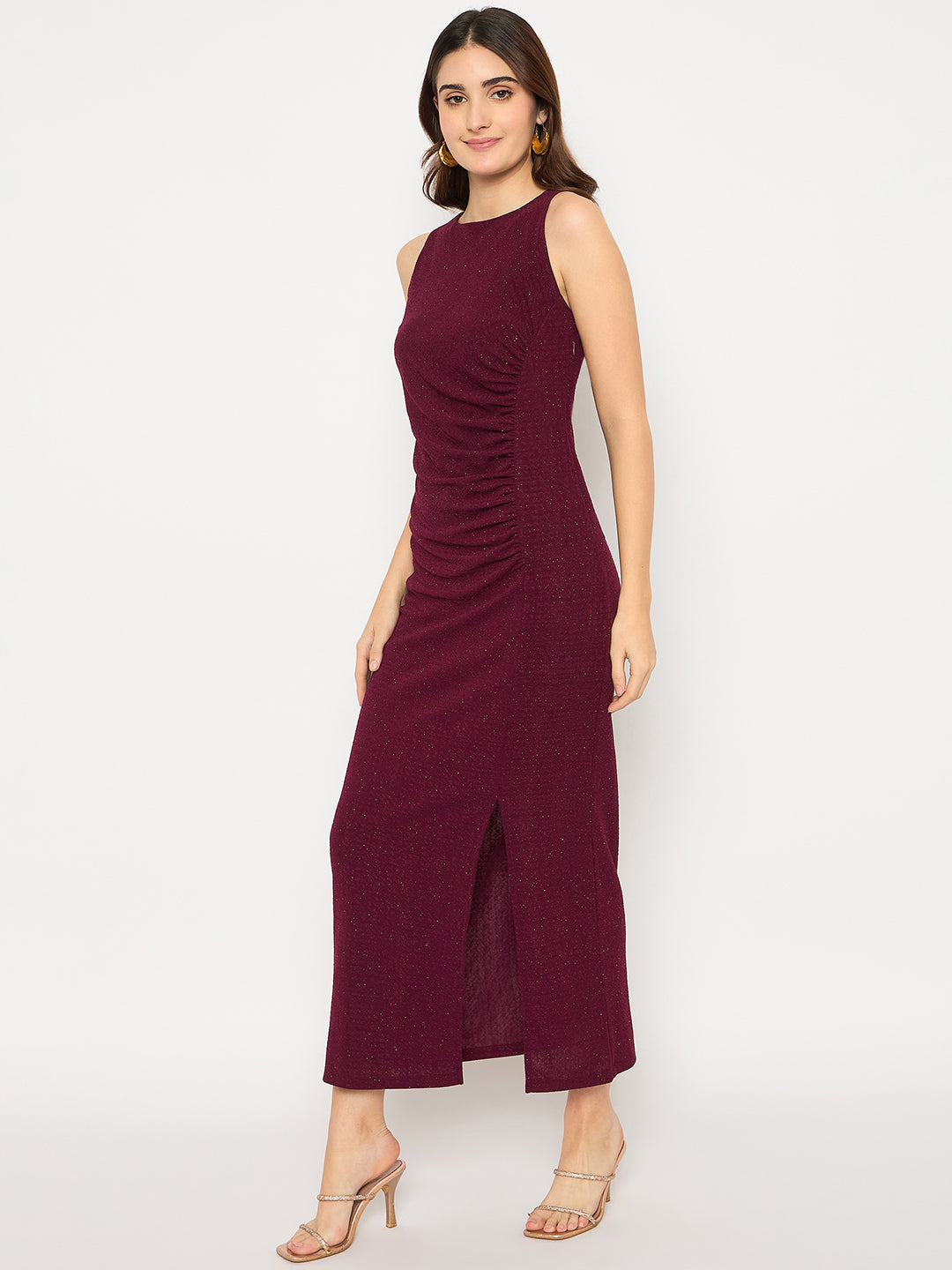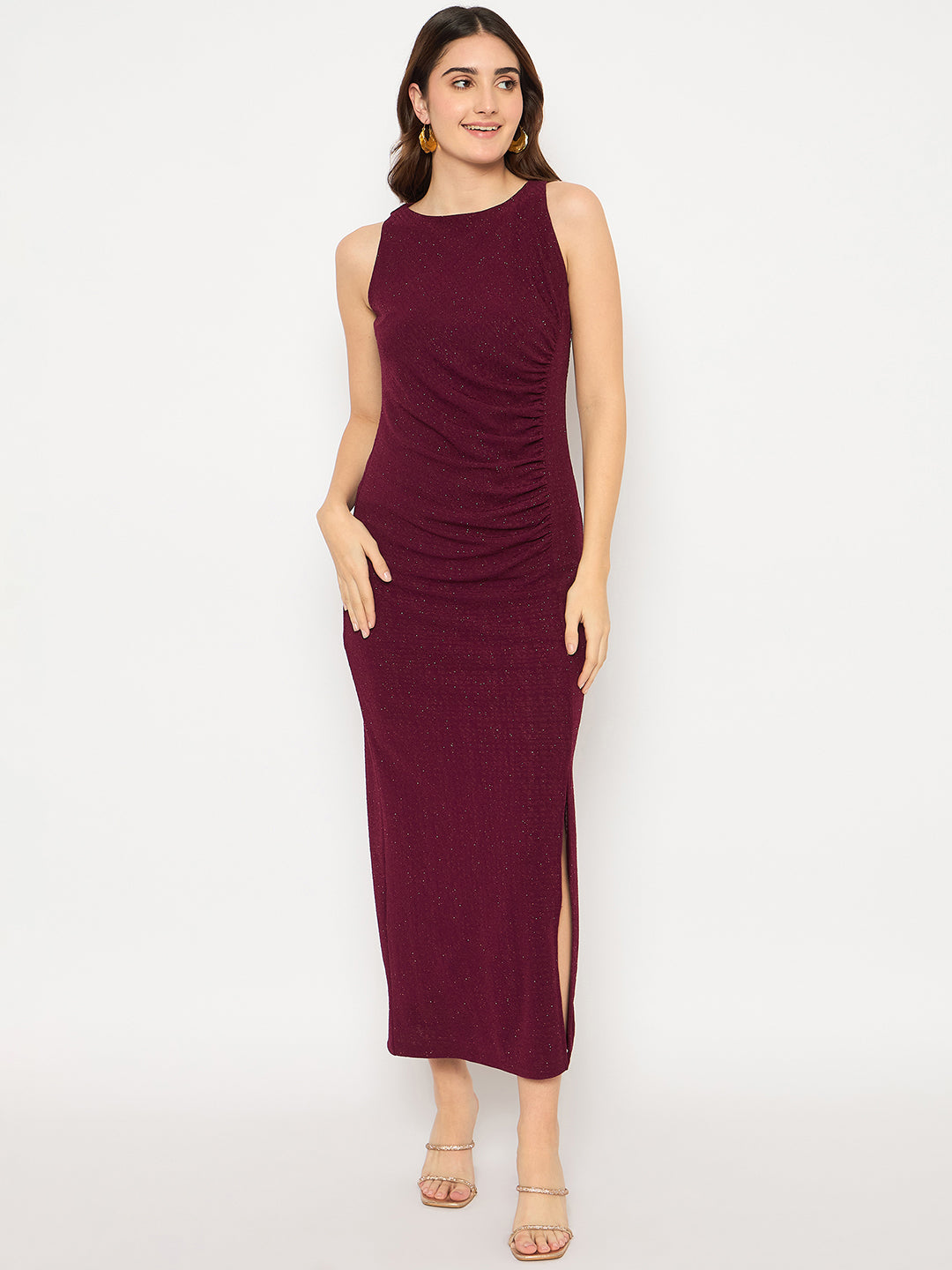 Madame Shanaya Kapoor Shimmery Gathered Detail Bodycon Wine Maxi Dress