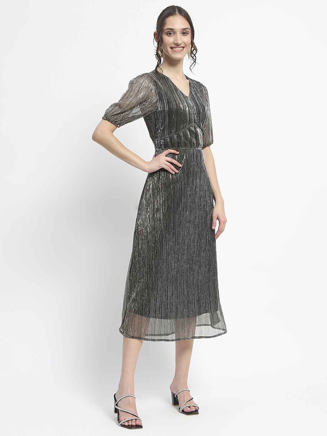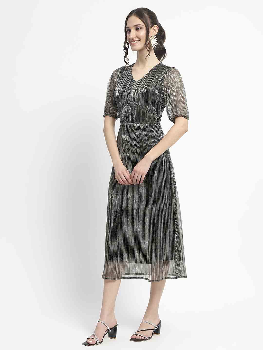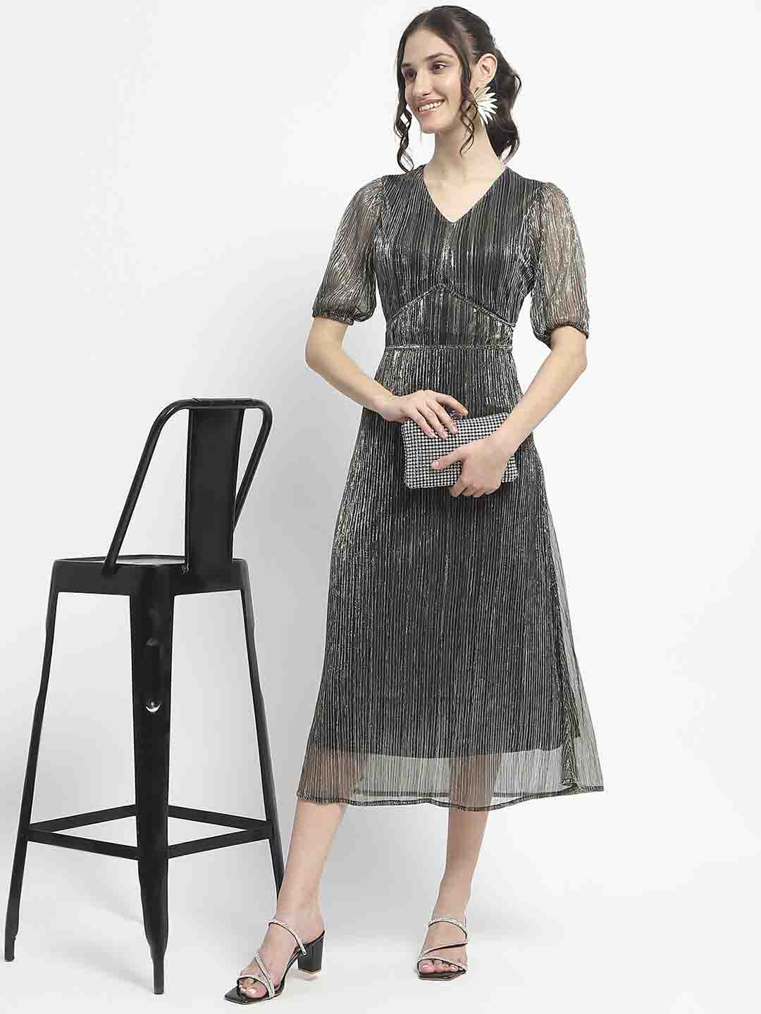 Madame Shimmery Corset Detailed Puff Sleeved Black Midi Dress