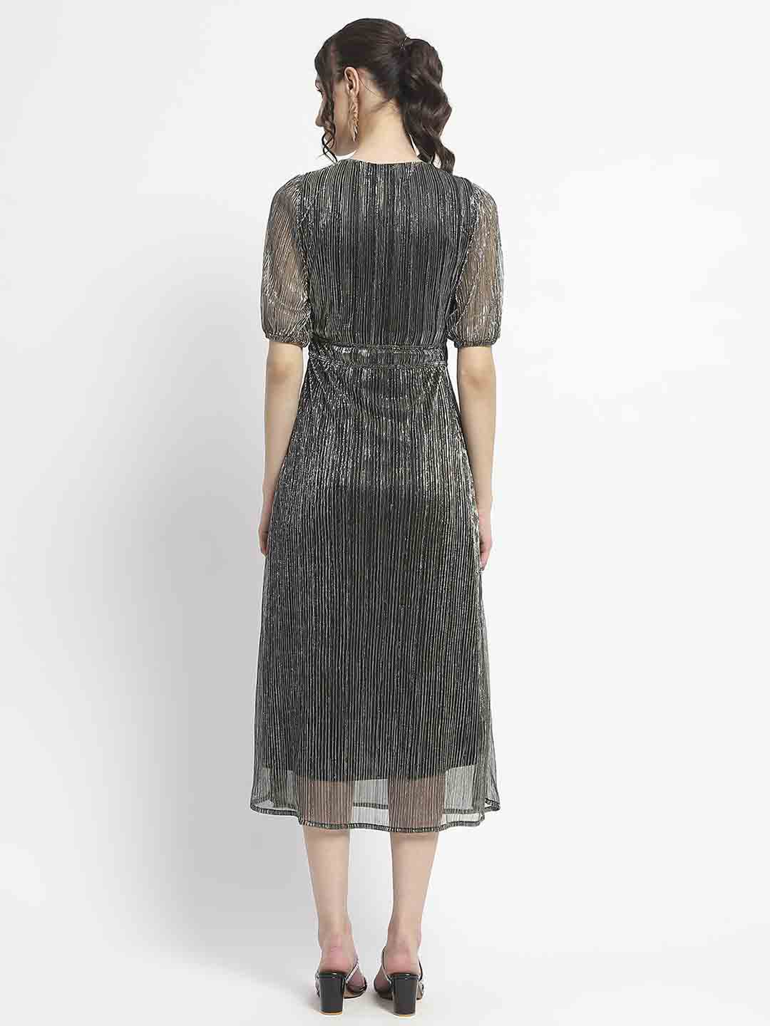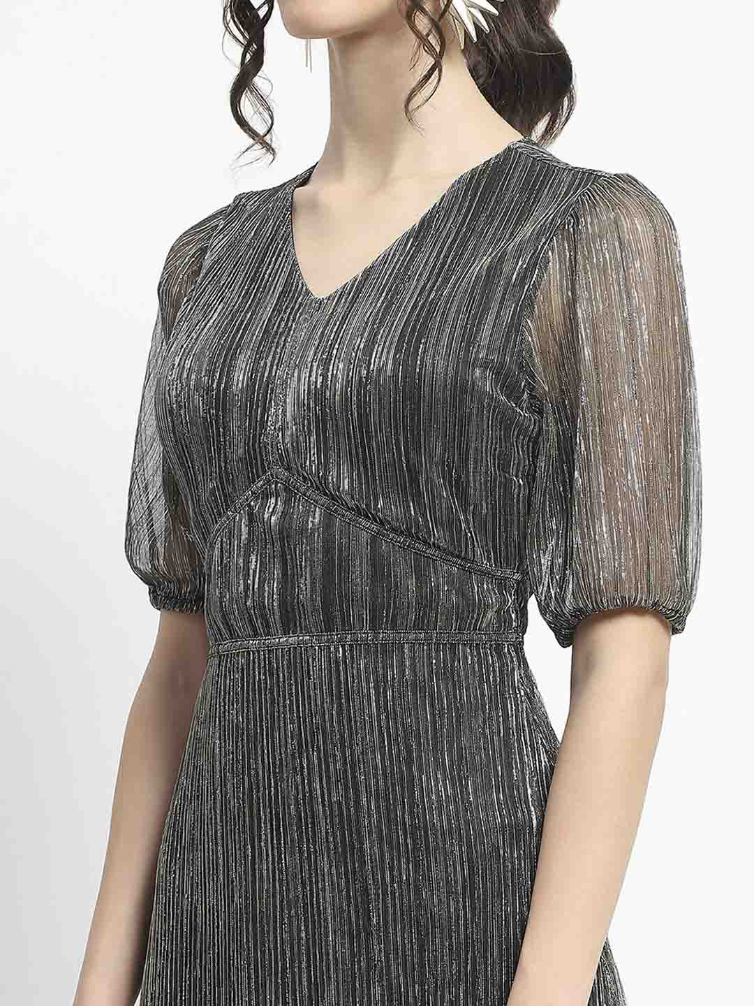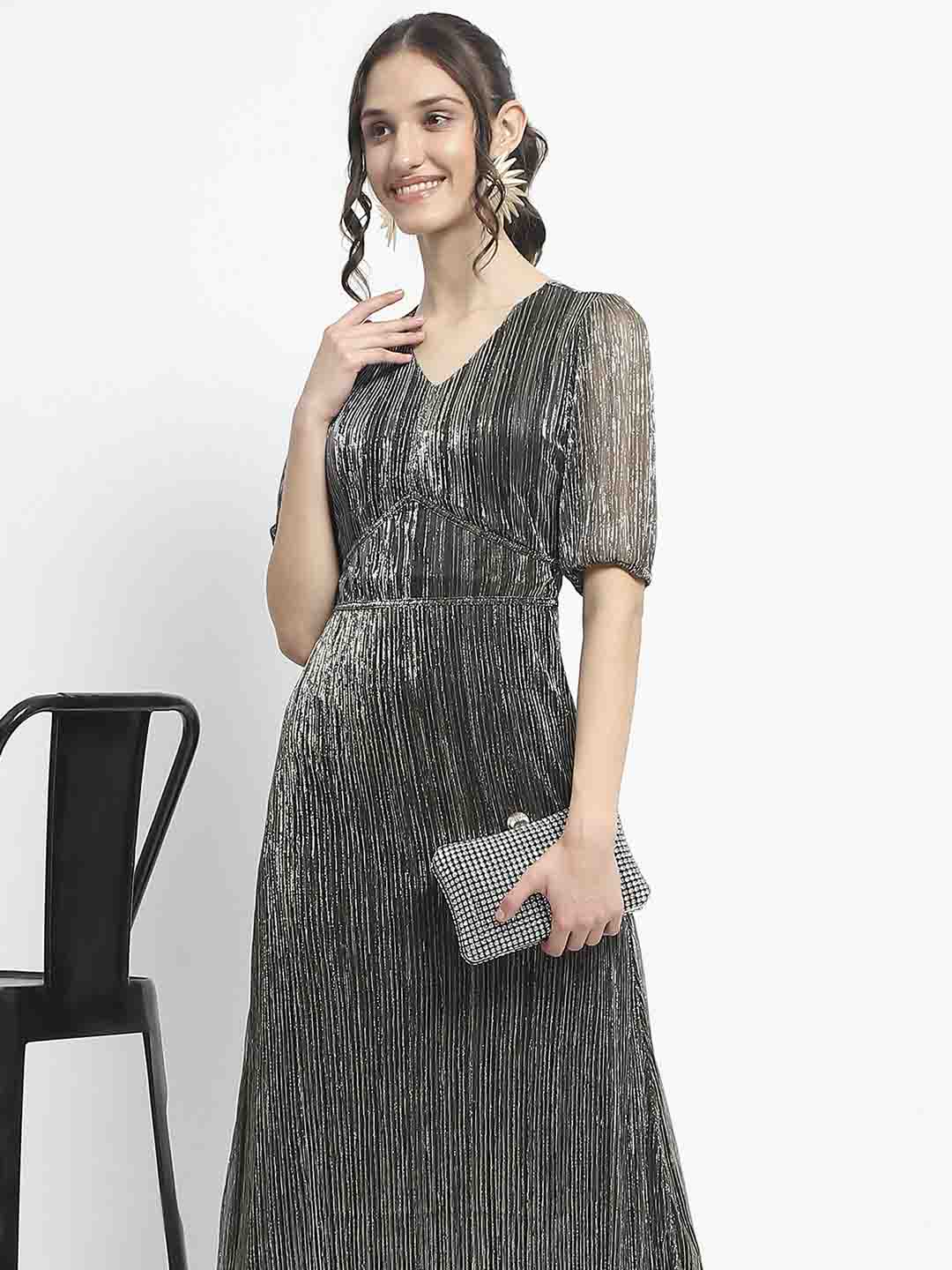 Madame Shimmery Corset Detailed Puff Sleeved Black Midi Dress