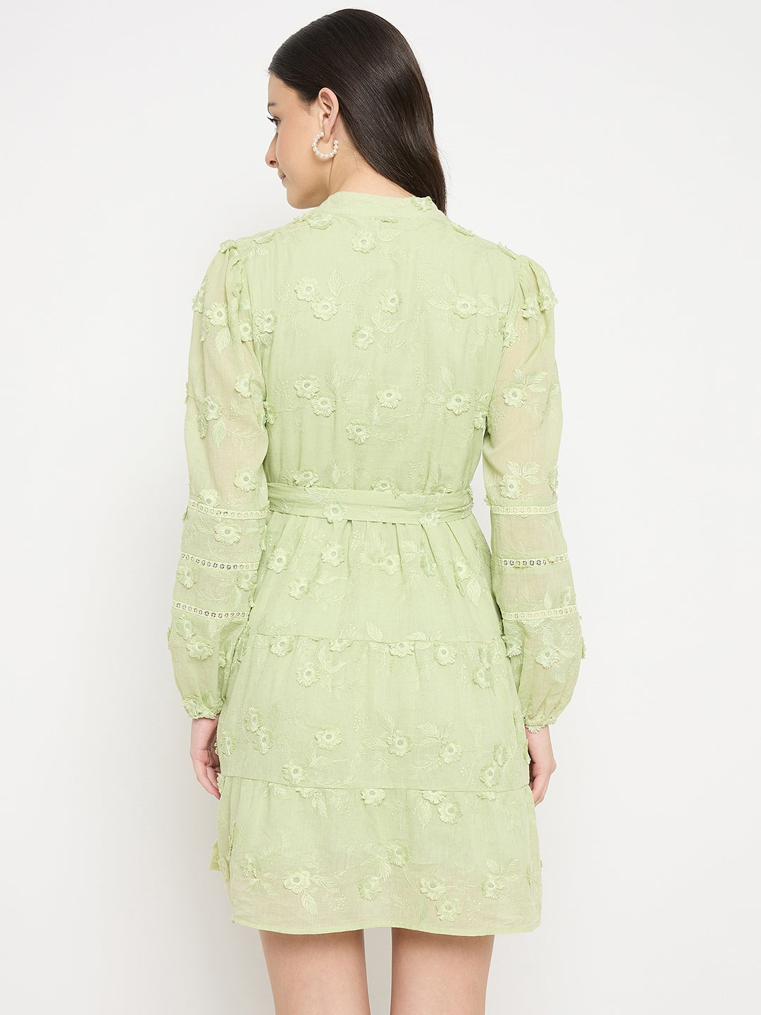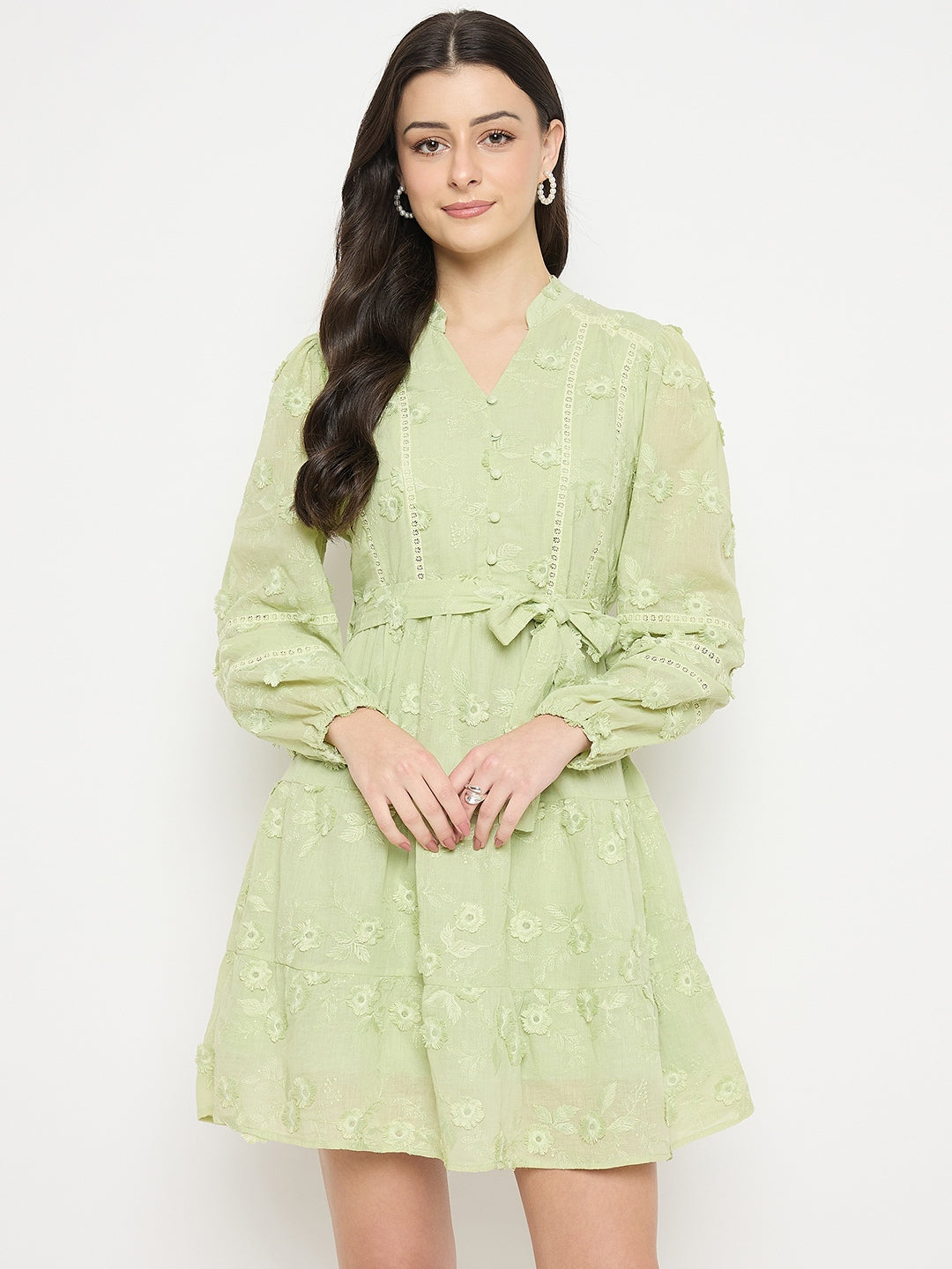 This soft sage green dress is adorned with delicate tonal floral texture and features a subtle V-neck with voluminous sleeves for an elegant finish. The flattering tie-up waist enhances the silhouette, while the relaxed fit ensures all-day comfort. Perfect for brunches, workdays, and casual outings.