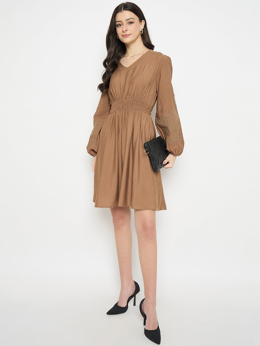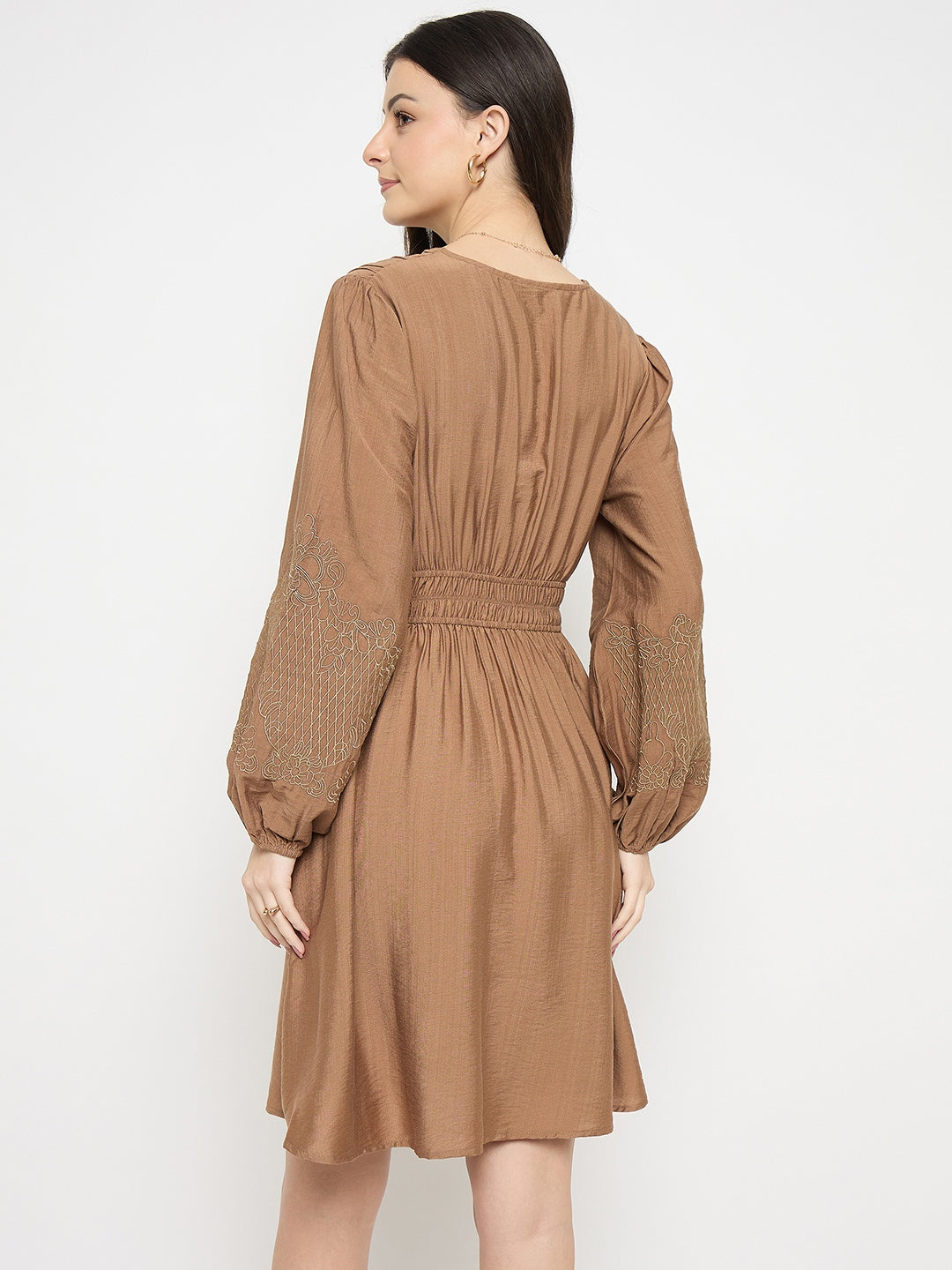 This Brown Bodycon Dress by Madame is designed to flatter. Made with a blend of Rayon and Nylon, it features a V-neck and long embroidered sleeves. The bodycon fit offers a modern silhouette, perfect for a night out or a statement daytime look.