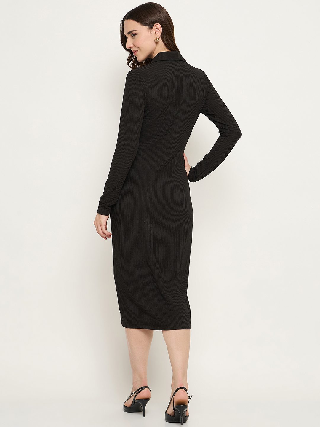 Sleek, refined, and effortlessly flattering — the Madame Button Down Black Bodycon Midi Dress is designed to accentuate your natural silhouette with understated elegance. Featuring a classic button-down front and a sculpted bodycon fit, this midi dress brings timeless charm to your wardrobe. Perfect for dinners, date nights, or elevated everyday dressing.