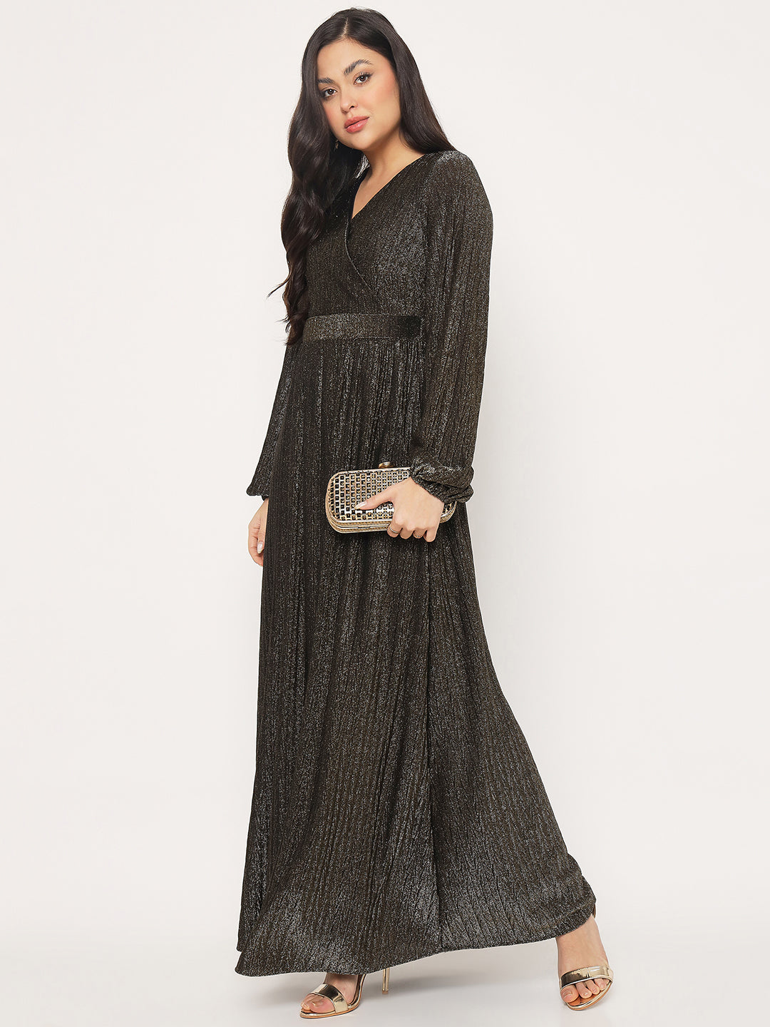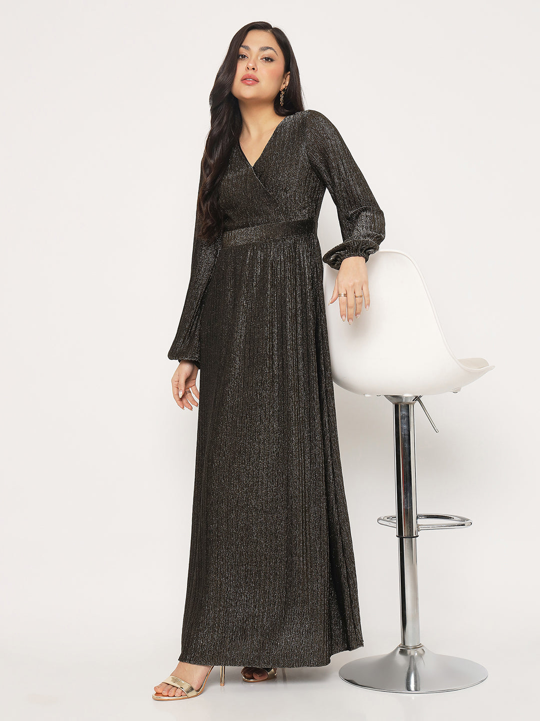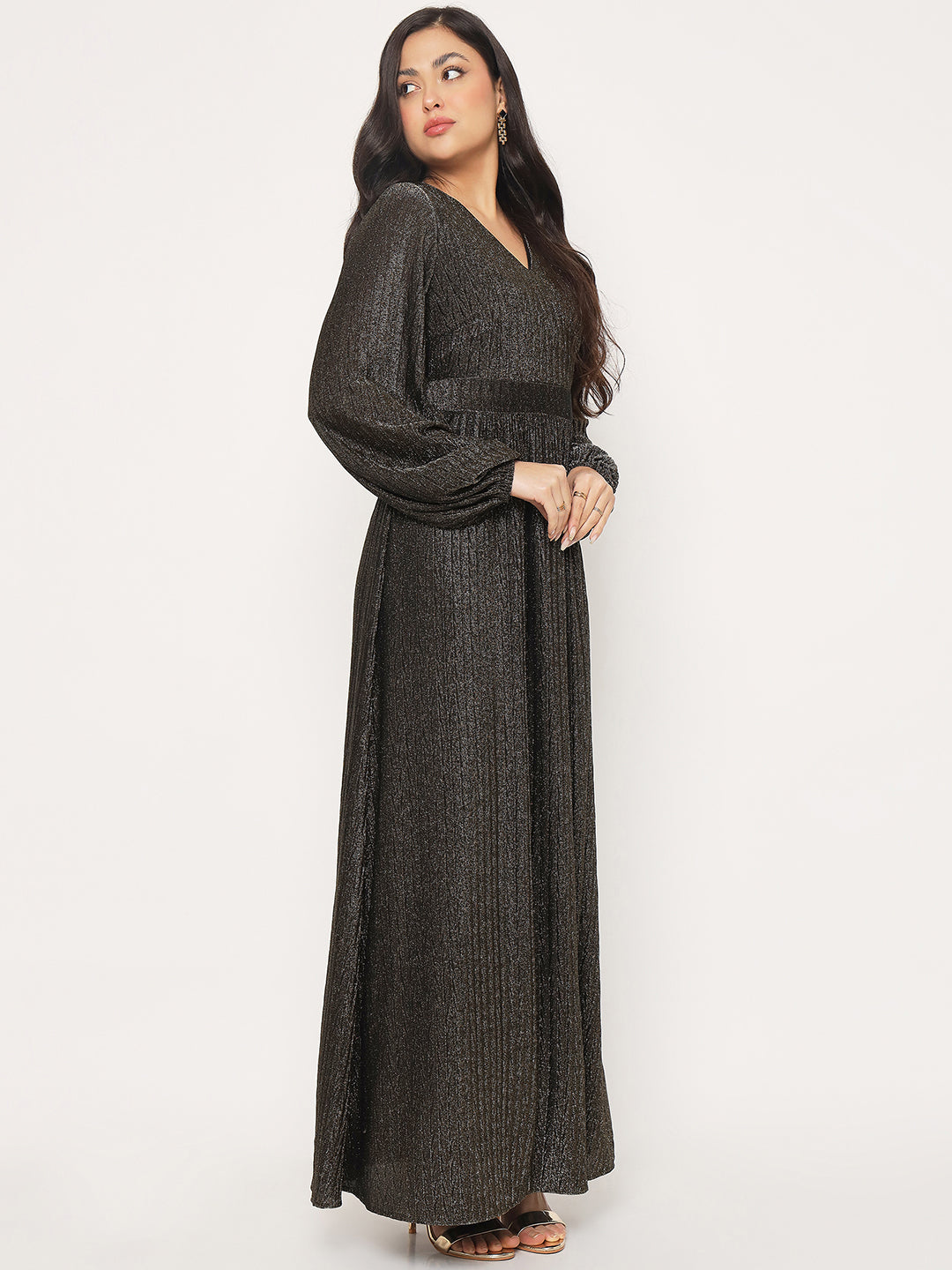 All eyes on you. This golden fit-and-flare maxi dress blends a flattering V-neck with statement puffed sleeves for a look that feels festive, feminine, and fashion-forward. Style it with heels and minimal jewellery for maximum impact.