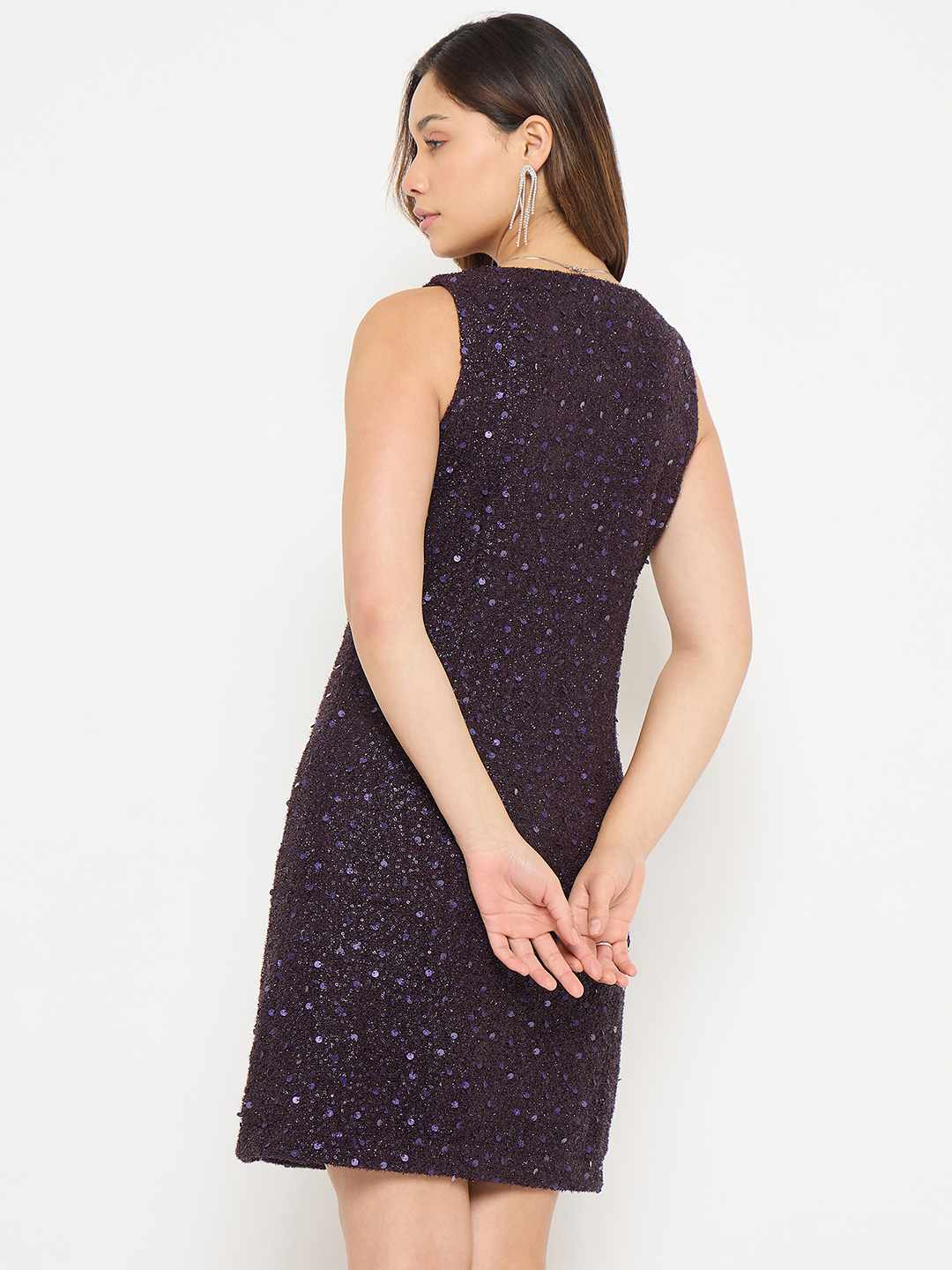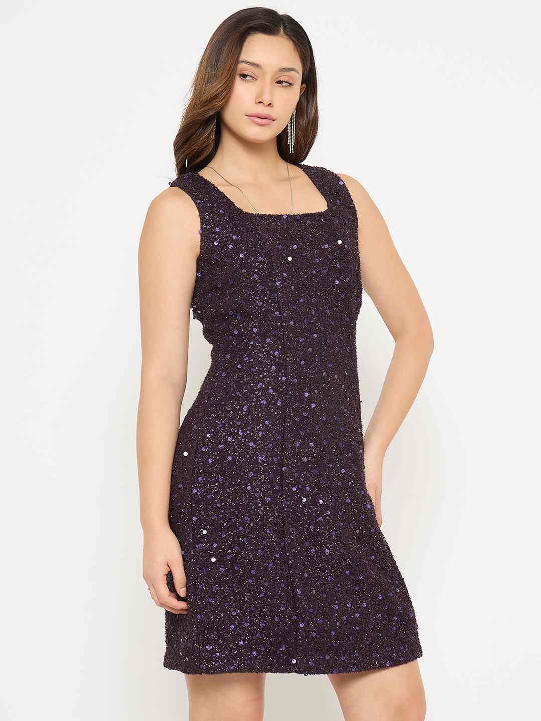 Make a statement with this shimmery purple sheath dress from Madame. Featuring a flattering square neckline and a sleek silhouette, it combines elegance with contemporary style. Crafted from soft, high-quality fabric with a subtle shimmer, this dress is perfect for parties, evening events, or any occasion where you want to shine.