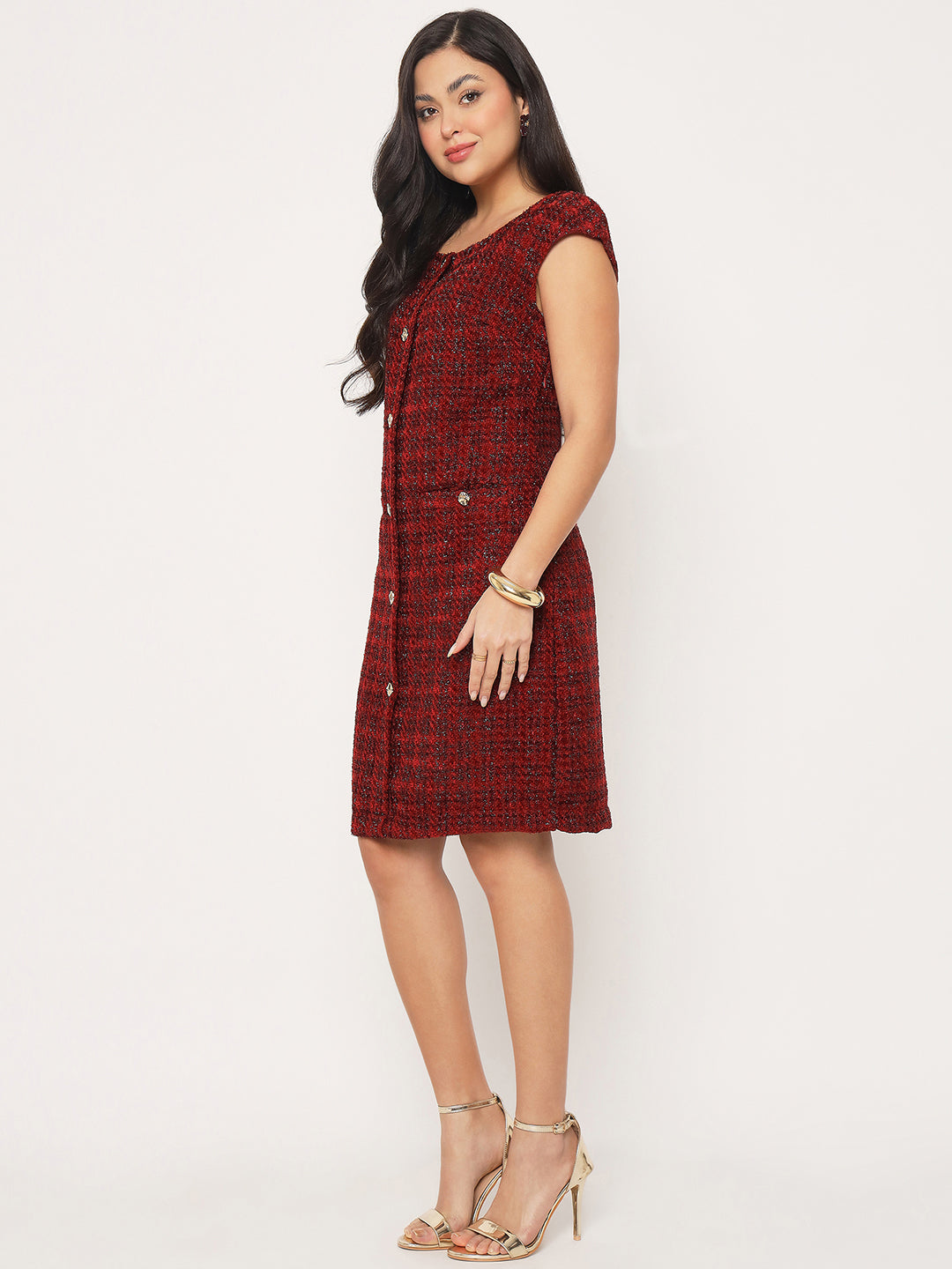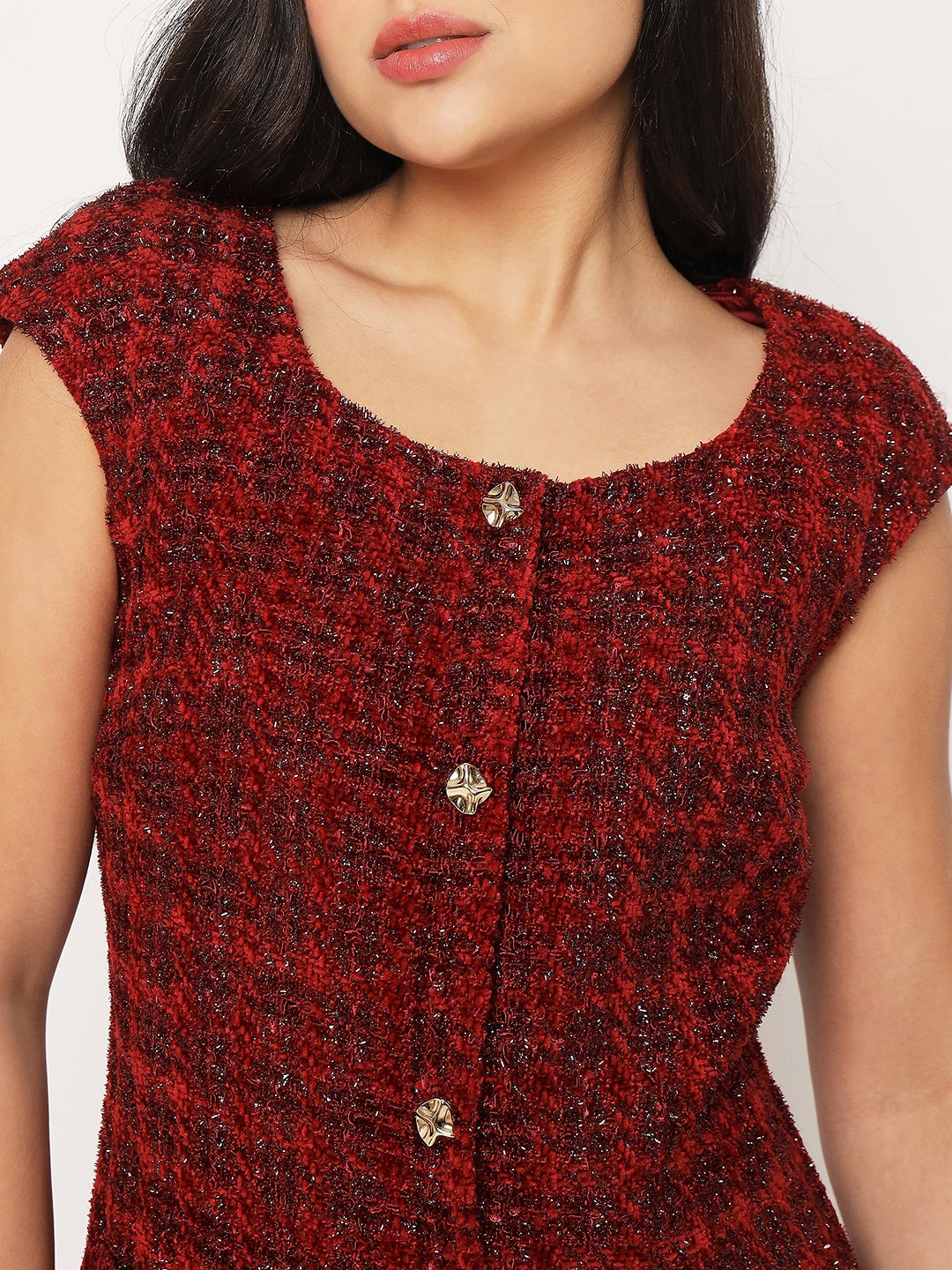 Minimal yet striking, this sleeveless maroon sheath dress stands out with its textured jacquard fabric. Perfect for when you want to keep it classy but impactful a just add heels and statement earrings.