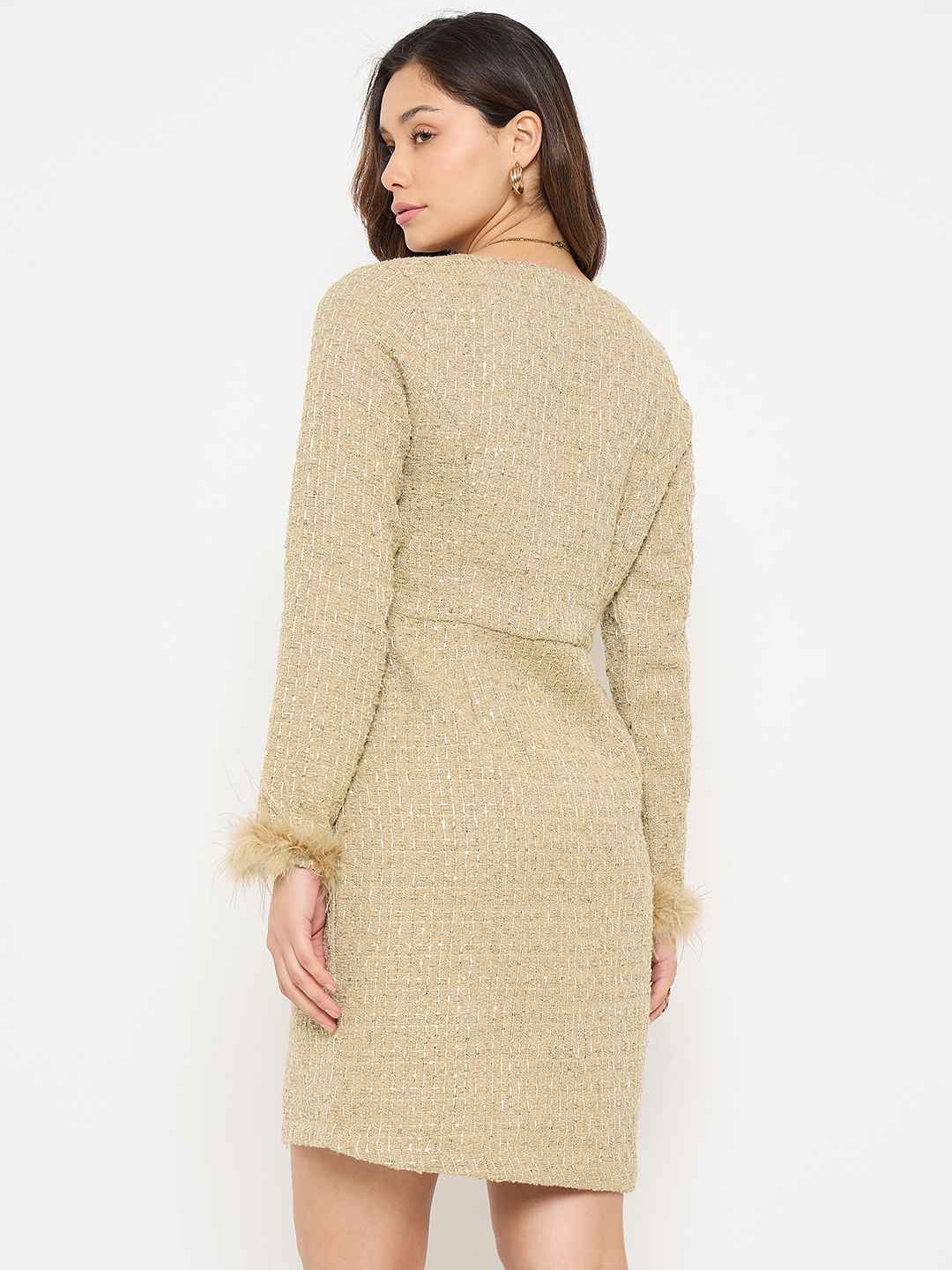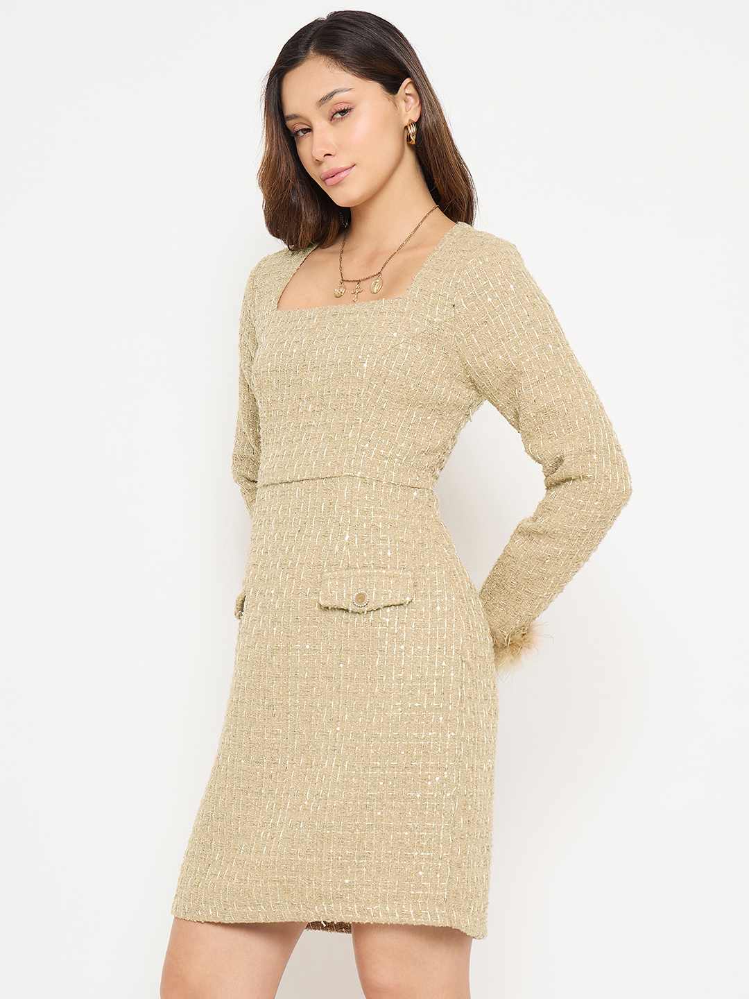 Turn heads in this elegant beige bodycon dress from Madame. Featuring a flattering square neckline and dramatic feather-trimmed sleeves, it combines chic sophistication with playful glamour. Crafted from soft, high-quality fabric, this dress is perfect for evening events, parties, or any occasion where you want to make a stylish statement.