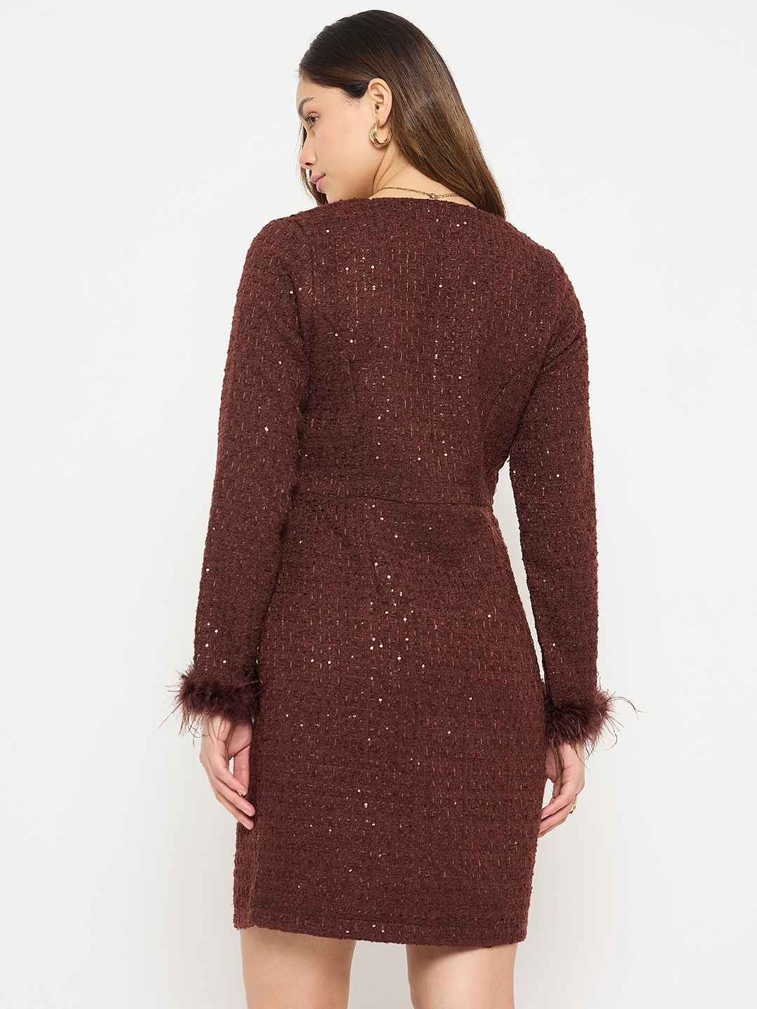 Make a stylish statement with this brown bodycon dress from Madame. Featuring a figure-flattering silhouette and dramatic feather-trimmed sleeves, it combines elegance with a touch of playful glamour. Crafted from soft, high-quality fabric, this dress is perfect for evening events, parties, or any occasion where you want to stand out.
