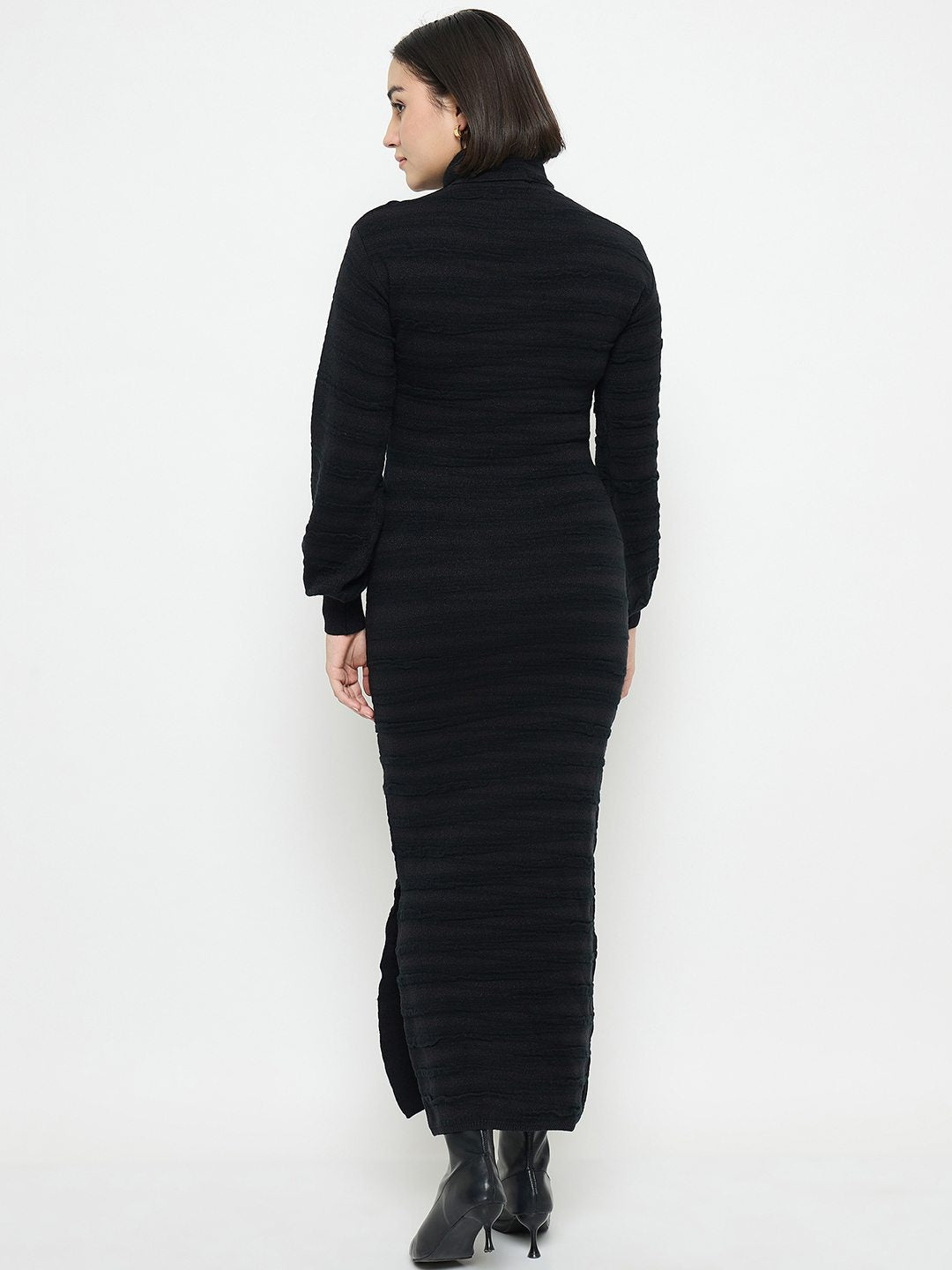 Effortless sophistication meets comfort in the Madame High Neck Black Knitted Midi Dress. Designed with a flattering high neckline and soft, stretchable knit fabric, this midi dress drapes elegantly while accentuating your silhouette. Ideal for dinners, evening outings, or polished daytime styling.