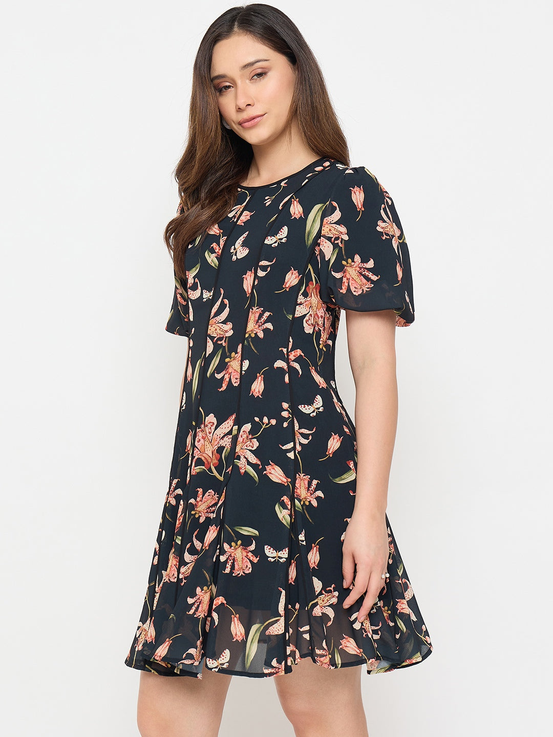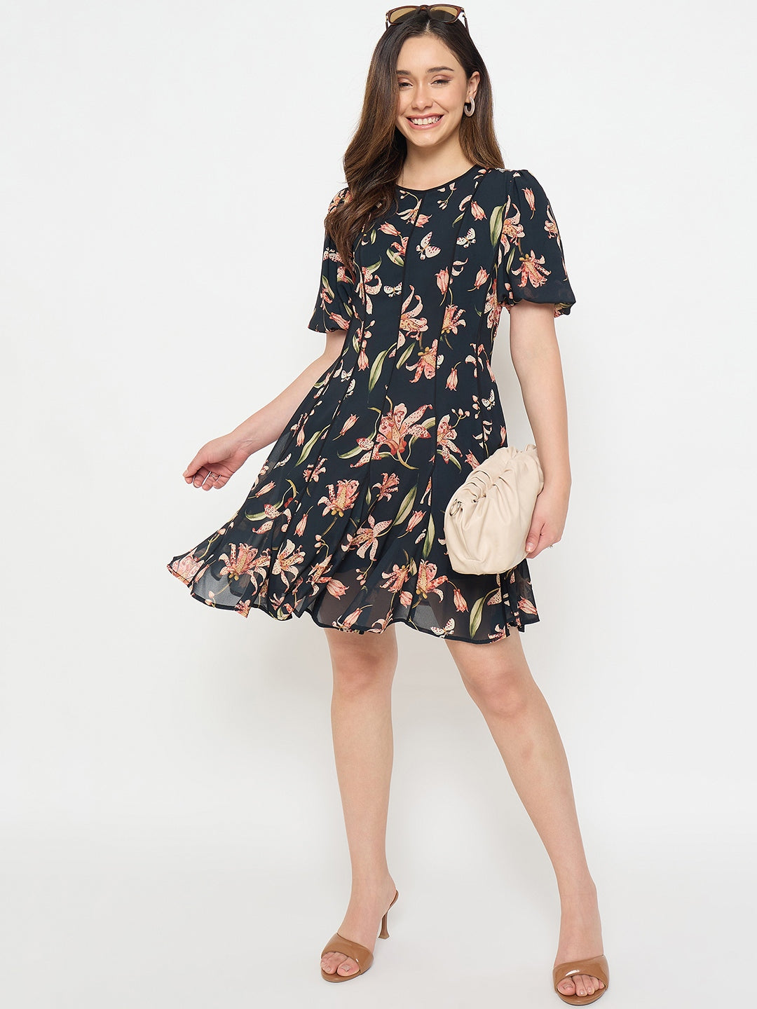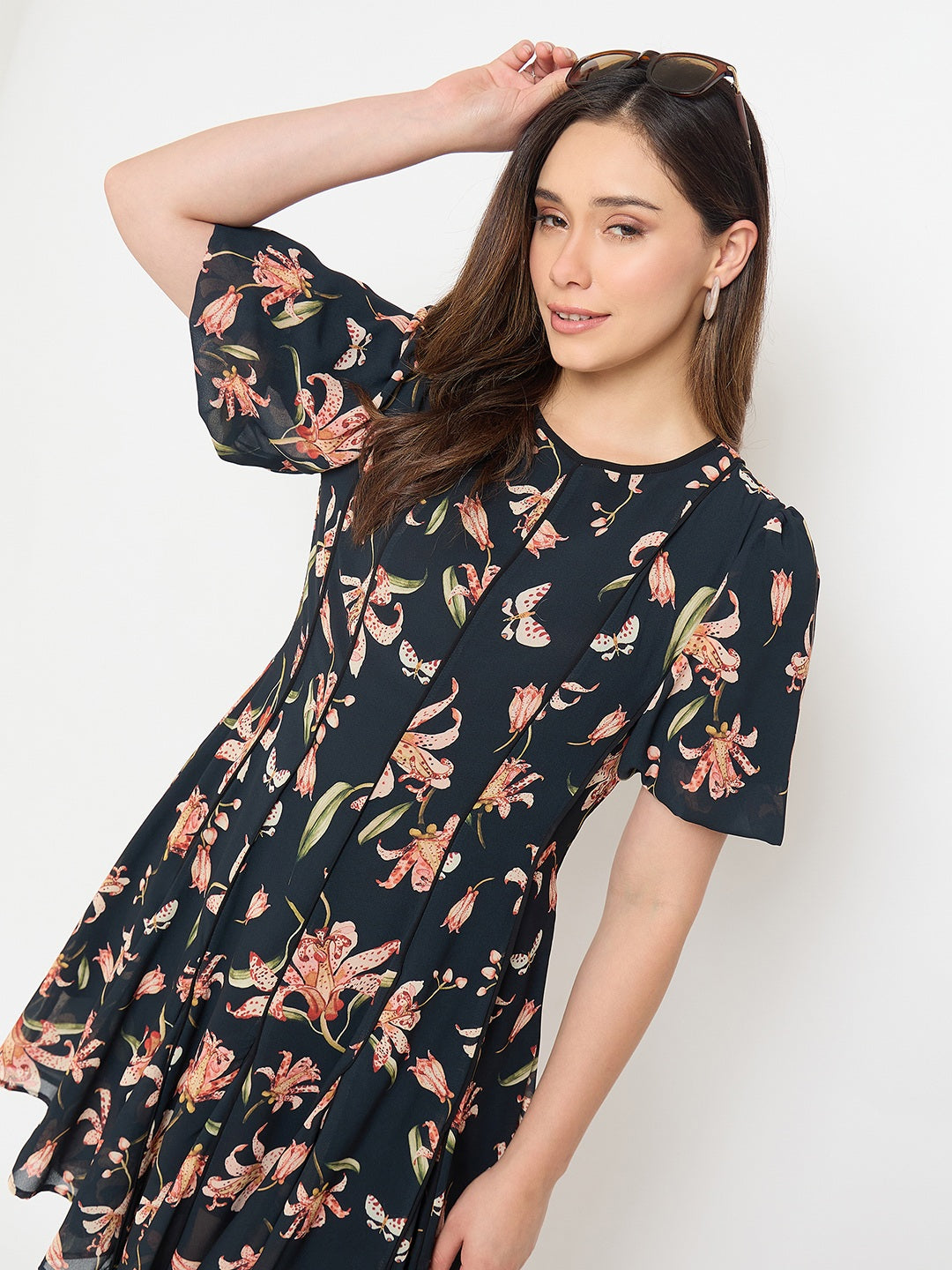 An elegant Black Flared Midi Dress by Madame. Constructed in a flowy drape, this dress features a V-neck and short sleeves. The flared fit ensures a flattering and comfortable silhouette, suitable for various occasions.