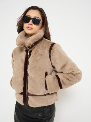 Madame Faux Fur Trim Brown Jacket with Contrast Seams